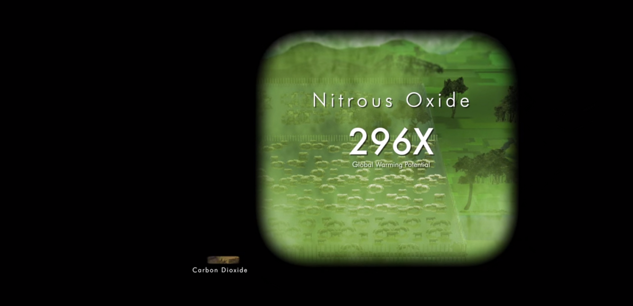 전 세계의 아산화질소(지구 온난화에 끼치는 영향이 이산화탄소보다 296배가 높은 물질) 65%가 축산업에서 배출된다. 출처: ⟨카우스피라시(2014)⟩