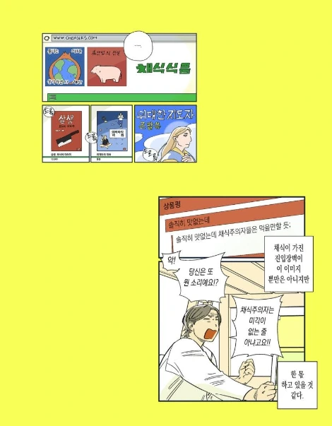 개인적으로 등장인물 중 두연이 채식으로 새롭게 알게된 친구인 ‘유지나’에게 가장 공감이 간다. 환경 문제에 관심이 많은 지나씨는 비육식이 환경 문제 해소에 기여할 수 있기에 동물성 식품 섭취를 줄여나가기 시작한 인물이다. 그 밖에도 어린이집의 휴원으로 회사에 자녀를 데려올 수밖에 없었던 과장님, 식비에 대한 걱정으로 채식을 고려하는 직장 동료 등 현실적인 등장인물 설정 또한 우리에게 생각할 거리를 던져준다. 웹툰 시즌 1에서 동물권을 주요하게 다루었다면 현재 연재 중인 시즌 2에서는 전염병, 농・축산업으로 인한 환경 문제 등 채식과 직간접적으로 관련 있는 문제들을 거시적인 관점으로 다루며 이 상황을 바꾸기 위한 방안을 흥미롭게 그린다.