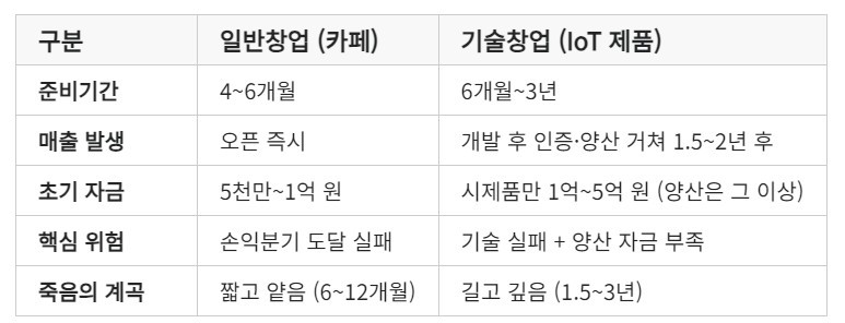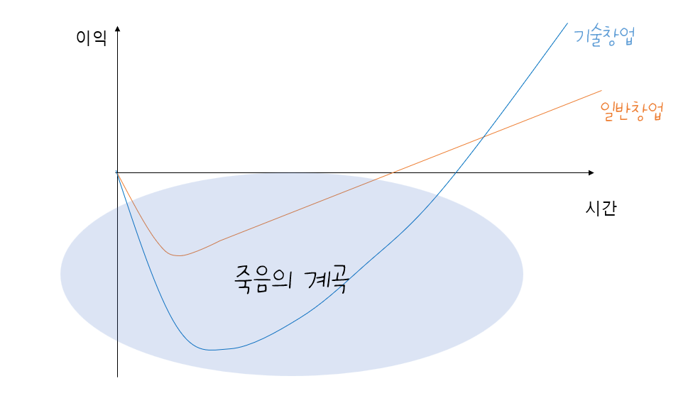일반창업도 초기 자금난이 있지만, 기술창업은 이 계곡이 훨씬 길고 깊어요.