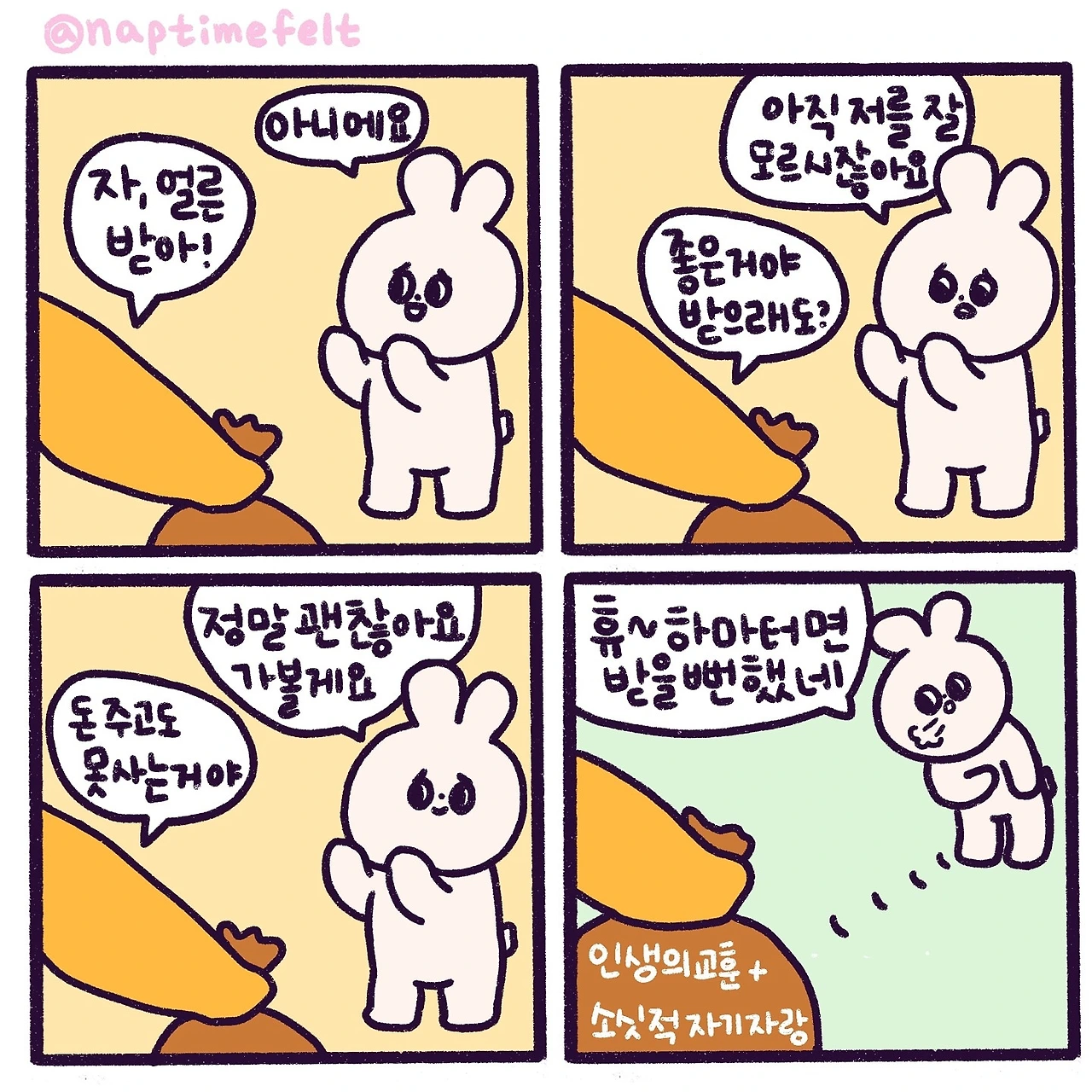 언제나 재미있는 일을 추구하는 저는 현재 유튜브 채널 '낮잠시간펠트'에서 스톱모션 애니메이션을, 인스타그램에서는 '밍기적 토끼' 일상 힐링 카툰을 연재하고 있습니다.