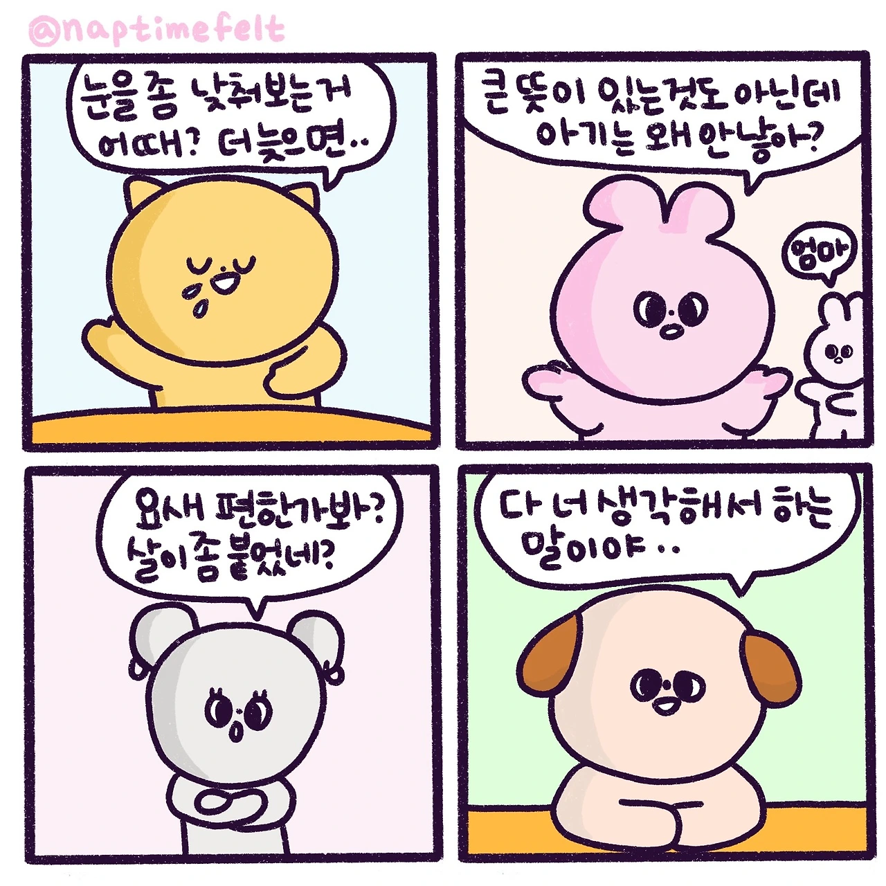 언제나 재미있는 일을 추구하는 저는 현재 유튜브 채널 '낮잠시간펠트'에서 스톱모션 애니메이션을, 인스타그램에서는 '밍기적 토끼' 일상 힐링 카툰을 연재하고 있습니다.