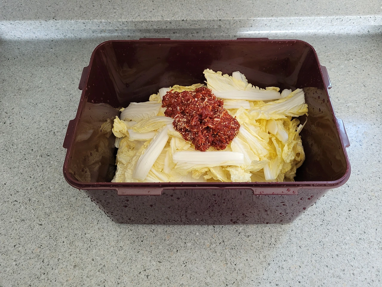 김치냉장고의 김치통에 알배기 배추를 다듬고 씻고 소금에 절였다. 어느 정도 절여진 알배기 배추를 씻어 물기를 뺀 다음 미리 만들어둔 양념을 넣어 무쳐 주었다.