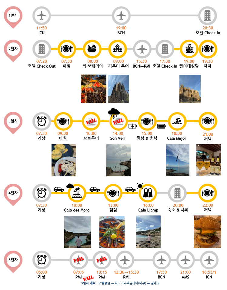 2주에 한 번 주말에 근무해야 하는 남편인지라 우리에게 주어진 시간은 단 7일이었는데, 회사 복귀 전 하루는 반드시 쉬고 싶다는 남편의 호소에 4박 6일로 바르셀로나 여행을 계획했다. 사실 둘 다 건축, 예술, 역사에 관심이 없어서 바르셀로나 보단 에메랄드 빛 바다로 둘러쌓인 마요르카에서 휴양을 즐기고 싶었다. 그래서 결정한 바르셀로나 1박, 마요르카 3박. 대신 바르셀로나에 머무는 1일차, 2일차, 5일차는 아주 빡빡하게 일정을 짰다. 급하게 준비한 여행치고 계획은 완벽했다.