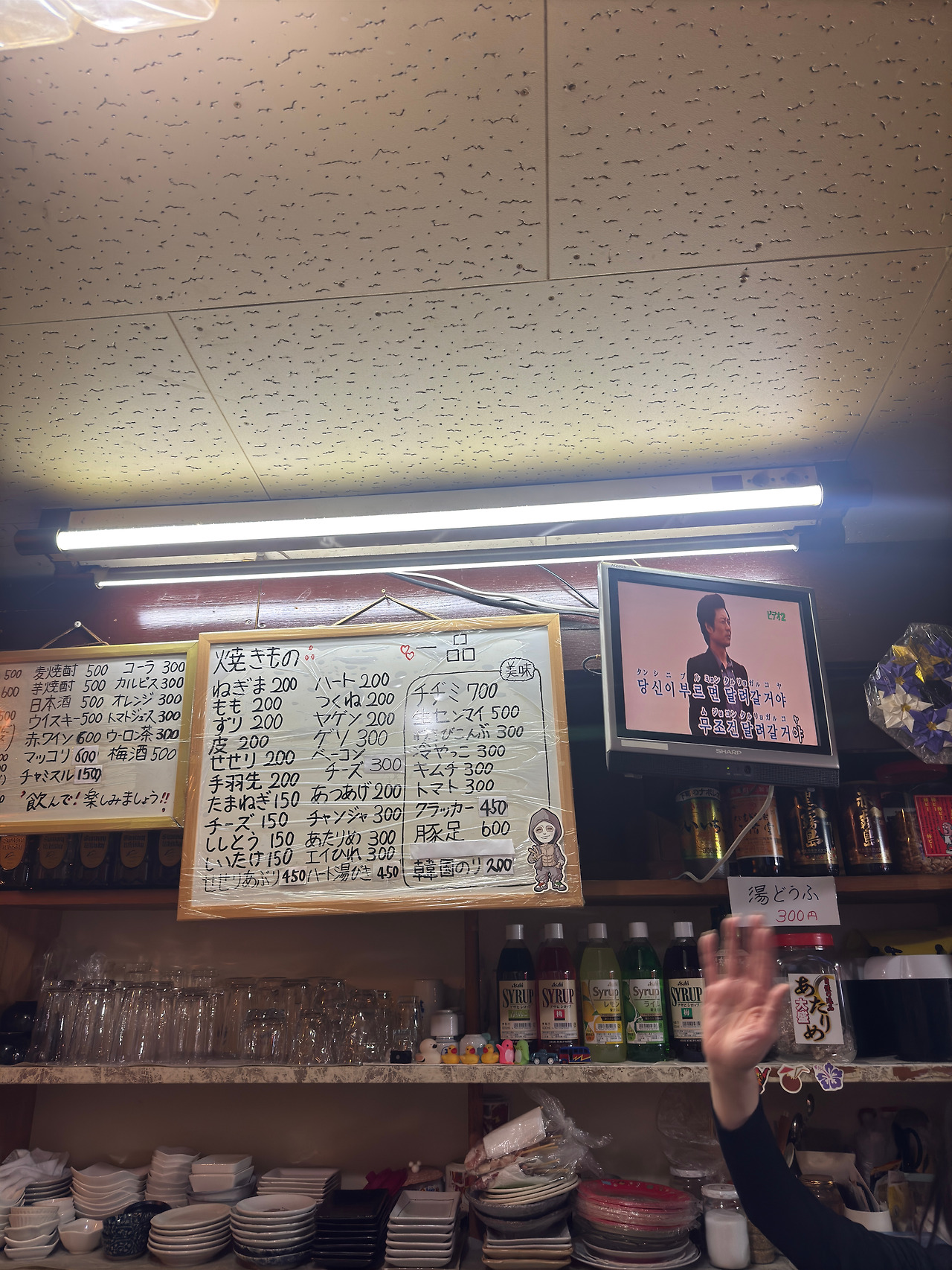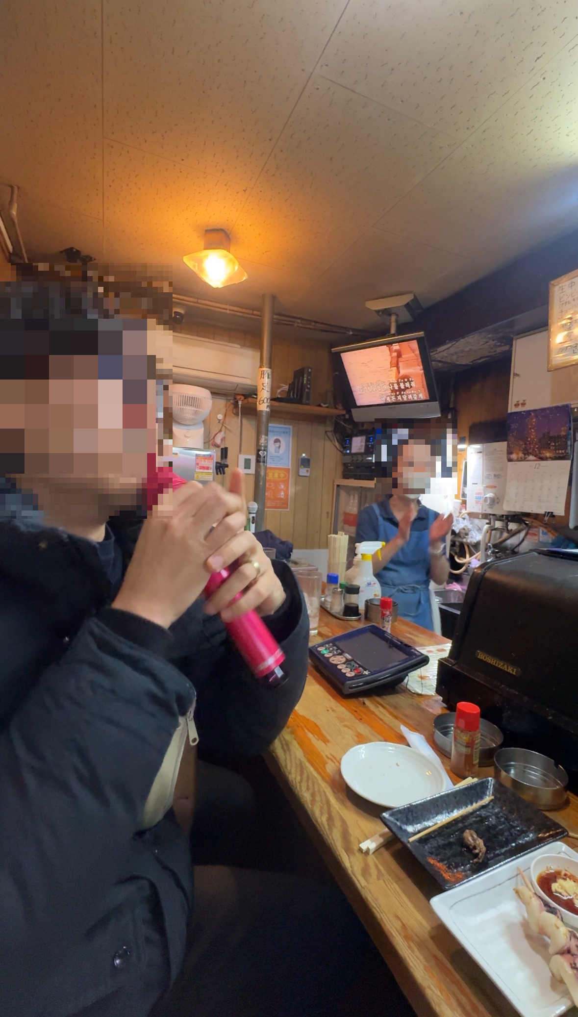 소화시킬 겸 돈키호테(신세카이점)에서 과자 쇼핑을 하고, 숙소로 돌아오는 길 또 다시 만난 잔잔요코초(먹거리 시장). 남편이 눈으로 찜해놓은 야키토리 가게인데 우리 왼쪽엔 국제커플 2명, 오른쪽엔 현지 단골 손님 4명으로 가게가 가득 찼다. 역시나 남편은 하이볼, 나는 맥주를 주문했다. 그리고 갑자기 시작된 노래방.