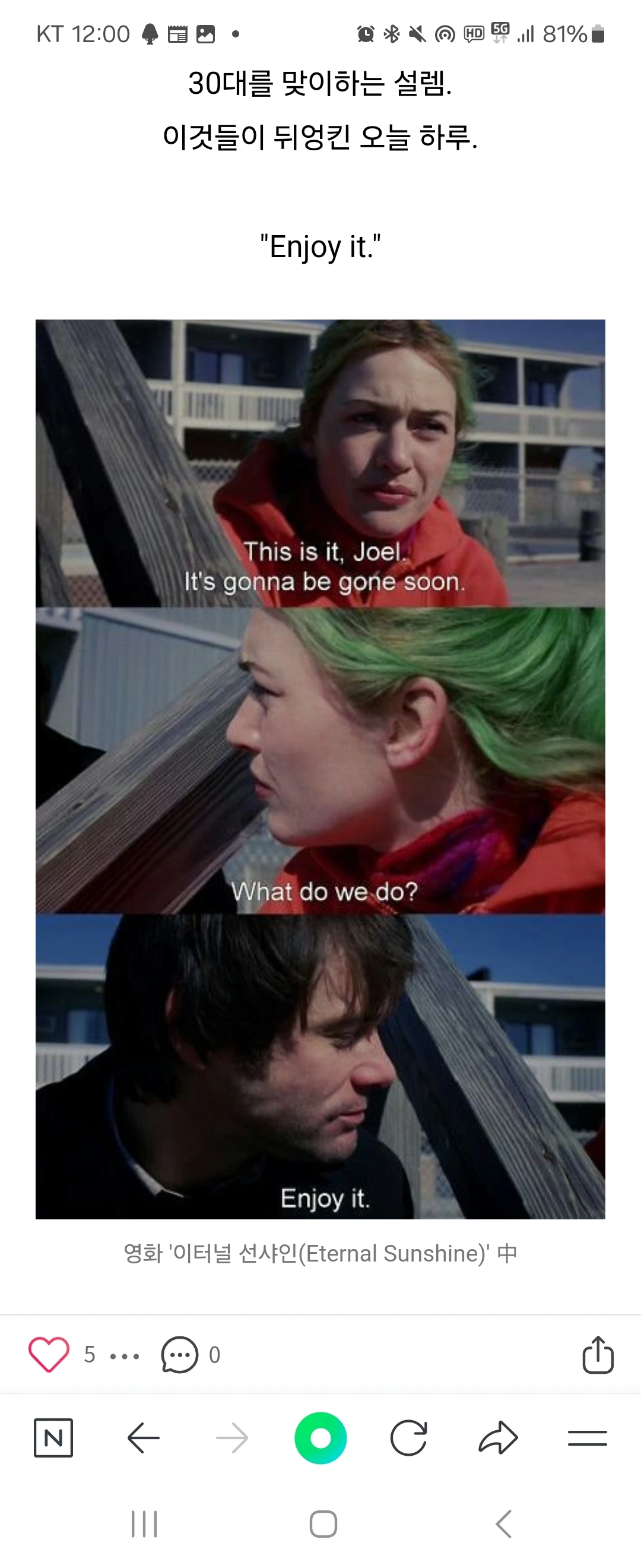 수술하기 전 난 이터널 선샤인은 그저 잘 만든 사랑 이야기라고 생각했다. 마지막 두 주인공의 okey 장면은 내 눈물샘을 자극했었다.