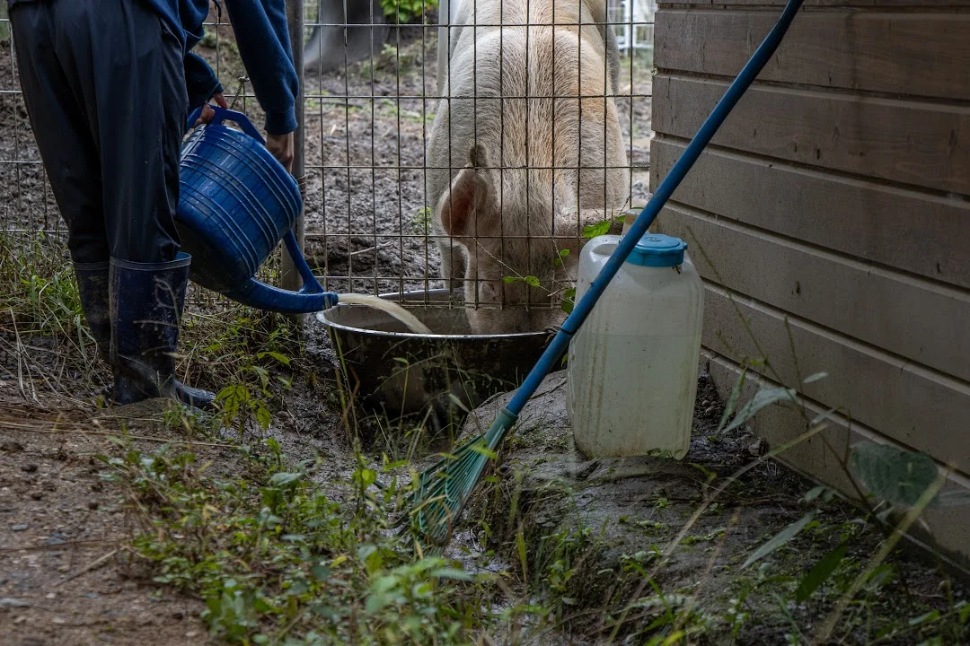 돌봄 하우스에 뛰어들듯이 들어가 장화로 갈아 신는다. 아직 일어나지 않은 잔디와 차 소리를 듣고 집에서 나온 새벽의 밥그릇을 양손에 든다. 척-척 큰 보폭으로 잔디 집부터, 밥그릇을 순서대로 울타리 아래 틈으로 슬라이딩시킨다. 그리고서는 새들의 밥이다. 사람 밥그릇에 곡식과 사료, 잘게 썬 채소를 겹쳐 올리고 오리의 밥은 물에 잠기게 해서, 닭의 밥은 물그릇을 따로 해서 앞으로 대령하면 밥 주기는 끝이 난다.