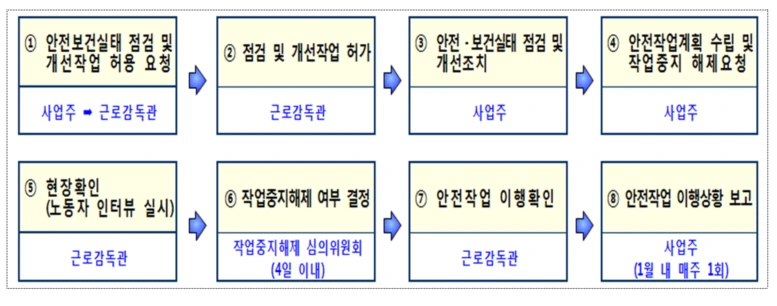 사업주가 법령에 정한 안전 및 보건 상의 조치를 하지 아니하여 유해, 위험한 상태가 해소 또는 개선되지 아니하거나, 근로자에게 현저한 유해, 위험이 현저히 높아질 우려가 있는 경우 관련된 작업의 전부 또는 일부의 중지를 명할 수 있습니다.