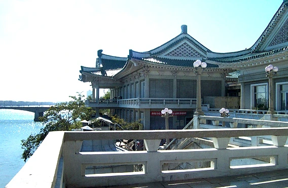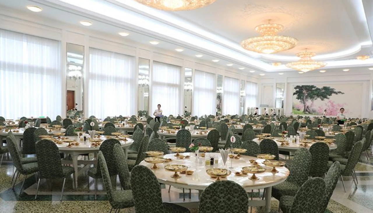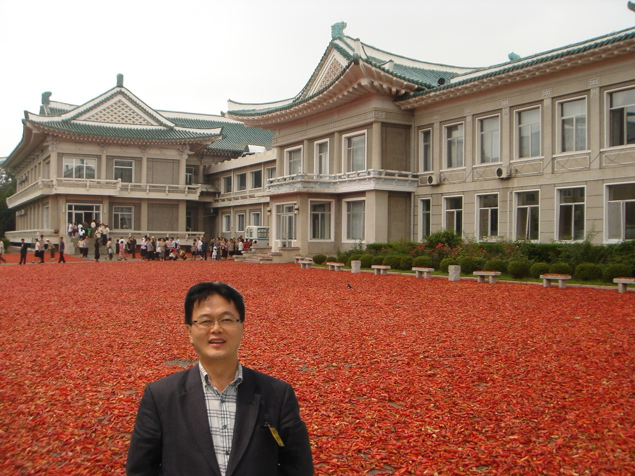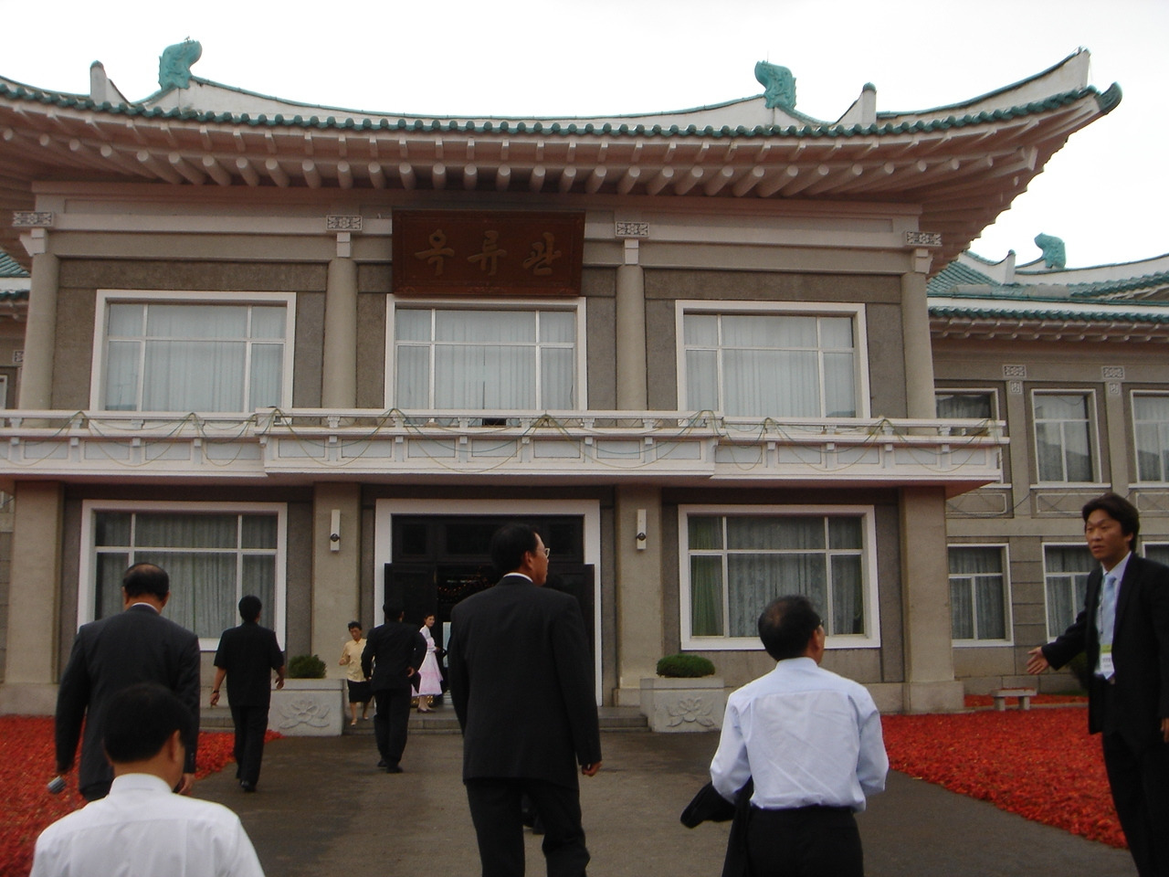 평양에 도착한 우리 일행은 호텔에 여장을 풀기 전에 우선 늦은 점심 식사를 그 유명한 평양냉면집인 옥류관에서 하도록 예정되어 있었다. 단체 버스를 타고 대동강변에 있는 엄청 큰 청기와집인 옥류관에 도착했다. 옥류관은 대동강변(평양시 중구역 경상동)에 합각식 청기와지붕에 흰색 벽의 한옥을 날아갈 듯하게 지어 놓은 냉면집이다. 원래 김일성의 지시로 1960년 광복절에 본관만 개업했는데, 나중에 별관까지 완공하여 총인원 2,200명이 동시에 식사를 할 수 있는 규모라고 한다. 이름도 김일성이 직접 지은 것이다. 그들의 말로는 하루 평균 6,000명이 이용하고, 이 옥류관에서 최고로 많이 팔 경우 하루에 1만 그릇의 냉면을 팔고 있다고 한다. 옥류관 앞에 버스가 도착하니 점심을 먹으려고 기다리는 인파가 장사진(長蛇陣)을 치고 있었다. 평양 시민들이 점심시간에 이렇게 많이 냉면을 먹으러 온다는 사실이 신기했다. 우리가 도착한 시기에 옥류관 앞뜰에는 고추를 말리느라고 온통 빨간 고추가 운동장처럼 널려 있었다. 이렇게 고추를 말려서 1년 내내 김치를 담가 먹는단다.