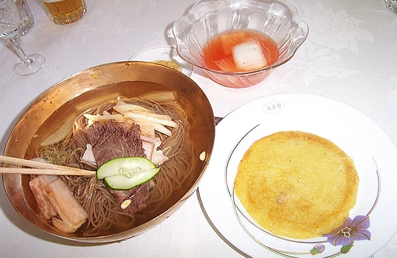 지배인이 우리 테이블로 와서 평양냉면 시식 방법에 대채 일장 연설을 하기 시작했다. 무슨 특별한 방법이 있나 하고 모두들 그의 강의에 귀를 기울이면서 젓가락을 들지 않고 기다렸다. 탁자 위에 놓인 냉면 그릇에 왼손으로 젓가락을 찔러 넣어서 면발을 통째로 들어 올리더니 오른손으로 식초병을 잡고서 면발에 식초를 뿌리기 시작했다. 남조선 동무들이 식초를 냉면 육수에 마구 뿌리는 것은 잘못된 것이란다. 식초는 면발에 뿌려서 면발이 식초를 머금었을 때 다시 육수에 내려놓고, 가위로 자르든 그대로 먹든 하란다. 그리고 계란을 그냥 먹는 동무가 있는데, 그것도 잘못이란다. 계란의 흰자와 노른자를 분리해서 흰자는 그대로 먹어도 되지만, 노른자는 숟가락으로 부셔서 냉면 전체에 고루 혼합이 되게 해서 먹어야 고소한 맛을 살릴 수 있다고 일장 연설했다. 수육이나, 김치는 각자 취향대로 먹으란다. 모두들 그 지배인이 시키는 대로 따라 해 보더니 좋다고 한다.