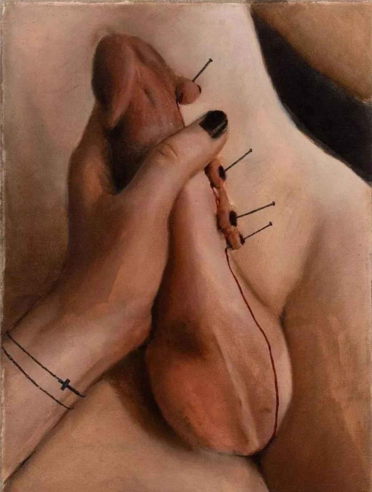 여성의 가녀린 손이 남성의 음경을 잡고 그 아래 부분을 노출시키고 있다. 손톱은 검정 매니큐어를 칠하고 그녀의 손가락 끝을 통해 구세주처럼 십자가에 못 박혀서 고정되어 있다. 그 사이로 손가락에서 나온 것인지 음경에서 나온 것인지 모를 소량의 피가 한 가닥 실처럼 아래로 흘러내린다. 여성의 손목에는 십자가가 있는 팔찌가 걸려 있다. 폴란드 젊은 화가 아가타 슬로박(Agata Slowak)의 <영원한 안식(R.I.P.)>이다. 바로 옆은 핏 줄기만 더 많이 흘러내리는 비슷한 구도의 작품이다. 그녀는 자기의 그림에 대하여 이렇게 표현한다. “내 그림에는 야생 동물의 본능, 어두운 욕망, 육욕적 충동이 만난다. 나는 억압적인 가부장적 태도와 수세기에 걸쳐 예술계에서 여성의 지위에 대한 관찰을 통해 그림에서 이 주제를 다루도록 격려받았다. 나의 그림은 과도한 노출, 섹스, 가톨릭 교회와 젠더에 대한 비판이 여전히 폴란드에서 스캔들을 불러일으키고 있다는 사실에 대한 반대를 표명하는 것이다.” 바로 밑에 있는 그녀의 비슷한 작품 <음경 별자리(Penis Constellation-Kitty Paw)>도 남성의 음경에 낚시 바늘을 걸어서 들어 올리고, 수많은 물고기들도 같이 낚시에 걸려 있다.