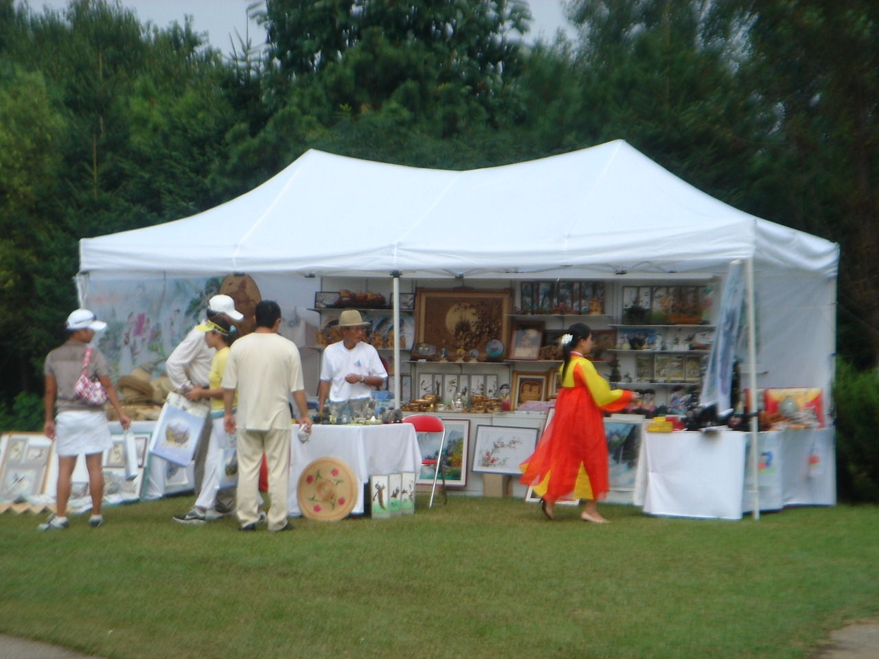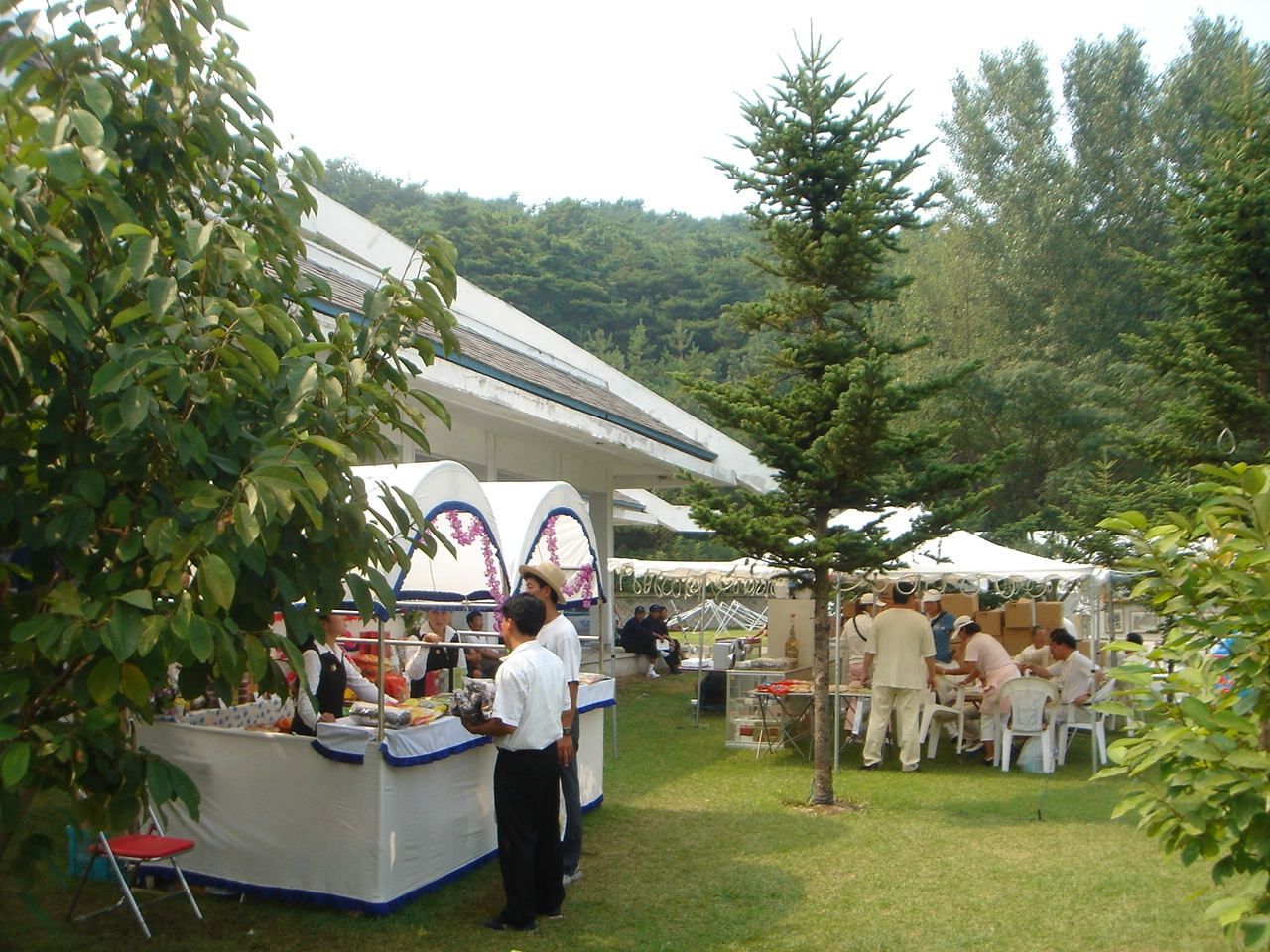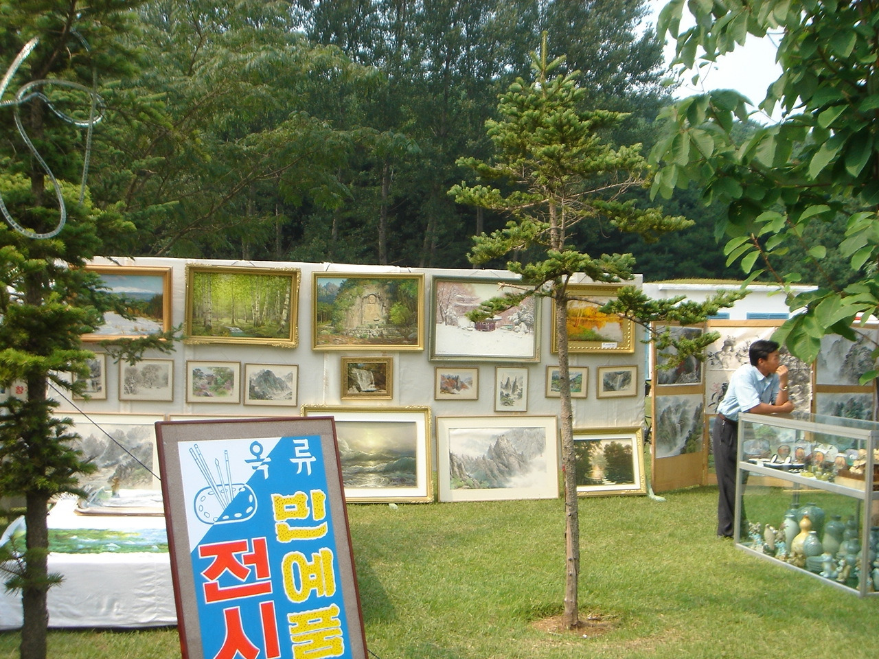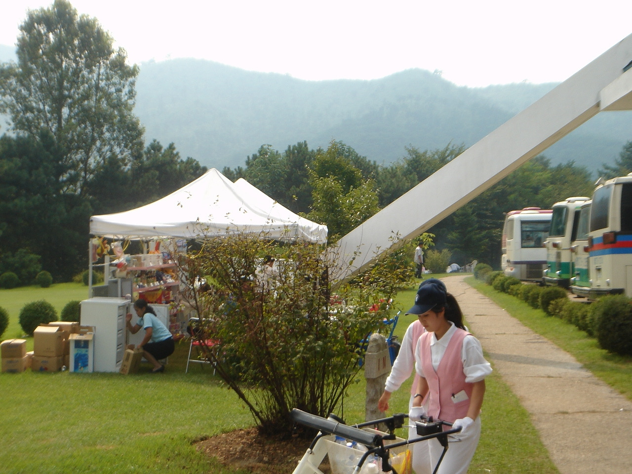 골프 코스를 돌면 매 코스마다 북측의 안내원들이 따라붙고, 매 홀의 볼이 떨어지는 지점쯤에 유도요원들이 배치되어 볼의 낙지점을 찾아주니 마치 황제 골프를 치는 격이었다. 더구나 언덕 쪽의 숲 속에도 안내요원들이 군데군데 배치되어 있었다. 유도 요원들은 오비인지 세이프인지를 수신호로 알려 주고 박수도 쳐주곤 했다. 코스 중간의 그늘 집은 없지만 접대원들이 얼음 통에 시원한 음료나 맥주를 가져다 팔곤 하는데, 맥주나 생수나 음료나 모든 게 2유로란다. 거스름돈도 없고 가격 차이도 없다. 골프 코스 주변에 설치한 간이매점들에는 북한산 물품들을 판매하고 있었다. 북한산 주류와 서화 작품, 골동품, 도자기류, 공예품류 등이다.