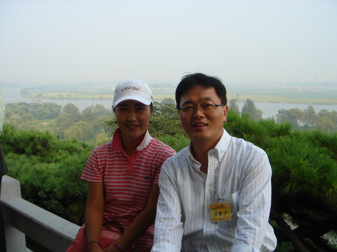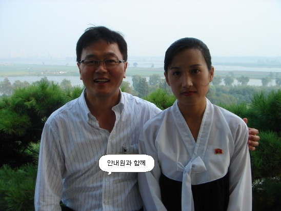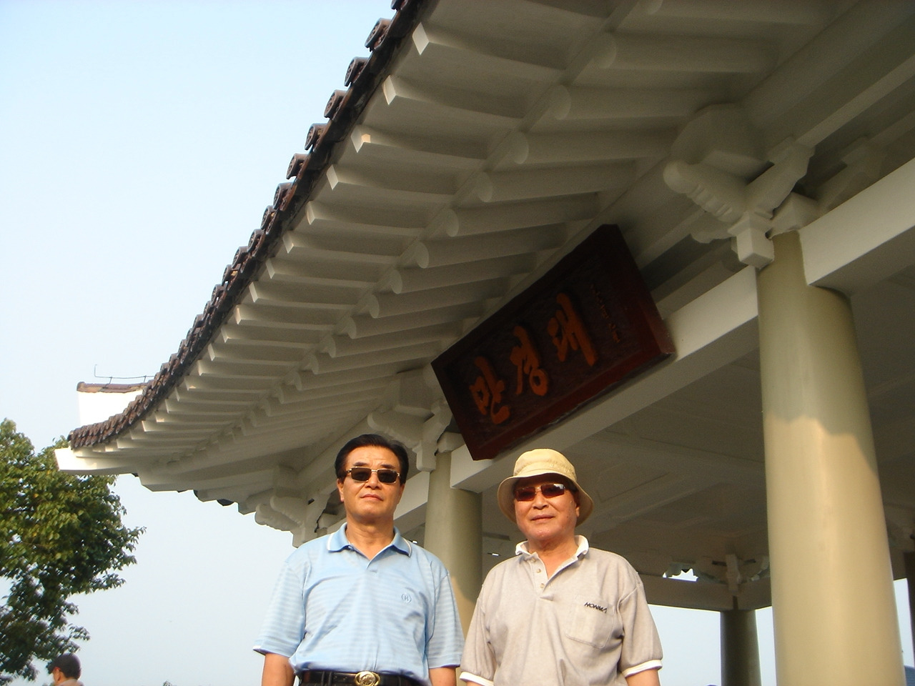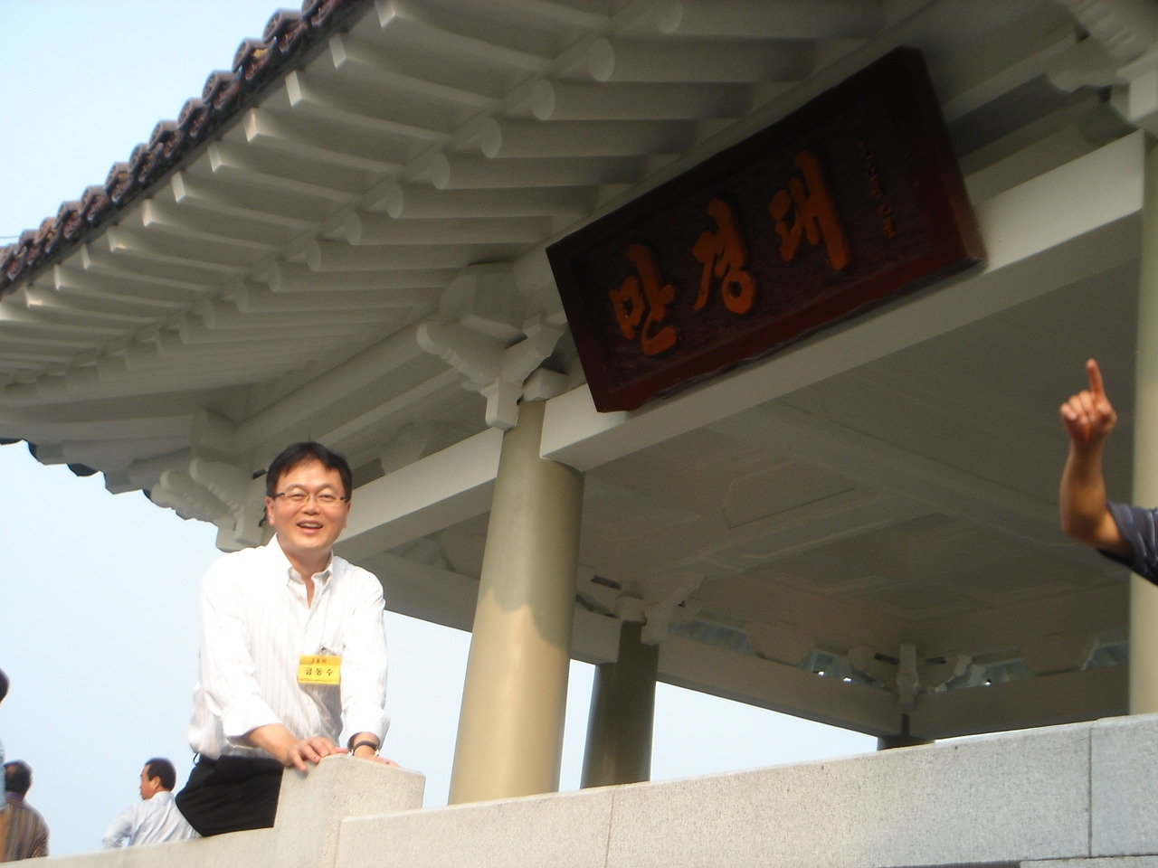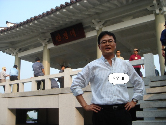 만경대는 김일성 생가의 뒤쪽에 있는 만경봉 언덕 위에 정자처럼 지은 누대(樓臺)이다. 누대에 오르면 평양 교외의 평야지대와 대동강의 줄기가 내려다 보였다. 김일성이 어려서 이곳에서 소를 기르면서 나무 그늘에서 공부도 하곤 하였단다. 그러다가 항일 유격대 활동은 위해 집을 떠나 해방이 될 때까지 중국에서 지내다가 들어와서 고향집에 먼저 들리지 않고 인민들을 먼저 들러본 후 나중에 고향집에 들리는 그런 혁명가라고 입에 침이 마르도록 설명을 한다. 열심히 설명하는 북한 여성 안내원과 기념으로 사진을 한 컷 찍어 보았다.