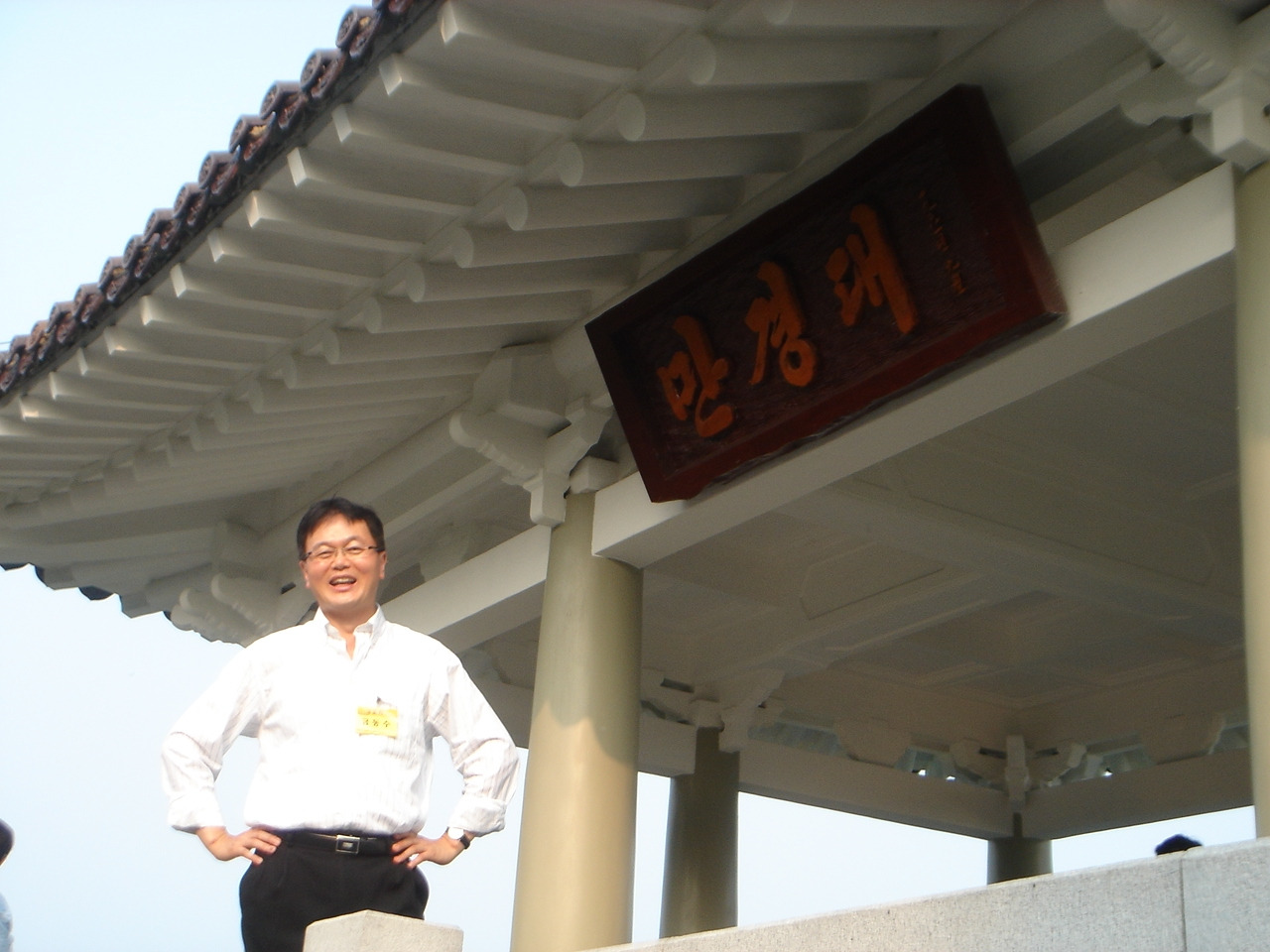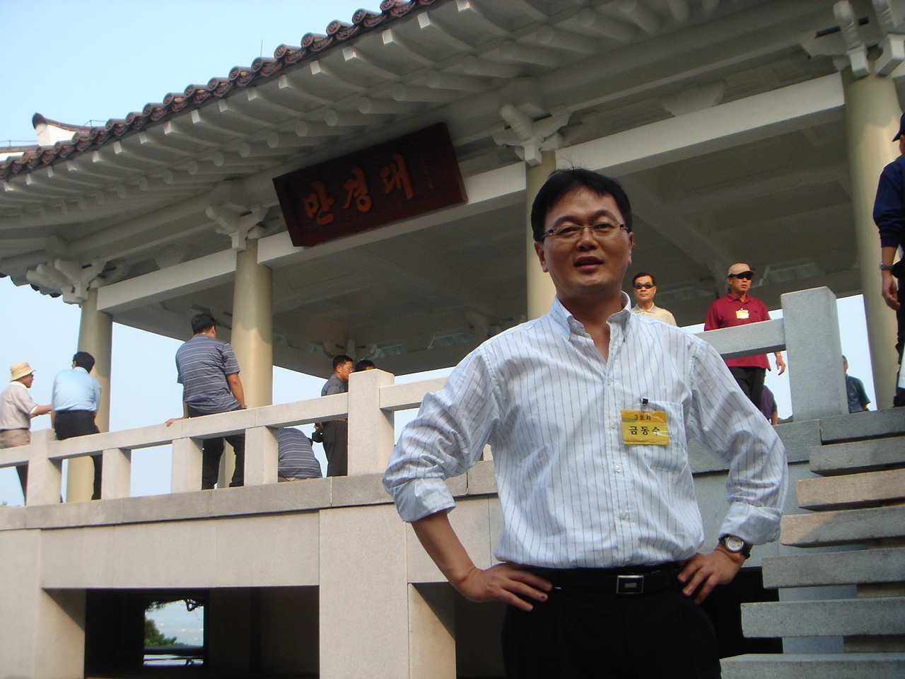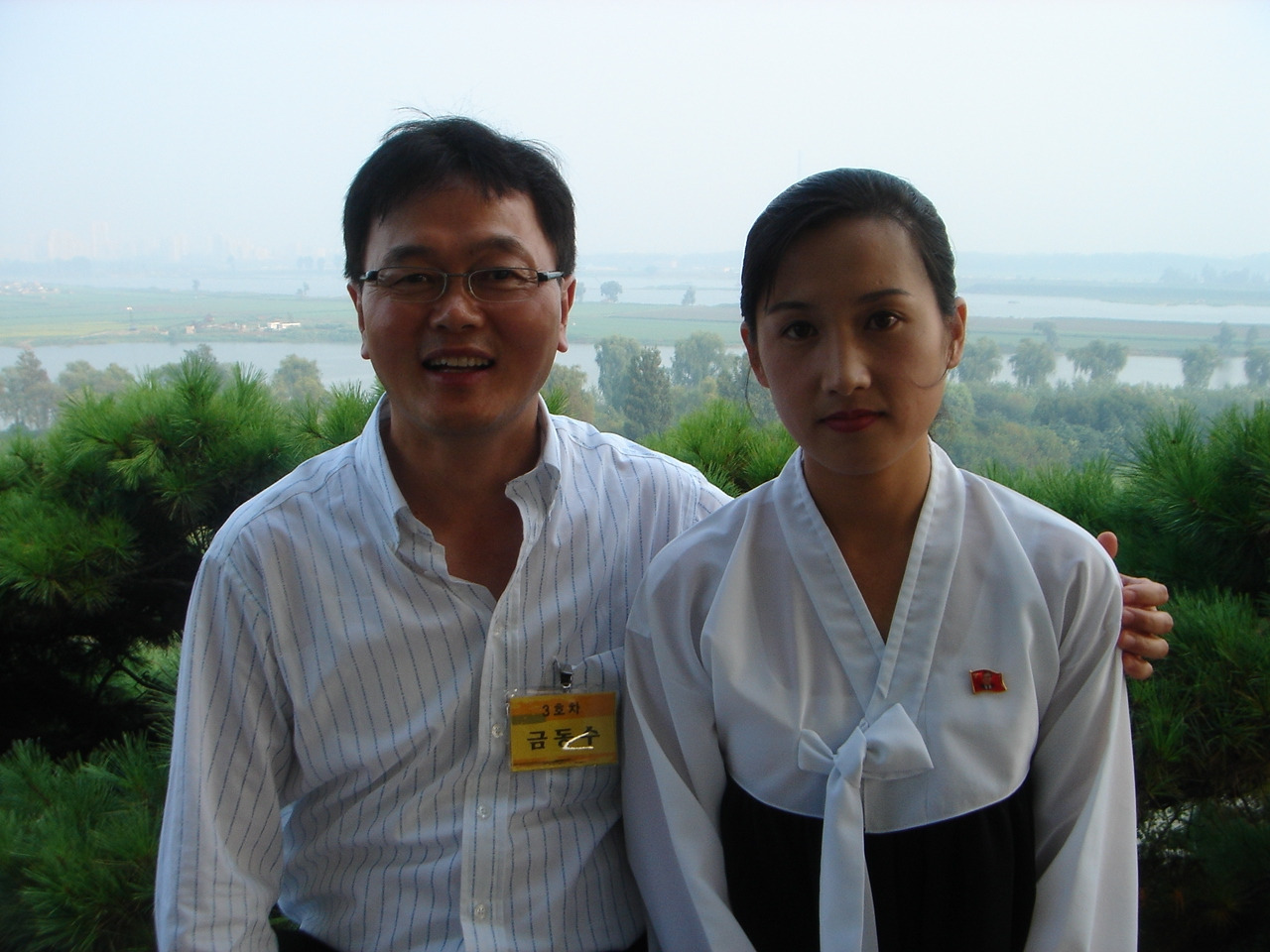 만경대는 김일성 생가의 뒤쪽에 있는 만경봉 언덕 위에 정자처럼 지은 누대(樓臺)이다. 누대에 오르면 평양 교외의 평야지대와 대동강의 줄기가 내려다 보였다. 김일성이 어려서 이곳에서 소를 기르면서 나무 그늘에서 공부도 하곤 하였단다. 그러다가 항일 유격대 활동은 위해 집을 떠나 해방이 될 때까지 중국에서 지내다가 들어와서 고향집에 먼저 들리지 않고 인민들을 먼저 들러본 후 나중에 고향집에 들리는 그런 혁명가라고 입에 침이 마르도록 설명을 한다. 열심히 설명하는 북한 여성 안내원과 기념으로 사진을 한 컷 찍어 보았다.