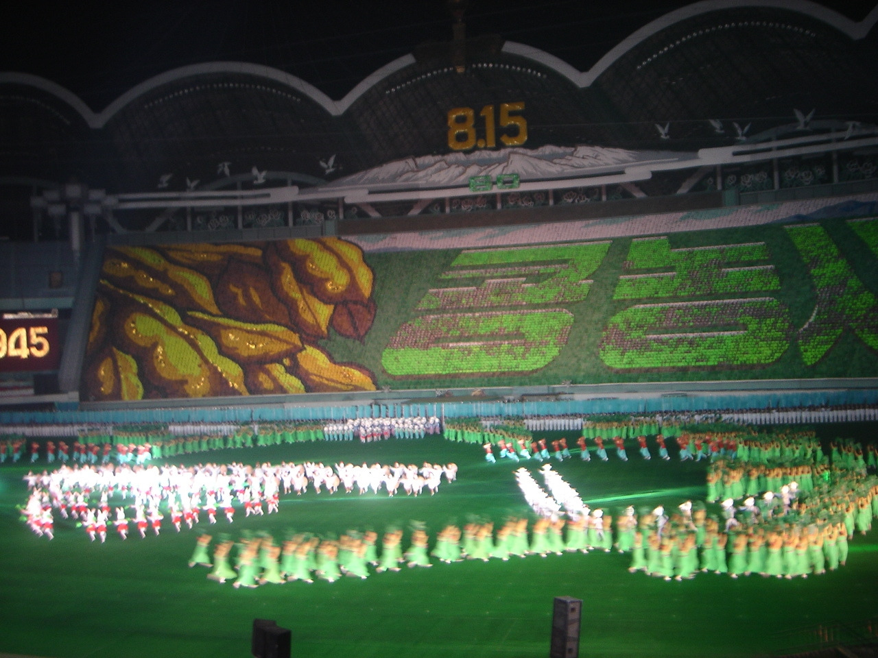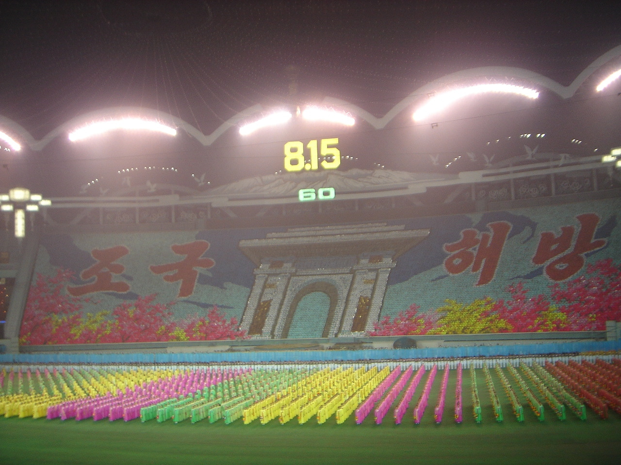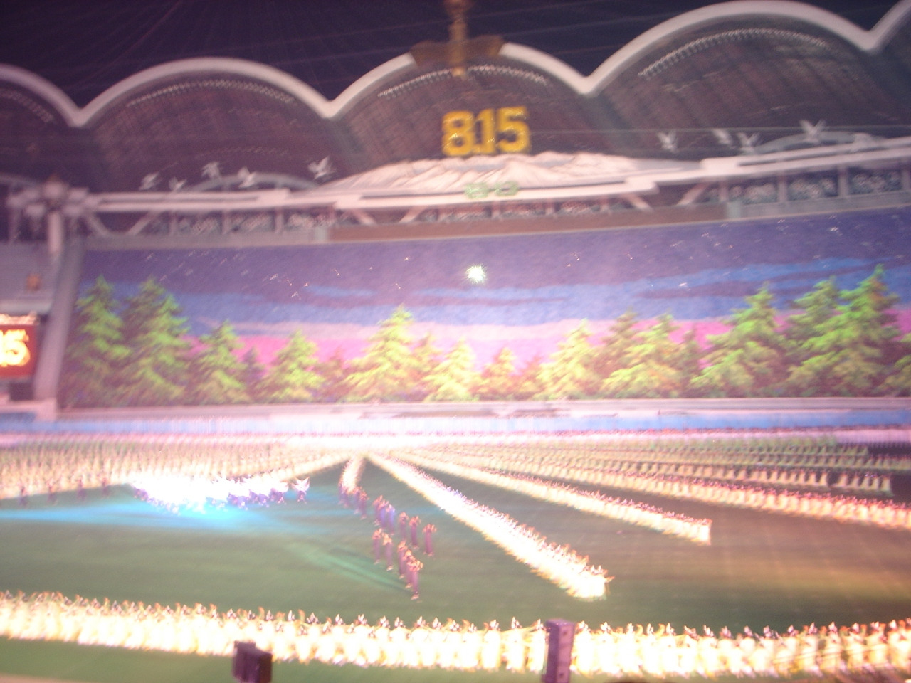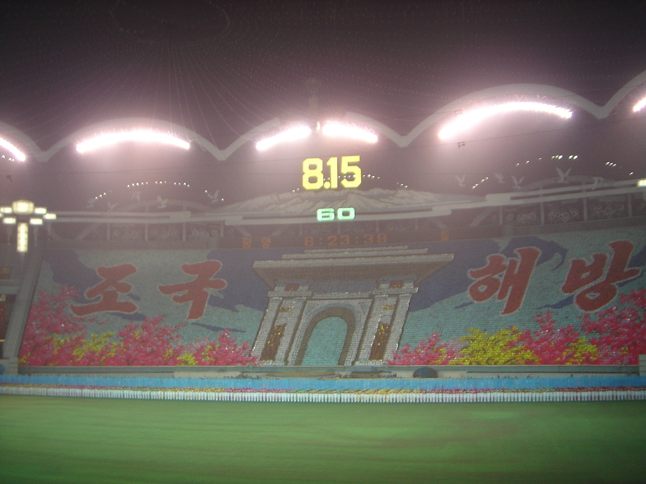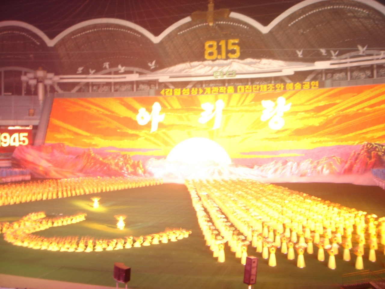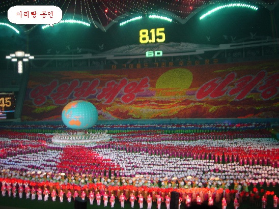 골프대회가 끝난 날의 저녁에는 이른 저녁 식사를 하고 평양의 대동강 능라도(綾羅島)에 있는 5.1 경기장에서 열리는 <아리랑> 공연을 보기로 했다. 5.1 경기장은 노동절을 기념한 노동자경기장인데, 수용인원이 15만 명가량 되는 매머드급 경기장이라고 한다. 이 경기장에서 2005년 광복절부터 그들의 노동당 창당일인 10월 10일을 지나 17일까지 매일(일요일 제외) 1시간 20분씩 공연인원 7만여 명이 동원되는 매머드급 매스게임과 카드섹션을 하는 것이다. 2002년 김일성 생일에 맞추어 기획된 것인데, 지금은 연중행사로 공연을 한다. 그냥 저녁 먹고 맥주나 한 잔 하고 쉬려고 하는데, 북측의 안내와 강권(强勸)에 못 이겨 보러 가기로 했다. 처음 공연이 무료인 줄 알았는데, 요금이 상상보다 비쌌다. 특석이 300유로, 1등석이 150유로, 2등석이 100유로, 보통석이 50유로였다. 너무 비싼 것 같아서 2등석인 100유로짜리로 예약했다. 경기장에 가서 보니까 특등석은 로열박스에 있는데 탁자와 안락의자가 배치되어 있고 음료를 제공하고 있었다. 1등석과 2등석은 특석을 중심으로 주변에 배치를 했는데, 1등석과 2등석의 차이는 없어 보였다. 자리 위치가 관람석 제일 중앙이라서 공연을 전체적으로 보는 데는 아무 문제가 없었다. 2등석과 보통석 사이에는 왕래하지 못하게 경계줄을 세워서 구분하여 놓았고, 보통석에는 북한 주민들이 가득 참석하고 있었다.