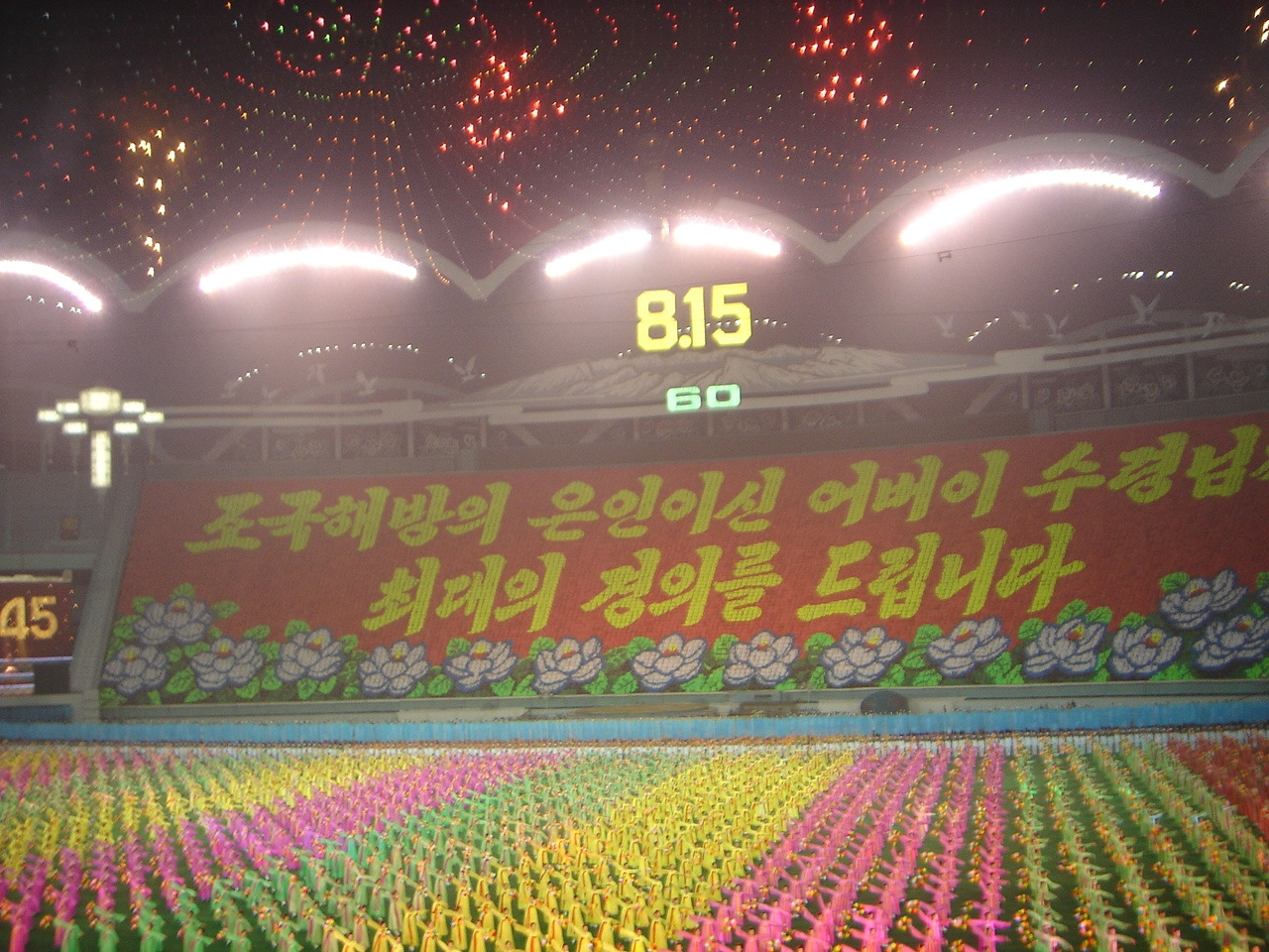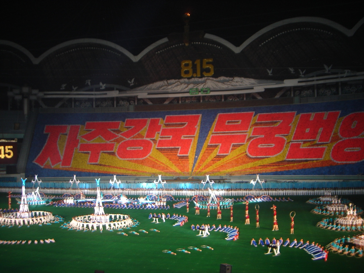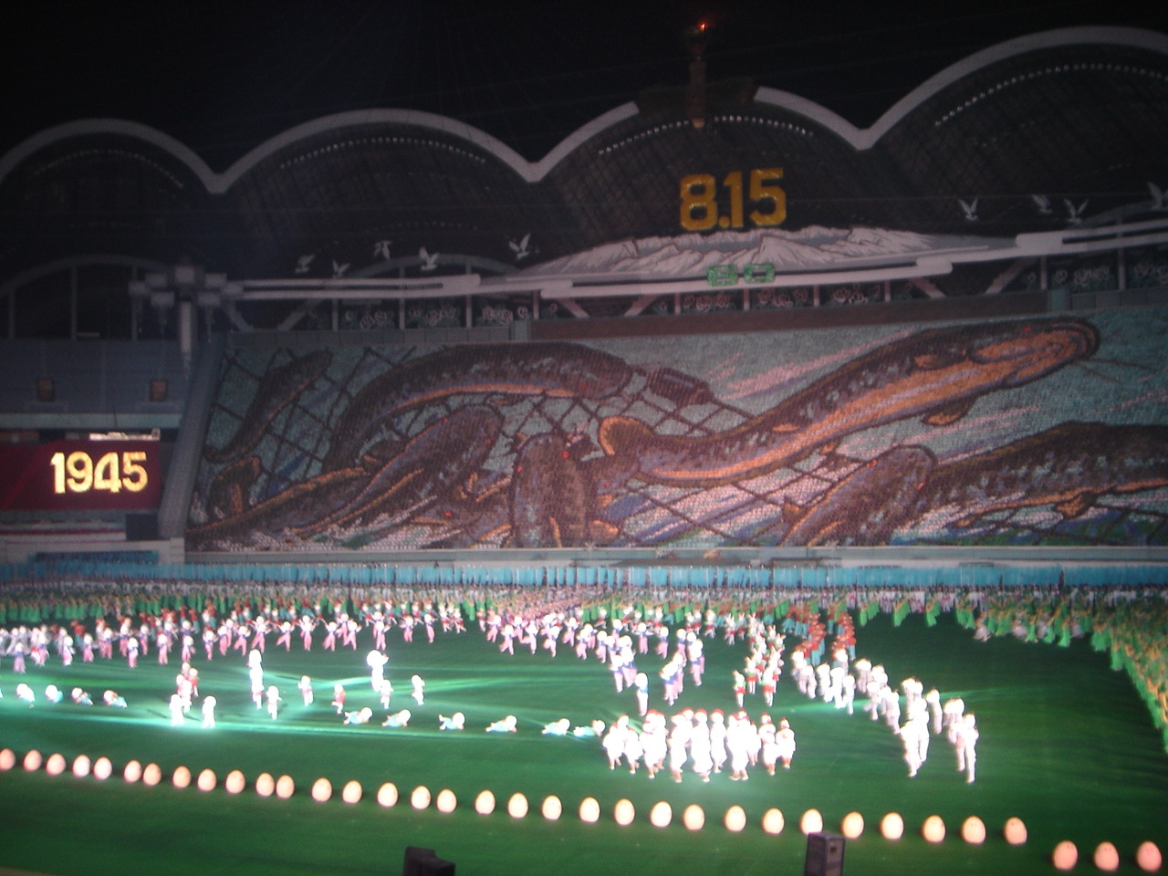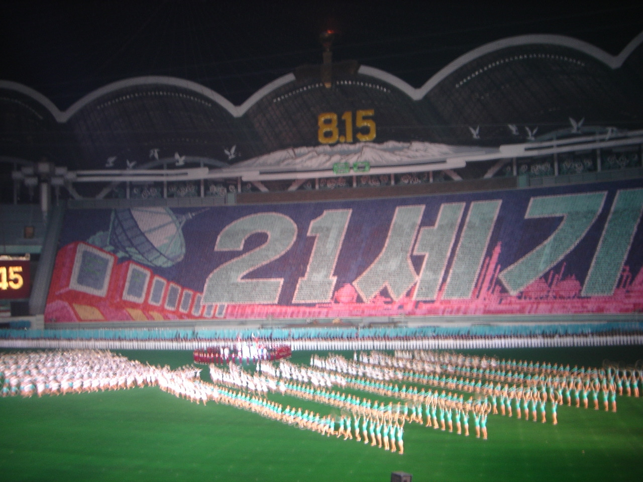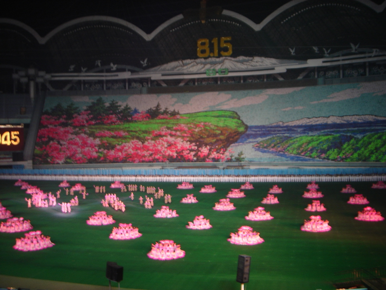 골프대회가 끝난 날의 저녁에는 이른 저녁 식사를 하고 평양의 대동강 능라도(綾羅島)에 있는 5.1 경기장에서 열리는 <아리랑> 공연을 보기로 했다. 5.1 경기장은 노동절을 기념한 노동자경기장인데, 수용인원이 15만 명가량 되는 매머드급 경기장이라고 한다. 이 경기장에서 2005년 광복절부터 그들의 노동당 창당일인 10월 10일을 지나 17일까지 매일(일요일 제외) 1시간 20분씩 공연인원 7만여 명이 동원되는 매머드급 매스게임과 카드섹션을 하는 것이다. 2002년 김일성 생일에 맞추어 기획된 것인데, 지금은 연중행사로 공연을 한다. 그냥 저녁 먹고 맥주나 한 잔 하고 쉬려고 하는데, 북측의 안내와 강권(强勸)에 못 이겨 보러 가기로 했다. 처음 공연이 무료인 줄 알았는데, 요금이 상상보다 비쌌다. 특석이 300유로, 1등석이 150유로, 2등석이 100유로, 보통석이 50유로였다. 너무 비싼 것 같아서 2등석인 100유로짜리로 예약했다. 경기장에 가서 보니까 특등석은 로열박스에 있는데 탁자와 안락의자가 배치되어 있고 음료를 제공하고 있었다. 1등석과 2등석은 특석을 중심으로 주변에 배치를 했는데, 1등석과 2등석의 차이는 없어 보였다. 자리 위치가 관람석 제일 중앙이라서 공연을 전체적으로 보는 데는 아무 문제가 없었다. 2등석과 보통석 사이에는 왕래하지 못하게 경계줄을 세워서 구분하여 놓았고, 보통석에는 북한 주민들이 가득 참석하고 있었다.