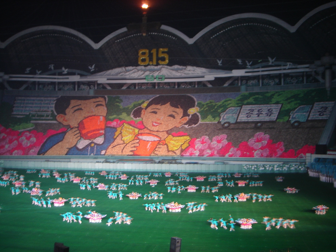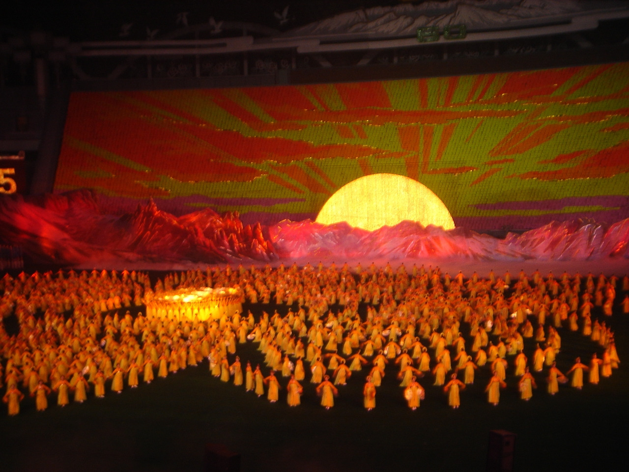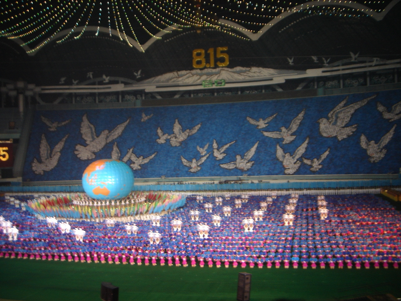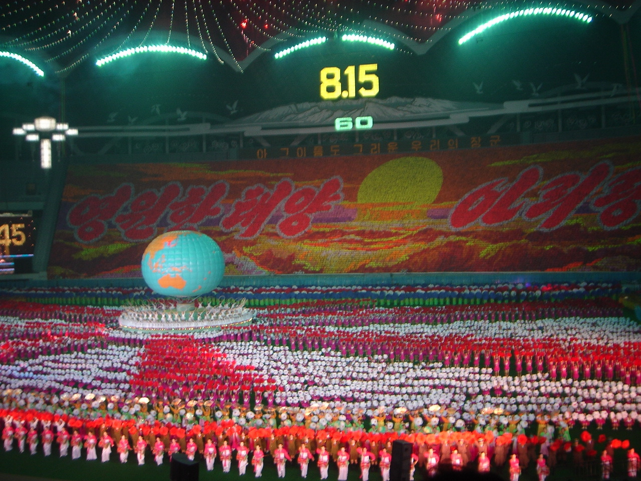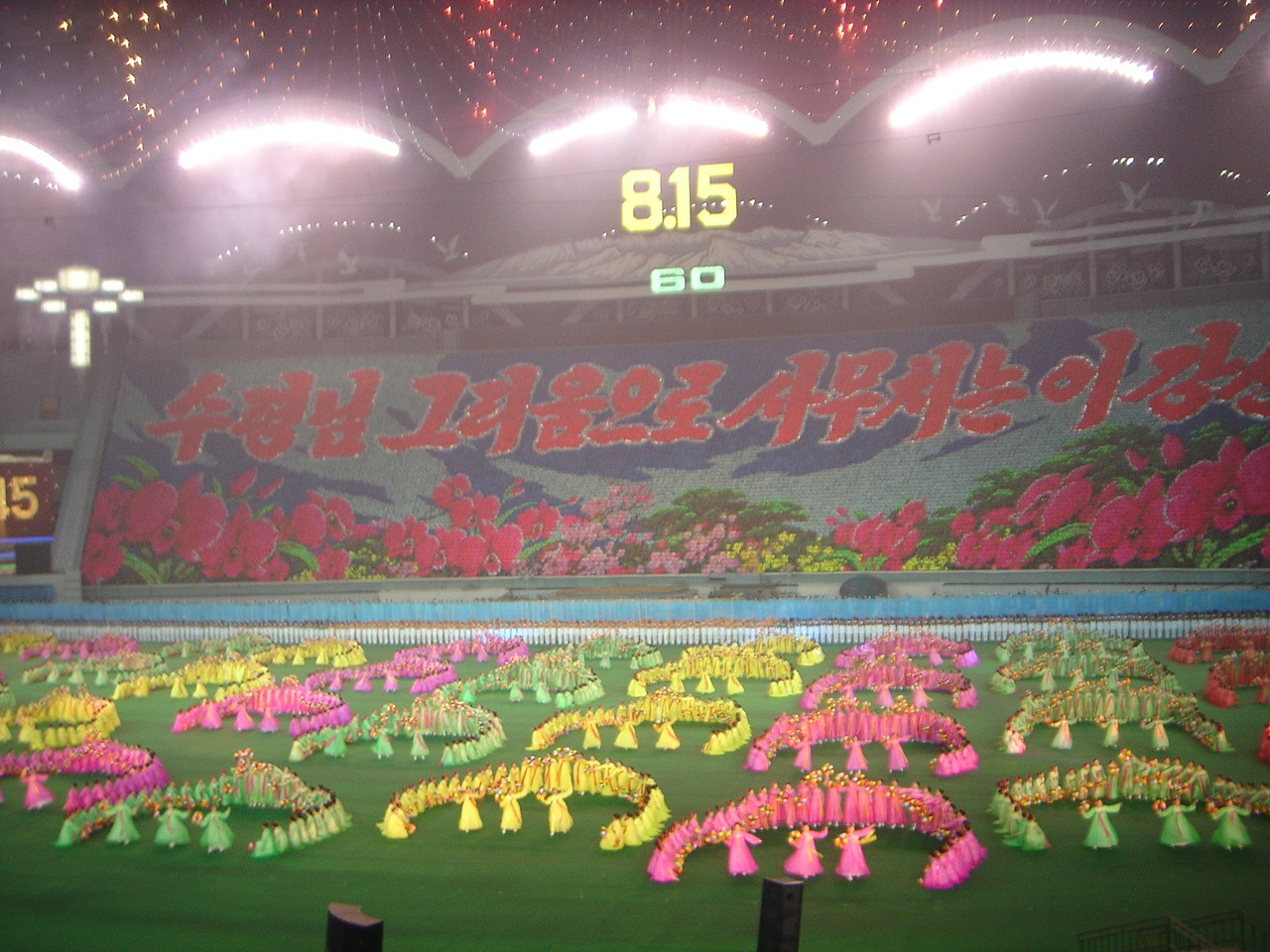골프대회가 끝난 날의 저녁에는 이른 저녁 식사를 하고 평양의 대동강 능라도(綾羅島)에 있는 5.1 경기장에서 열리는 <아리랑> 공연을 보기로 했다. 5.1 경기장은 노동절을 기념한 노동자경기장인데, 수용인원이 15만 명가량 되는 매머드급 경기장이라고 한다. 이 경기장에서 2005년 광복절부터 그들의 노동당 창당일인 10월 10일을 지나 17일까지 매일(일요일 제외) 1시간 20분씩 공연인원 7만여 명이 동원되는 매머드급 매스게임과 카드섹션을 하는 것이다. 2002년 김일성 생일에 맞추어 기획된 것인데, 지금은 연중행사로 공연을 한다. 그냥 저녁 먹고 맥주나 한 잔 하고 쉬려고 하는데, 북측의 안내와 강권(强勸)에 못 이겨 보러 가기로 했다. 처음 공연이 무료인 줄 알았는데, 요금이 상상보다 비쌌다. 특석이 300유로, 1등석이 150유로, 2등석이 100유로, 보통석이 50유로였다. 너무 비싼 것 같아서 2등석인 100유로짜리로 예약했다. 경기장에 가서 보니까 특등석은 로열박스에 있는데 탁자와 안락의자가 배치되어 있고 음료를 제공하고 있었다. 1등석과 2등석은 특석을 중심으로 주변에 배치를 했는데, 1등석과 2등석의 차이는 없어 보였다. 자리 위치가 관람석 제일 중앙이라서 공연을 전체적으로 보는 데는 아무 문제가 없었다. 2등석과 보통석 사이에는 왕래하지 못하게 경계줄을 세워서 구분하여 놓았고, 보통석에는 북한 주민들이 가득 참석하고 있었다.