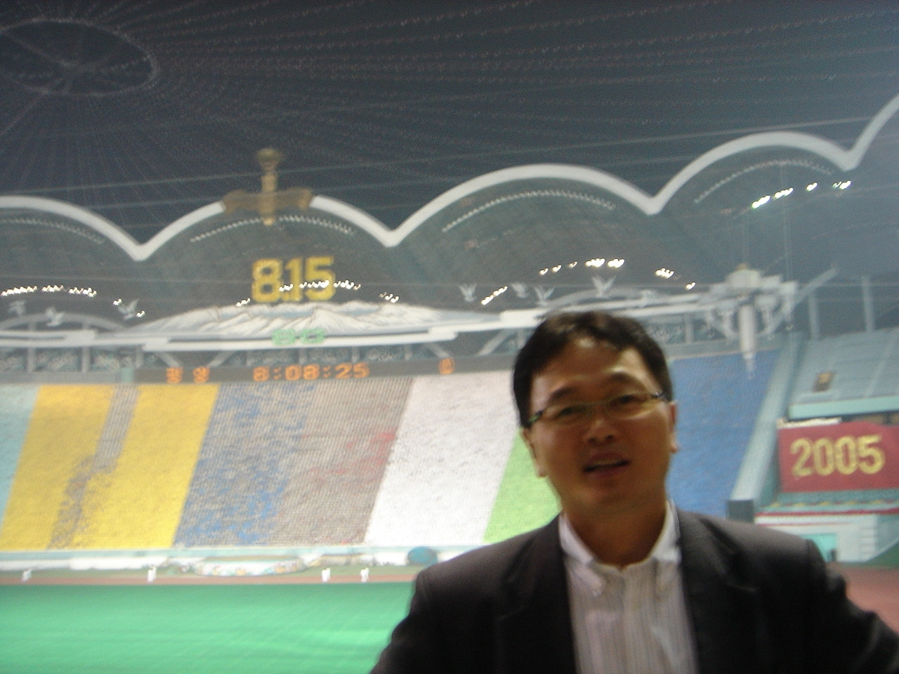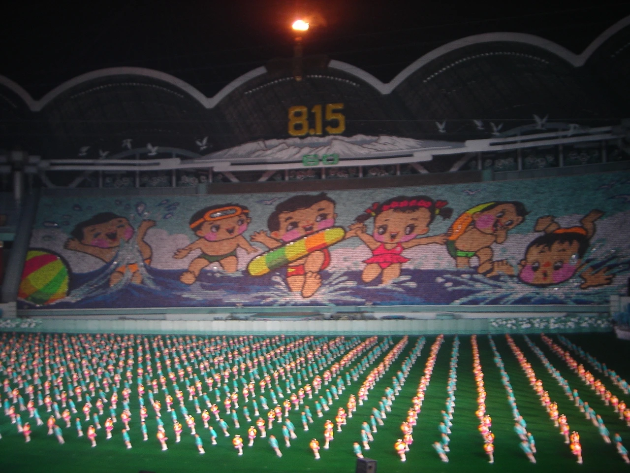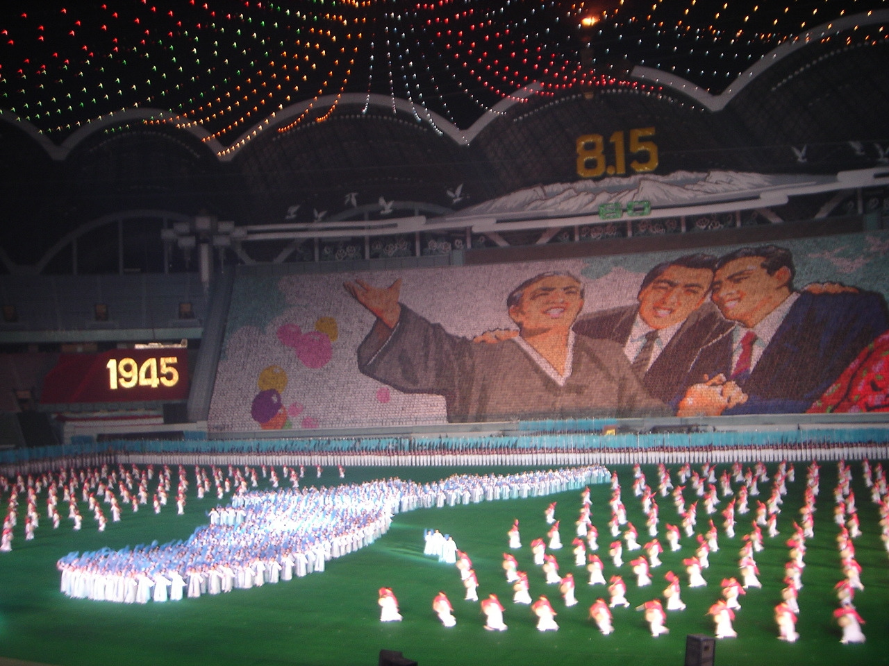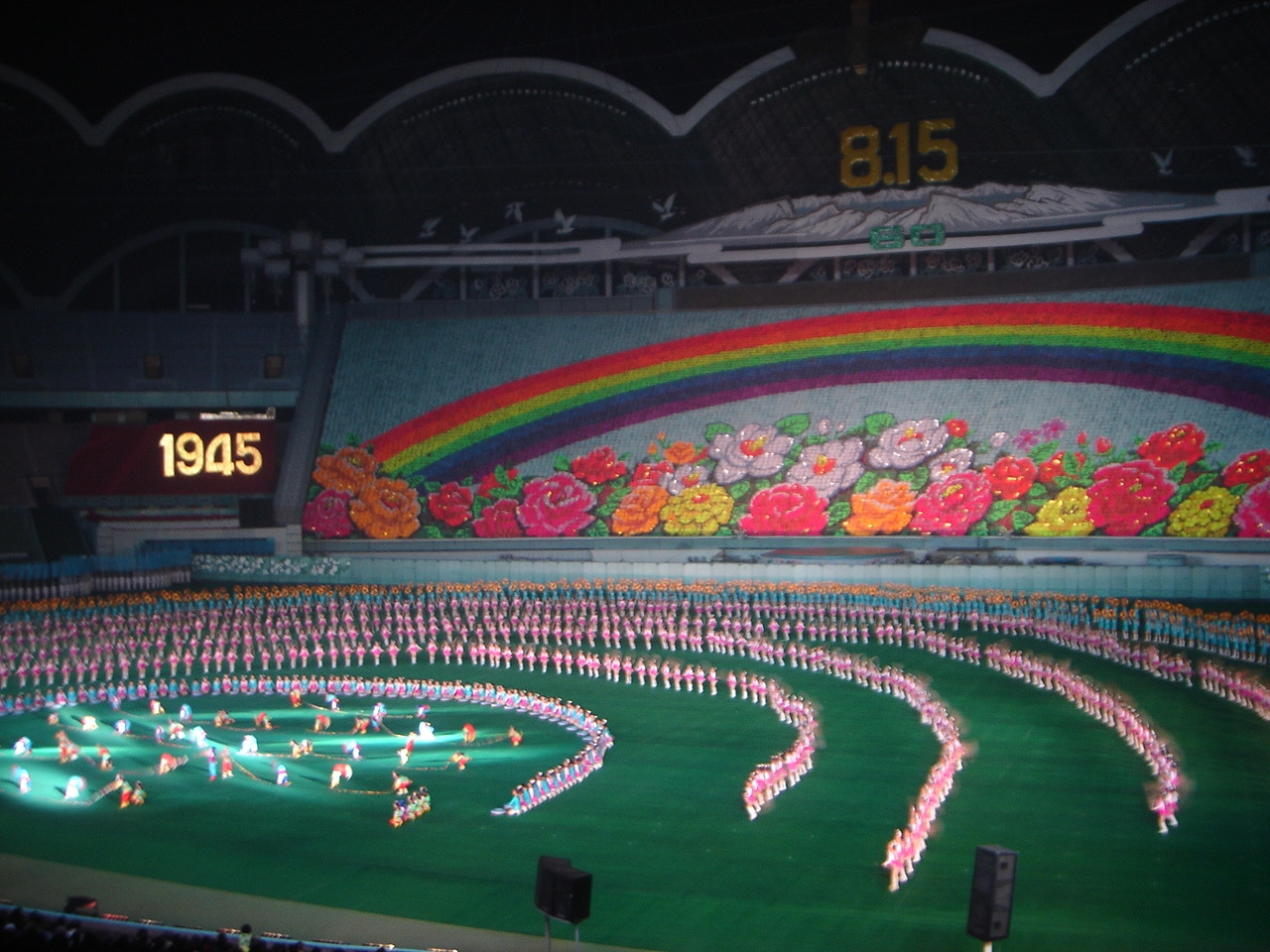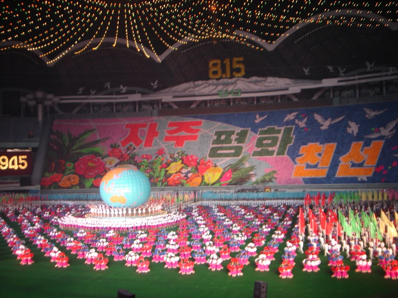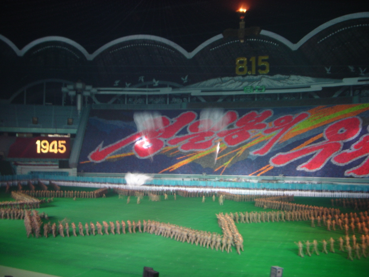 골프대회가 끝난 날의 저녁에는 이른 저녁 식사를 하고 평양의 대동강 능라도(綾羅島)에 있는 5.1 경기장에서 열리는 <아리랑> 공연을 보기로 했다. 5.1 경기장은 노동절을 기념한 노동자경기장인데, 수용인원이 15만 명가량 되는 매머드급 경기장이라고 한다. 이 경기장에서 2005년 광복절부터 그들의 노동당 창당일인 10월 10일을 지나 17일까지 매일(일요일 제외) 1시간 20분씩 공연인원 7만여 명이 동원되는 매머드급 매스게임과 카드섹션을 하는 것이다. 2002년 김일성 생일에 맞추어 기획된 것인데, 지금은 연중행사로 공연을 한다. 그냥 저녁 먹고 맥주나 한 잔 하고 쉬려고 하는데, 북측의 안내와 강권(强勸)에 못 이겨 보러 가기로 했다. 처음 공연이 무료인 줄 알았는데, 요금이 상상보다 비쌌다. 특석이 300유로, 1등석이 150유로, 2등석이 100유로, 보통석이 50유로였다. 너무 비싼 것 같아서 2등석인 100유로짜리로 예약했다. 경기장에 가서 보니까 특등석은 로열박스에 있는데 탁자와 안락의자가 배치되어 있고 음료를 제공하고 있었다. 1등석과 2등석은 특석을 중심으로 주변에 배치를 했는데, 1등석과 2등석의 차이는 없어 보였다. 자리 위치가 관람석 제일 중앙이라서 공연을 전체적으로 보는 데는 아무 문제가 없었다. 2등석과 보통석 사이에는 왕래하지 못하게 경계줄을 세워서 구분하여 놓았고, 보통석에는 북한 주민들이 가득 참석하고 있었다.