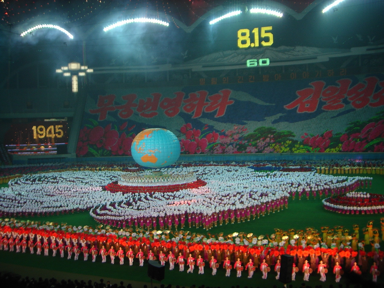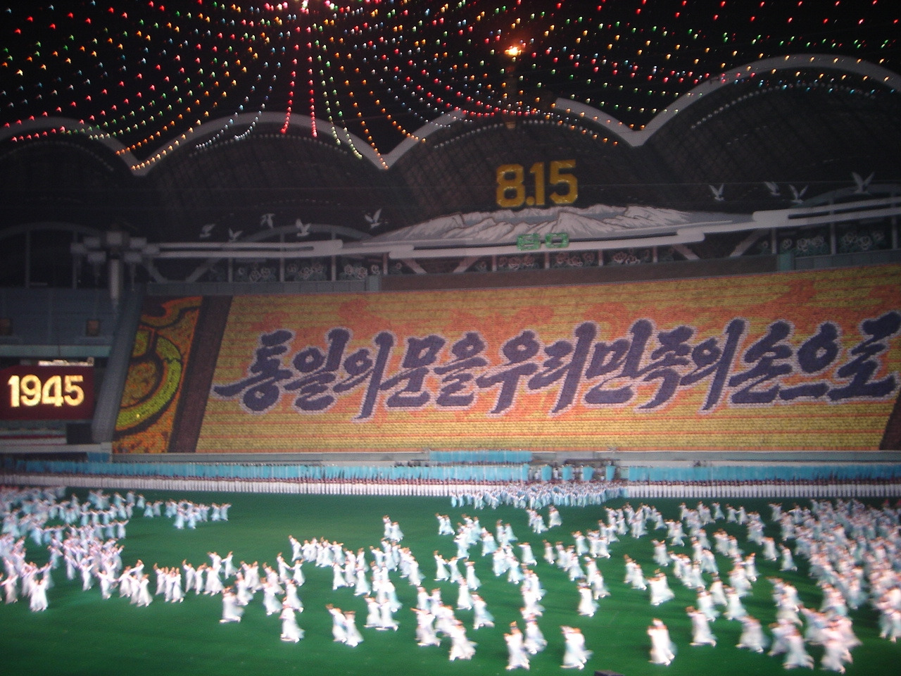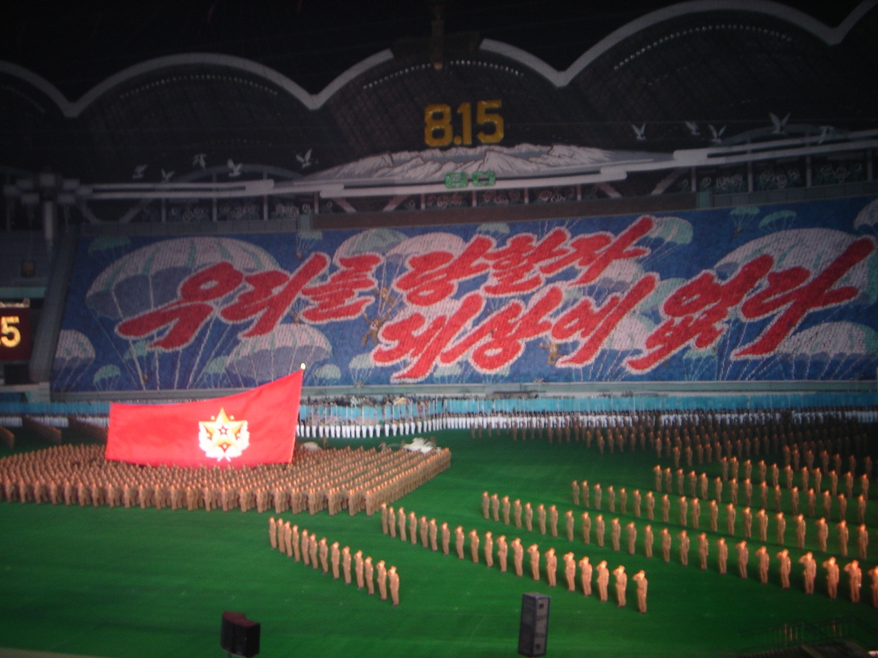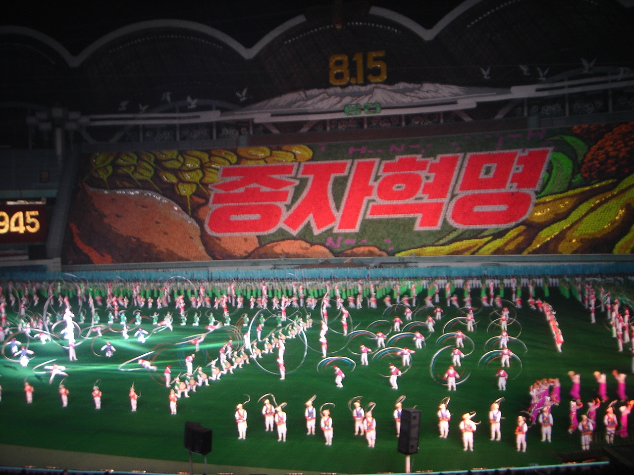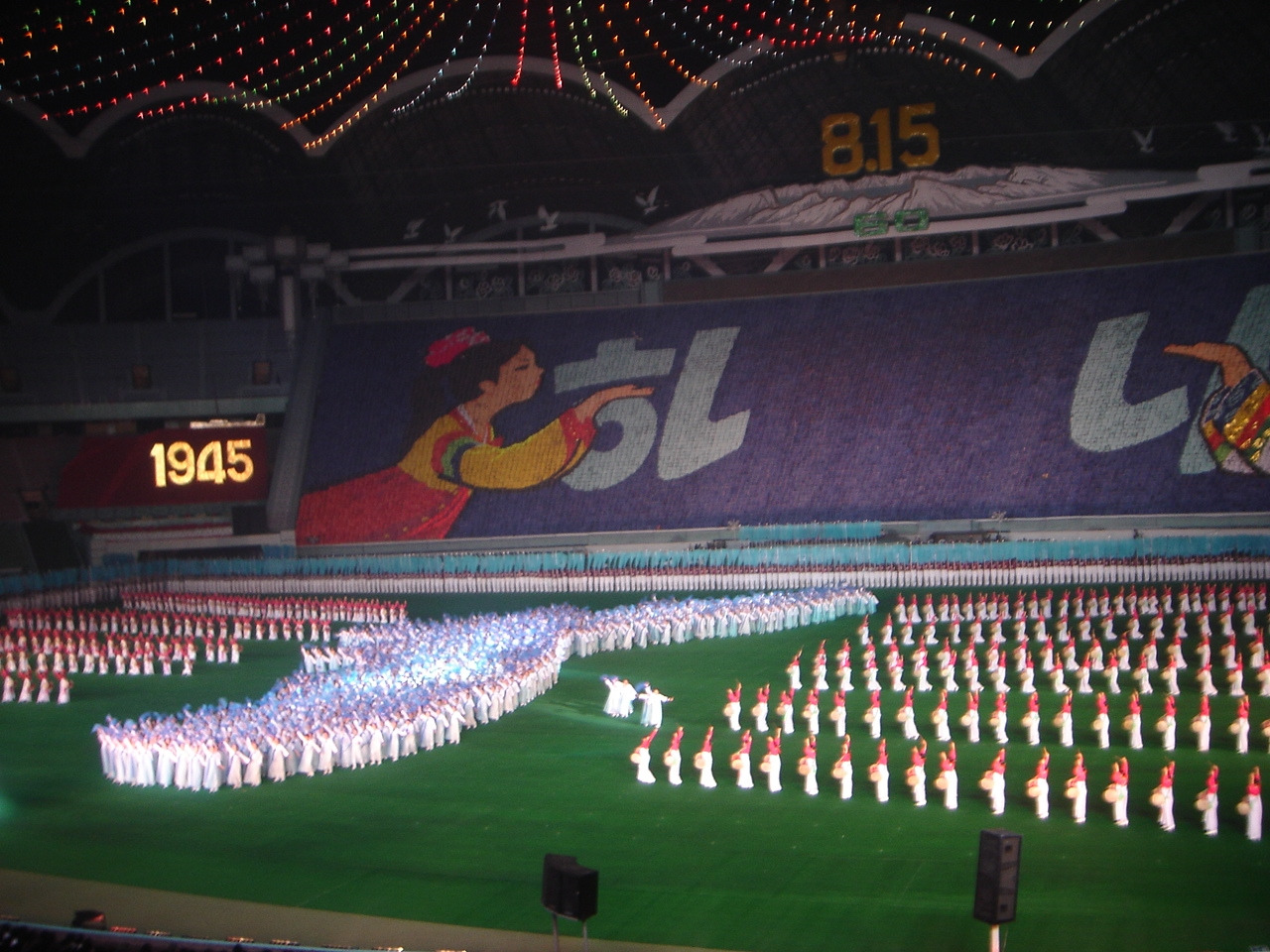 골프대회가 끝난 날의 저녁에는 이른 저녁 식사를 하고 평양의 대동강 능라도(綾羅島)에 있는 5.1 경기장에서 열리는 <아리랑> 공연을 보기로 했다. 5.1 경기장은 노동절을 기념한 노동자경기장인데, 수용인원이 15만 명가량 되는 매머드급 경기장이라고 한다. 이 경기장에서 2005년 광복절부터 그들의 노동당 창당일인 10월 10일을 지나 17일까지 매일(일요일 제외) 1시간 20분씩 공연인원 7만여 명이 동원되는 매머드급 매스게임과 카드섹션을 하는 것이다. 2002년 김일성 생일에 맞추어 기획된 것인데, 지금은 연중행사로 공연을 한다. 그냥 저녁 먹고 맥주나 한 잔 하고 쉬려고 하는데, 북측의 안내와 강권(强勸)에 못 이겨 보러 가기로 했다. 처음 공연이 무료인 줄 알았는데, 요금이 상상보다 비쌌다. 특석이 300유로, 1등석이 150유로, 2등석이 100유로, 보통석이 50유로였다. 너무 비싼 것 같아서 2등석인 100유로짜리로 예약했다. 경기장에 가서 보니까 특등석은 로열박스에 있는데 탁자와 안락의자가 배치되어 있고 음료를 제공하고 있었다. 1등석과 2등석은 특석을 중심으로 주변에 배치를 했는데, 1등석과 2등석의 차이는 없어 보였다. 자리 위치가 관람석 제일 중앙이라서 공연을 전체적으로 보는 데는 아무 문제가 없었다. 2등석과 보통석 사이에는 왕래하지 못하게 경계줄을 세워서 구분하여 놓았고, 보통석에는 북한 주민들이 가득 참석하고 있었다.