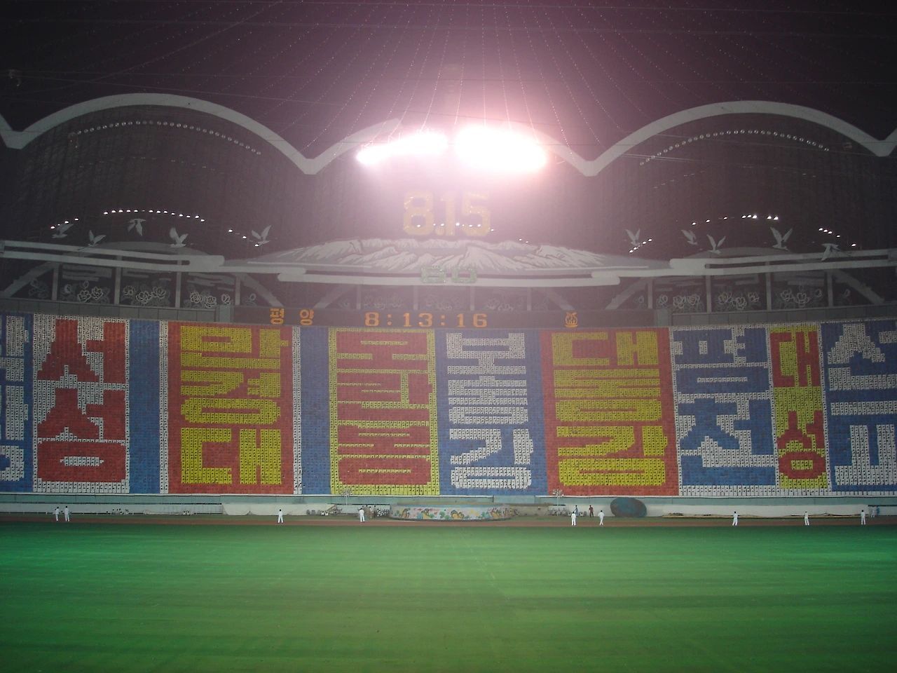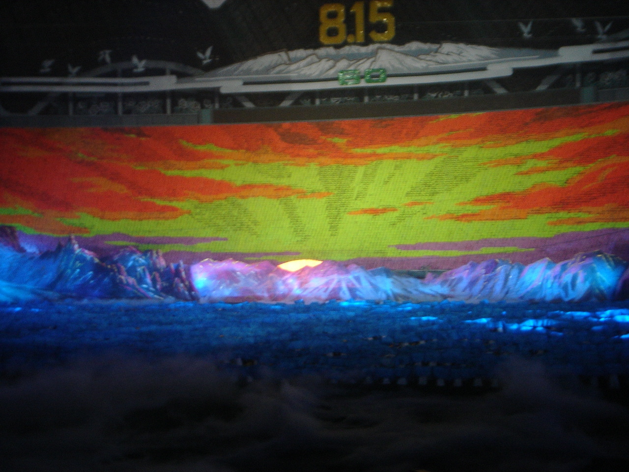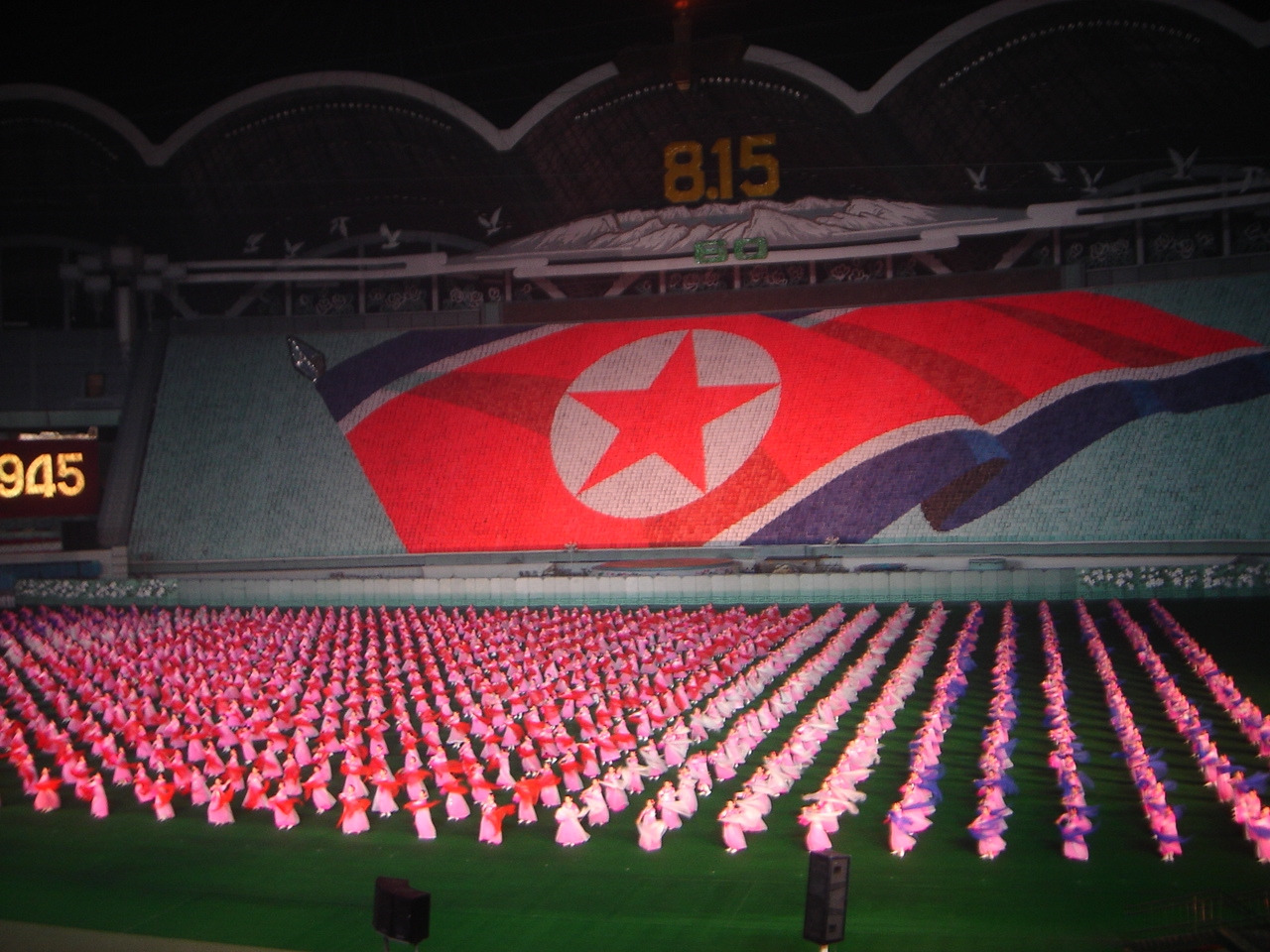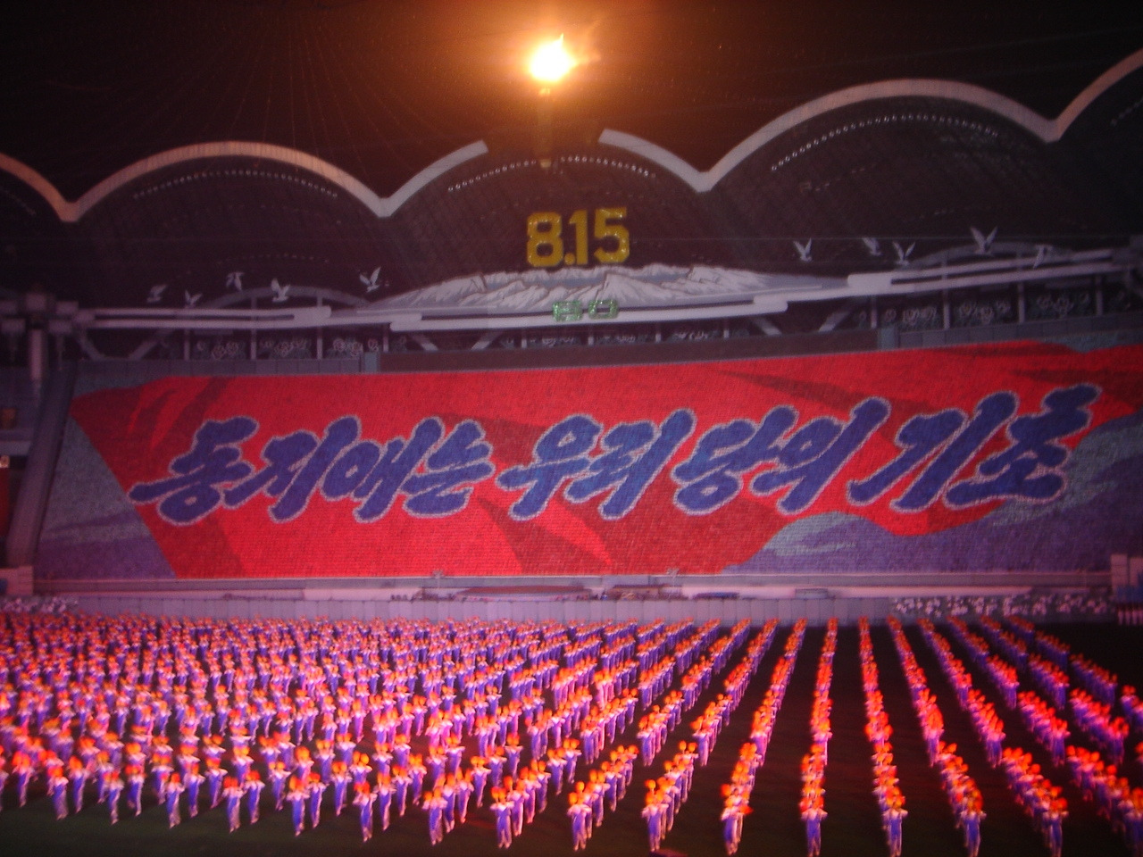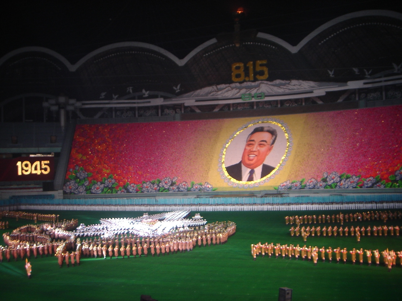 골프대회가 끝난 날의 저녁에는 이른 저녁 식사를 하고 평양의 대동강 능라도(綾羅島)에 있는 5.1 경기장에서 열리는 <아리랑> 공연을 보기로 했다. 5.1 경기장은 노동절을 기념한 노동자경기장인데, 수용인원이 15만 명가량 되는 매머드급 경기장이라고 한다. 이 경기장에서 2005년 광복절부터 그들의 노동당 창당일인 10월 10일을 지나 17일까지 매일(일요일 제외) 1시간 20분씩 공연인원 7만여 명이 동원되는 매머드급 매스게임과 카드섹션을 하는 것이다. 2002년 김일성 생일에 맞추어 기획된 것인데, 지금은 연중행사로 공연을 한다. 그냥 저녁 먹고 맥주나 한 잔 하고 쉬려고 하는데, 북측의 안내와 강권(强勸)에 못 이겨 보러 가기로 했다. 처음 공연이 무료인 줄 알았는데, 요금이 상상보다 비쌌다. 특석이 300유로, 1등석이 150유로, 2등석이 100유로, 보통석이 50유로였다. 너무 비싼 것 같아서 2등석인 100유로짜리로 예약했다. 경기장에 가서 보니까 특등석은 로열박스에 있는데 탁자와 안락의자가 배치되어 있고 음료를 제공하고 있었다. 1등석과 2등석은 특석을 중심으로 주변에 배치를 했는데, 1등석과 2등석의 차이는 없어 보였다. 자리 위치가 관람석 제일 중앙이라서 공연을 전체적으로 보는 데는 아무 문제가 없었다. 2등석과 보통석 사이에는 왕래하지 못하게 경계줄을 세워서 구분하여 놓았고, 보통석에는 북한 주민들이 가득 참석하고 있었다.