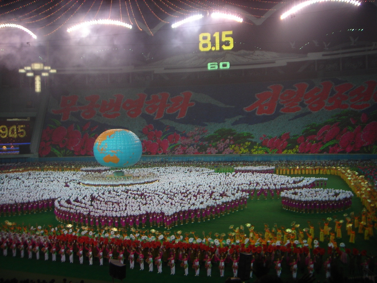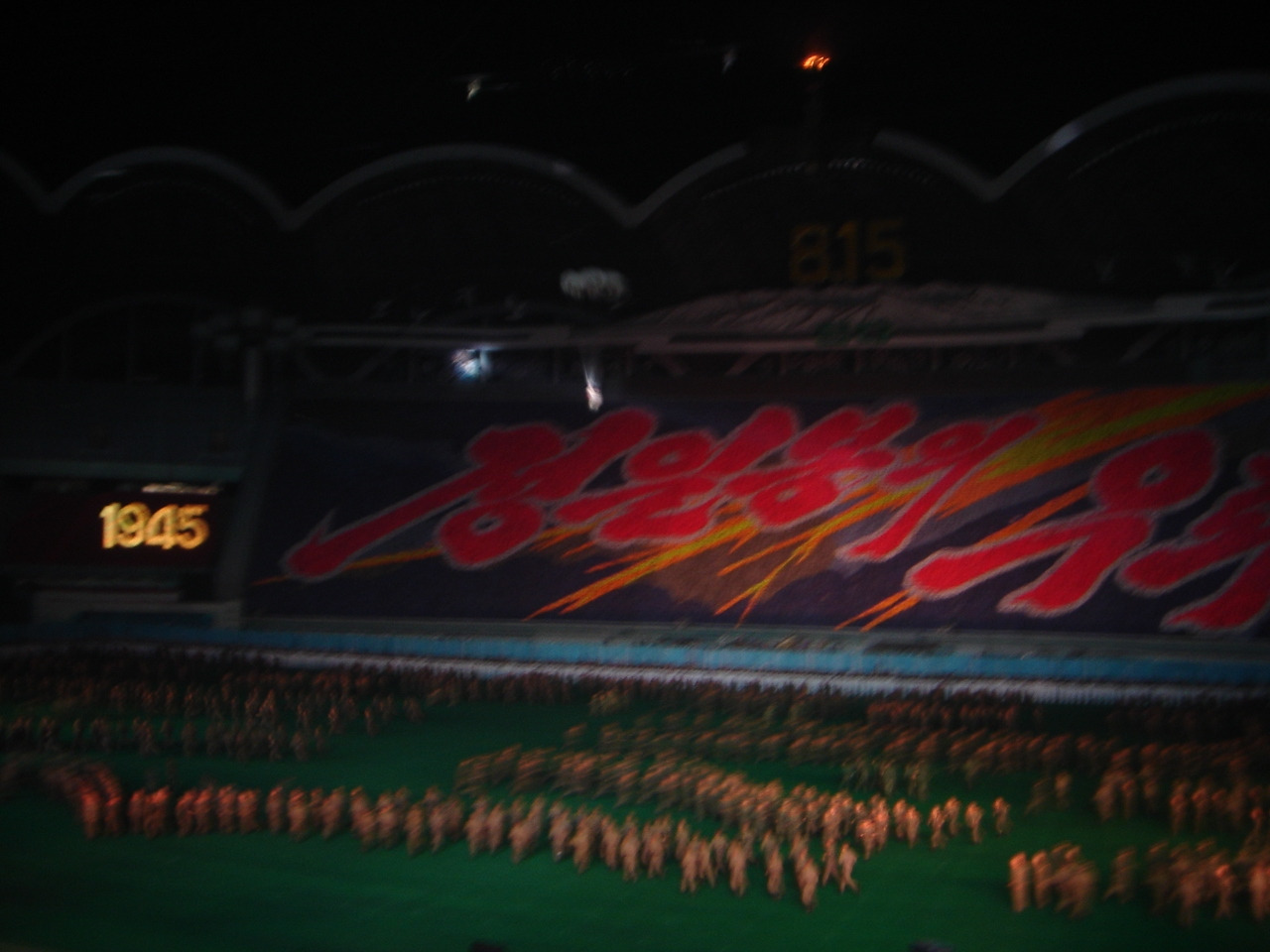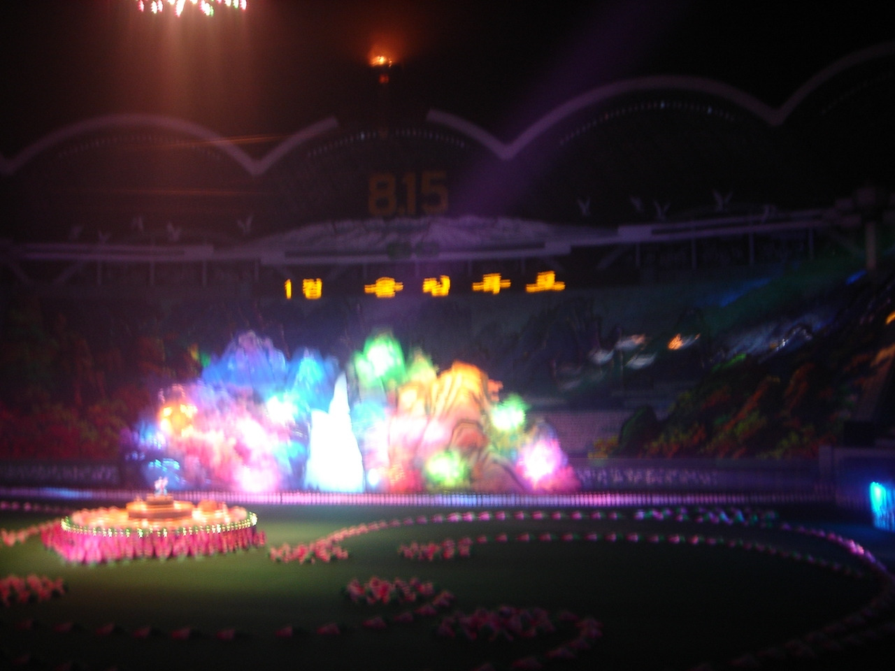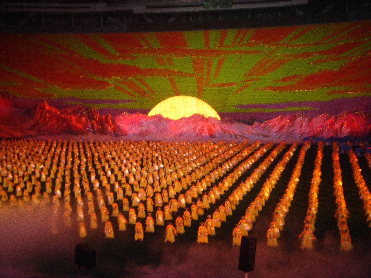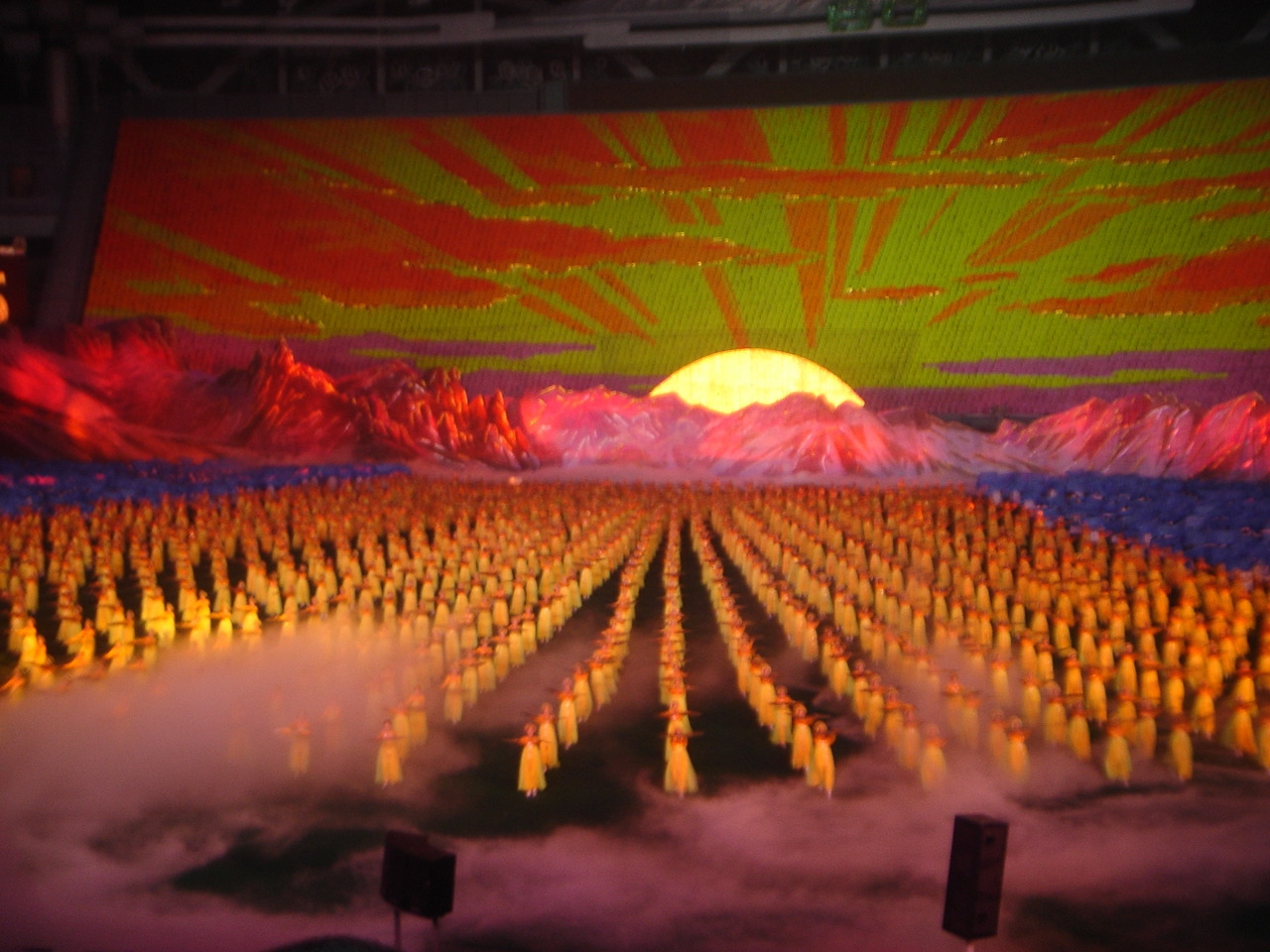 경기장 안으로 들어가자, 우리의 좌석이 있는 중앙 스탠드의 맞은편에 5만 명의 카드섹션 인원들이 바늘 틈 없이 붙어 앉아서 카드 섹션의 예행연습을 열심히 하고 있었다. 운동장의 바닥에도 공연 마스게임이나 다른 공연을 준비하는 모습이 보였다. 안내원의 설명에 따르면, 공연의 주 테마는 해방 전에 어려웠던 시기에 아리랑을 부르면서 가족들이 뿔뿔이 흩어지거나 만주로, 일본으로 끌려가는 고난을 당하다가 김일성의 민족 해방 투쟁에 힘입어 광복이 되고, 그의 탁월한 영도력으로 나라와 경제가 발전하며, 모든 인민들이 행복해지는 그런 것을 그린 것이다. 그러면서 사회 각 분야의 발전상과 위대한 지도자의 영도력을 춤과 마스게임, 카드섹션, 음악, 특수 조명, 특수효과 등을 총 동원해서 표현하는 것이다.