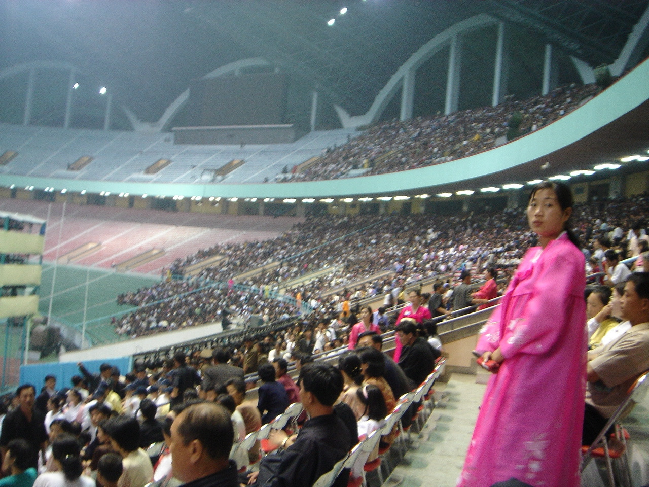 상상 외로 많은 인파가 몰려왔다. 평양 시내에서 능라도로 들어가는 길이 관광버스로 긴 줄을 이루고, 경기장의 주차장도 버스들로 만원이다. 외국인들도 가끔 있지만 북측 주민이 거의 대부분이었다. 안내원의 말로는 북한 주민은 평생에 한 번은 이 공연을 보아야 한다고 했다. 실제로 북측 인민의 15% 정도는 이 공연을 본다고 하는데, 지방에서 버스나 기차를 타고 단체로 와서 이 공연을 본단다. 보고 나서 여관이나 친척집에 자고 가거나 가까운 지역 사람들은 밤에 다시 내려간단다. 경기장은 우리의 잠실 주 경기장 보다 두 배는 커 보였다. 하긴 그들이 우리의 88 올림픽을 보고 경쟁심에서 15만 명(2014년에 재건축하여 114,000명으로 축소됨)을 수용하는 8층 높이의 거대한 16개의 철근 콘크리트 아치를 세워 건설한 것이란다. 전체적으로 보면 대동강에 피어 있는 연꽃 모양을 형상화한 것처럼 보이는데, 보기에 따라서 미확인 비행물체인 UFO처럼 보이기도 한다. 타원형의 경기장 관람석 중 긴 쪽의 한편을 거의 카드섹션 학생들이 차지하고, 나머지 부분만 관람석이다. 이곳에서 북측이 자랑하는 <아리랑>을 공연하는데 공연에 동원되는 인원이 7만 명이란다. 카드섹션에 동원된 학생이 5만 명, 운동장에서 공연하는 사람이 2만 명이라니 정말 세계 최대의 공연 행사일 것이다.