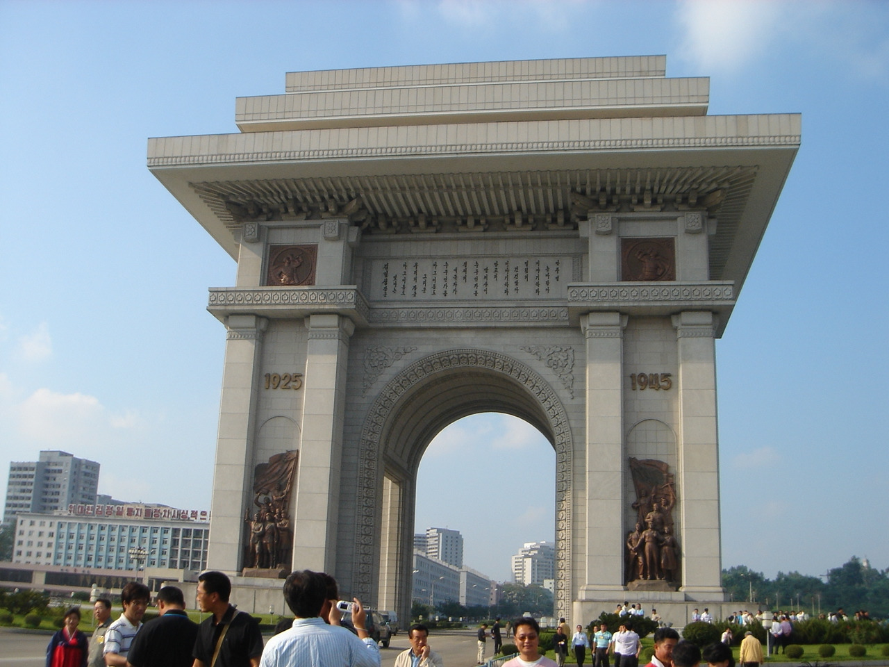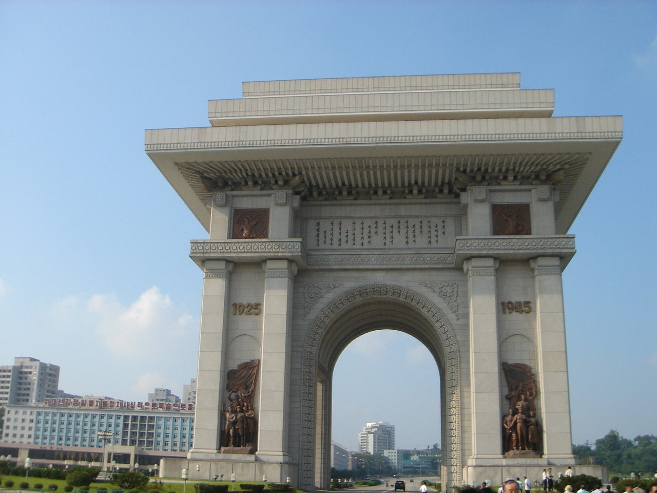 우리 일행은 다음으로 개선문(凱旋門)으로 향했다. 평양의 개선문은 모란봉구역 개선문 광장에 있는 엄청 큰 석조 건축물이다. 파리의 개선문처럼 디자인된 것으로 파리 개선문보다 10m 높단다. 김일성이 1925년 항일운동을 위해 조국을 떠났다가 1945년에 돌아온 것을 기념하여 그 연도가 남쪽 면에 커다랗게 조각되어 있다. 사방으로 문이 나서 차들이 통행을 하며, 김일성의 찬가들이 새겨져 있다. 개선문 옆에 김일성 경기장이 있고, 지하철 개선문역이 있다. 평양 개선문은 12개의 방과 난간, 감시용 난간과 엘리베이터를 갖추고 있다고 한다. 자랑만 들었을 뿐 내부나 개선문 위로 올라가 보지는 못하게 했다.