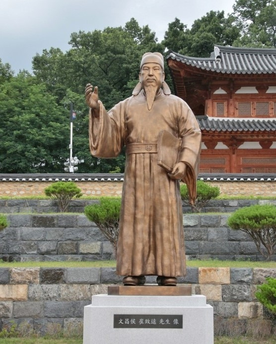 ★ 崔致遠(최치원) : 9세기 통일신라 말기의 학자이다. 호는 고운(孤雲)·해운(海雲)이고, 중국 당 나라에서 ‘토황소격문(討黃巢檄文)’으로 문장가로서 이름을 떨쳤으며, 신라로 돌아온 뒤에는 진성여왕에게 시무책을 올려 정치 개혁을 추진하였다. 유교(儒敎)·불교(佛敎)·도교(道敎)에 모두 이해가 깊어 통합 사상을 제시하였다. 수많은 시문(詩文)을 남겨 한문학의 발달에도 기여하였고 문집 계원필경(桂苑筆耕)이 있다. 최승우(崔承祐), 최언위(崔彦撝)와 더불어 일명(一名) 신라 3최(三崔)라 칭한다.
