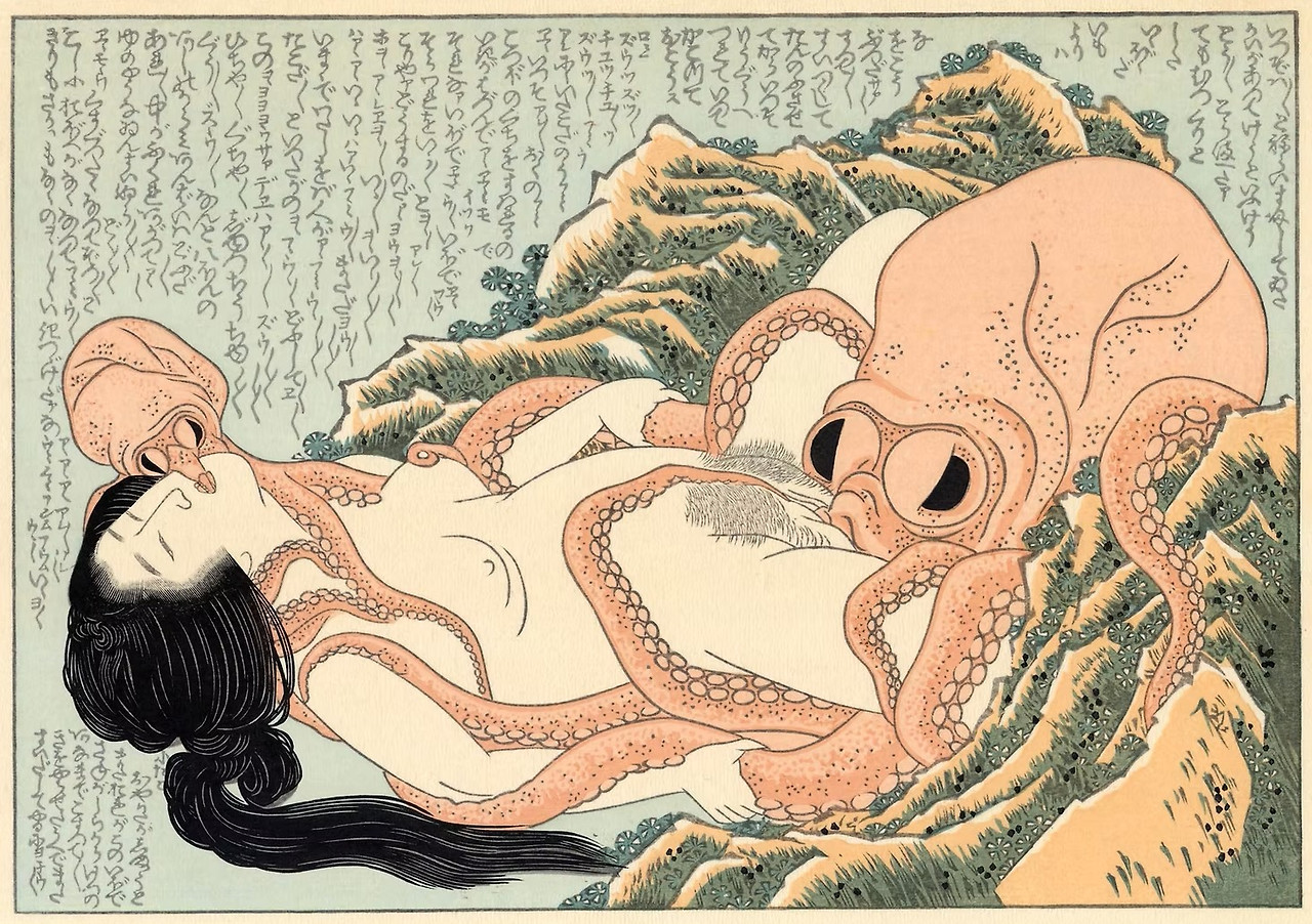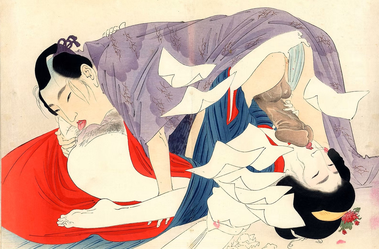 위의 작품이 호쿠사이 춘화의 대표작 <어부 아내의 꿈>이다. 200여 년 전에 어떻게 이런 그림을 상상이나 했을까? 마치 현대의 미국 화가 타비타 베버스(Tabitha Vevers)의 초현실적인 그림을 보는 것 같다.(https://brunch.co.kr/@0306a641d711434/620)참조바람. 필자 금삿갓은 2004년에 동계올림픽 개최지였던 나가노에 출장 가서 나가노시에 있는 호쿠사이미술관에 들렸다. 당시 그의 생애와 작품 중의 일부, 특히 만화(일본 만화의 원조임)를 보고 무척 충격을 받은 적이 있다. 그는 90 평생을 살면서 인간의 모든 행동과, 기생·스모선수·배우 등을 포함한 역사상의 인물, 후지산·폭포·다리등의 풍경, 벌레·새·화초·건물, 불교 도구나 요괴·코끼리·호랑이·용 등의 가공 생물, 파도·바람·비 등의 자연현상에 이르기까지 삼라만상을 그려 생애에 3만 4천 점이 넘는 작품을 남겼다. 다작이면서 천재적인 화가 피카소도 그림, 판화, 조각, 도자기 등 일생동안 3만여 점을 남겼다는데, 그래도 정말 어마 무시한 숫자이다. 피카소는 다양한 여자들과 줄기차게 사랑을 나누면서 재미있게 90세를 넘겼느데,이 괴짜 화가는 너무 재미었게 살면서 그림만 그렸는데 90세 가까이 살았으니 환쟁이 직업이 좋은가 보다. 아래는 호쿠사이가 아니라 이케다 데루카타의 작품이다. 현대의 에로 비디오에서나 볼 법한 과감한 '69(Six Nine)' 자세이다. 여기도 여지 없이 성기는 과장되어 있다. 그에 비해 여인의 입과 혀는 앙증맞다. 대비의 미학이랄까?