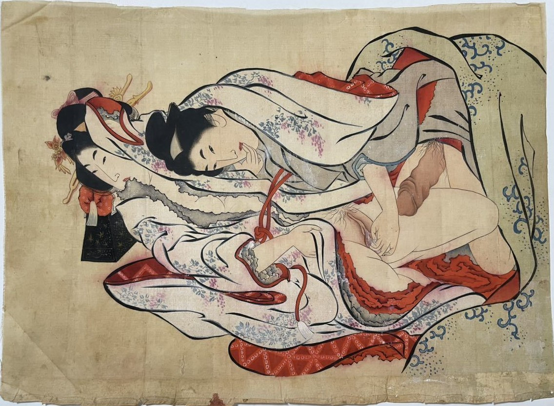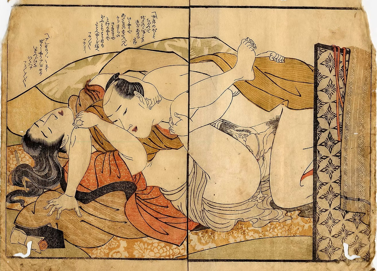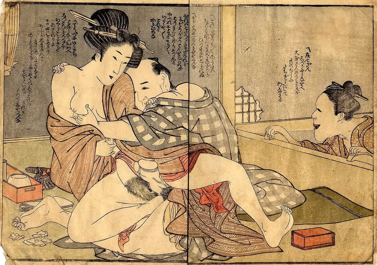 위의 그림은 훔쳐보는 구도의 그림이다. 제목은 <참견하는 여인>이다. 불구경과 싸움 구경보다 정사 장면을 훔쳐보는 것이 제일일 것이다. 일본의 춘화는 전투에 참여하는 사무라이의 사기를 진작시키는 데 사용되며, 재앙을 막기 위한 부적, 젊은 커플을 위한 성교육 자료로 사용되기도 했다. 당시 많은 여성들에게도 사랑받은 것 같다. 기록에 따르면 원래 춘화 한 두루마리는 은 50몬(文)으로 콩 300리터 가격과 같아서 매우 비쌌다. 그래서 목판화로 대량 제작하면 대량 유통이 가능했다. 1719년 조선통신사의 일원으로 일본에 다녀온 신유한(申維翰)이 지은 <해유록(海遊錄)>에서 “일본 남자들마다 품속에 운우도(雲雨圖)를 넣어 갖고 다닌다.”라고 할 정도로 인기도 많고, 유통도 많았을 것이다. 그러니 이런 그림이 서양으로 팔려나가는 도자기의 완충재로 쓰였다. 그런데 메이지 유신 이후에는 춘화의 유통을 단속해서 2015년까지 소위 "성진국(性進國)"으로 불리는 일본에서 춘화의 전시회가 열리지 못했다.