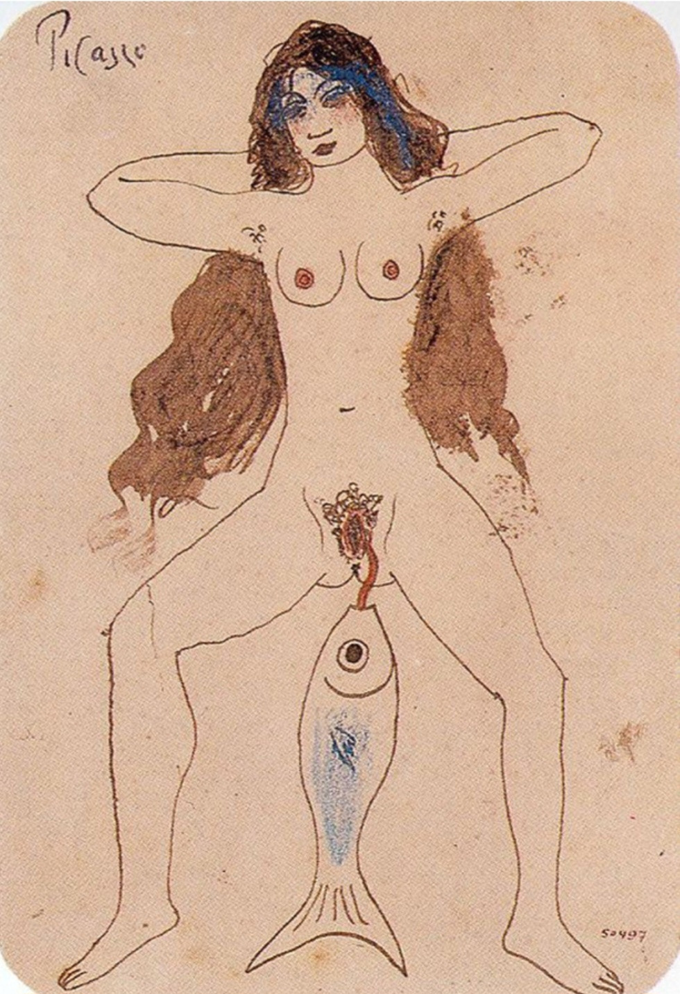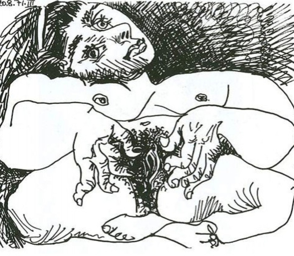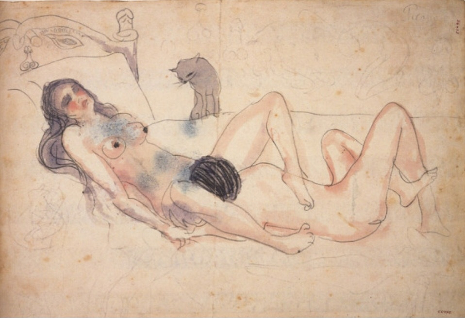 위는 같은 시기의 <두 사람과 고양이(Two Figures and a Cat)>이다. 두 남녀의 질탕한 방사(房事) 장면을 호기심 어린 눈으로 바라보는 고양이다. 여성은 이미 남성의 Cunnilingus(구강애무)로 정상에 한번 도달한 듯 얼굴이 홍당무이고, 눈은 게슴치레를 넘어 완전 감겼다. 피카소가 흥취에 겨워 슥슥 그려낸 이런 그림은 현장성이 강하게 드러나는 생생한 스케치다. 해보지 않았다면 표현할 수 없는 순간 포착의 긴장과 두 남녀가 벌이는 진한 분위기를 작가의 단순한 상상력만으로 표현하기에는 사실감이 덜어질 수 있겠다. 그는 어릴 때부터 홍등가의 후미진 구석을 누비고 다녔고, 동행했을 친구의 모습에서 피카소는 자신을 대입시켰을지도 모른다.