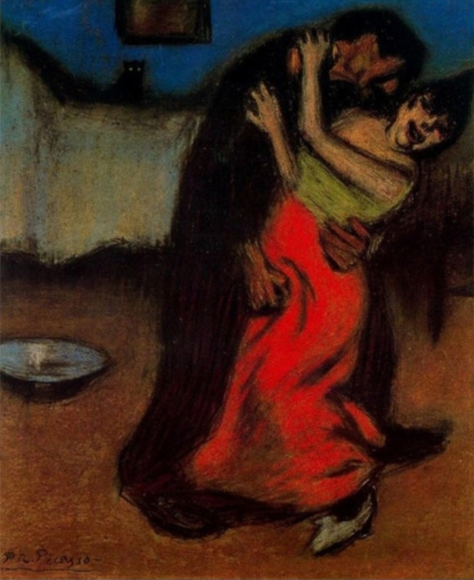 피차소의 청색시대 작품인 <잔혹한 포옹(The brutal embrace)>이다. 남성은 그야말로 약간 폭력적 도전을 하고 있다. 왼손으로 여자의 허리를 도망 못 가게 강력하게 감아 안고, 오른손으로는 치마를 걷지도 않은 채 힘이 잔뜩 들어간 모양으로 깊숙이 공략한다. 19살의 그가 이런 강렬한 그림을 그릴 수 있다는 게 굉장한 관심거리이다. 그 당시 바르셀로나의 아비뇽 거리 사창가를 주름잡았던 실력이 아닐까? 여자가 강렬히 밀어내지만 역부족이다. 침대 머리맡에서 강렬한 눈빛을 쏘면서 노려보는 고양이가 이채롭다. 여성의 초록 상의와 붉은 치마가 그림의 완결성을 보조하고 있는 듯하다. 아무튼 거장(巨匠)이다.