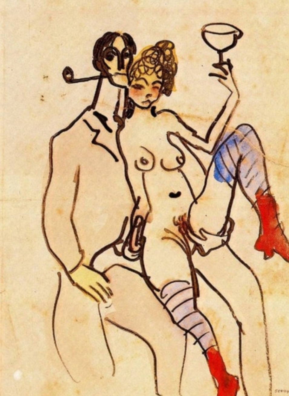 그의 이른 시기인 청색시대의 <앵겔 페르난데즈와 여인(Angel Fernandez de Soto mit einer Frau)>이다. 이 시기에 그는 바르셀로나 아비뇽거리의 홍등가가 미술 교실이었다. 친구 카를로스 카사헤모스와 같이 매춘녀 제르맹 피쇼(Germaine Gargallo Pichot)와 늘 함께했다. 남녀가 서로를 열심히 희롱하는 분위기. 포도주에 흠뻑 취해 얼굴이 홍당무가 된 여인이 도발적으로 남자의 무릎에 앉아 있다. 왼손에는 마시다 만 와인 잔을 추켜들고 오른손으로는 남성의 중심을 꽉 움켜쥐고 오늘 포획한 힘찬 고래를 놓칠 새라 성급하게 쾌락의 축배를 든다. 그녀는 역시 금삿갓의 애로서(曖露書)를 알고 있다. 가릴 것은 가리고 노출할 것은 노출하는 것이 더 흥미가 있는 법. 프로답게 최소한 몸을 가려, 그래서 완전한 나신보다 더 섹시하게 보이도록, 스타킹과 빨강구두로 무장을 하고 있다. 한껏 점잖을 뺀 얼굴이지만 남자는 이미 성의 탐욕에 마음 보단 몸이 먼저 행동한다. 앙다문 입에 파이프 담배를 물고 두 눈에 힘을 주고 있지만 여자 옆으로 살짝 가린 왼팔과 손은 열락의 문을 찾아서 낮은 데로 임하소서이다. 욕망의 길이만큼이나 긴 손가락은 이브를 유혹한 뱀의 혀처럼 동굴 속으로 진입하고 있다. 남성의 위신과 체면치레는 이미 여성의 손에 잡혔고, 은밀한 욕망은 꿀단지 속으로 빠지고 말았다.
