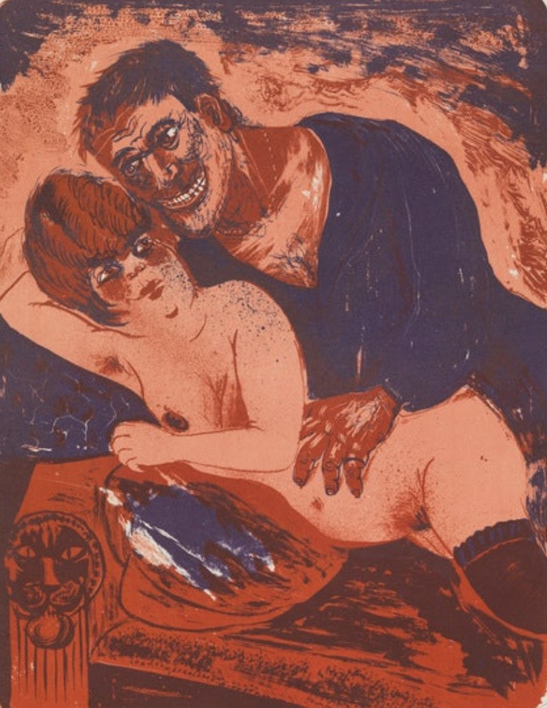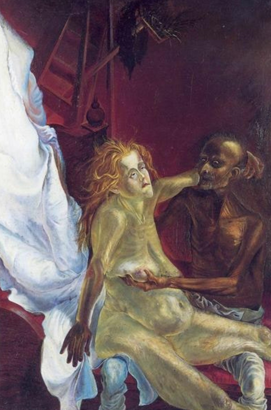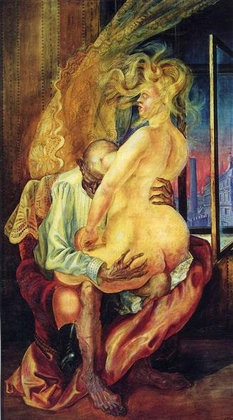 위의 대문 작품은 <공허(Vanitas)>이다. 한창 젊은 여인과 해골이 다 된 노인의 누드를 대비시켜 인생의 허무를 표현했다. 아래는 오토 딕스의 1923년 작품 <선원과 소녀(Matrose und Madchen)>이다. 퇴폐적인 분위기에서 롱부츠만 신고 발가벗은 매춘부가 팔베개를 하고 누워있고, 욕망에 얼굴이 씨뻘거진 선원이 바짝 붙어서 누워있다. 여인의 허리에 감긴 손은 힘든 뱃일의 경력을 고스란히 담은 채 욕망의 이상향을 찾아서 진군하고 있다. 두 사람의 표정과 전체적인 분위기는 전후 독일 사회의 어두운 면을 드러내는 신즉물주의(Neue Sachlichkeit) 경향을 보여준다. 이 작품은 석판화로 제작되었으며, 강렬한 색채와 대비를 통해 당시 사회의 퇴폐적인 분위기와 불안감을 효과적으로 전달하고 있다. 붉은색과 짙은 푸른색의 강렬한 대비는 불안하고 격정적인 분위기를 강조하는 듯하다. 인물들의 왜곡된 형태와 과장된 표정은 당시 사회의 불안과 공포를 드러낸다. 제1차 세계 대전 이후 전쟁의 상흔(傷痕)과 트라우마가 지배하는 독일 사회의 혼란과 절망은 그 시대를 살아보지 않고는 그 절망감을 모른다. 이런 틈바구니에서 개인들은 쾌락주의와 허무주의를 추구하여 각종 부조리와 모순을 잉태하는 것이다. 화가는 인물들의 단절된 관계와 불안한 표정으로 인간 소외와 상실감을 드러내고자 했을 것이다.