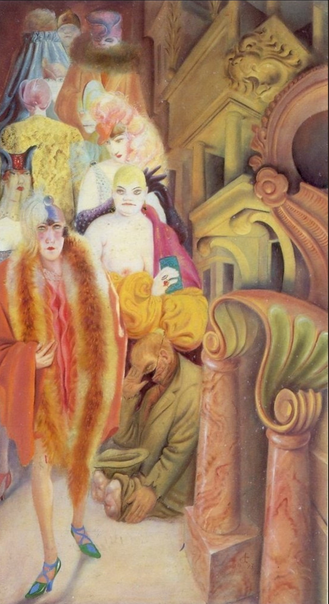 그림이 겉보기에는 매우 화려하고 화사한 분위기이다. 그러나 자세히 보면 전혀 아니다. 그의 작품 <메트로폴리스>이다. 대도시는 두 가지 면을 동시에 품고 있는 인간의 보금자리이다. 화려하고 밝은 불빛이 찬란한 것이 있는 이면에 어둡고 침침하고 우울한 곳도 공존한다. 거리의 여자들은 화려하게 치장하고 거리를 활보하면서 어딘가로 움직인다. 일터일 수도 있고 환락을 찾아가는 것일 수도 있다. 화려한 여인들의 발치에 어둠이 도사리고 있다. 길 위에 퍼질러 앉아서 행인들에게 한 푼의 적선을 구하려고 모자를 벗었다. 모자를 벗은 것은 권위를 벗은 것이다. 남성의 권위는 날씬한 각선미의 여인의 하이힐 뒷굽에 밟혀버린 것이다. 화려한 장식의 대리석 파사드와 건물들의 실루엣이 도시의 밝은 면을 더욱 강조하지만 뭔가 공허한 느낌이다. 고가의 숄을 걸친 여인의 상의는 그녀의 성기 모양을 닮았다. 가슴을 드러낸 여인과 성기 모습의 복장을 한 여인이 도시의 화려한 불빛 속에서 명명하는 것이다. 에로티시즘과 니힐리즘이 동시에 묻어나는 묘한 감정이다.