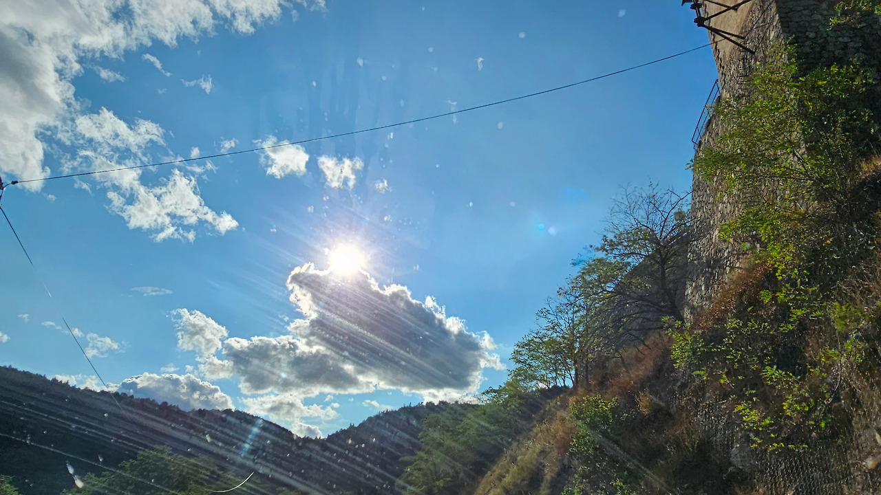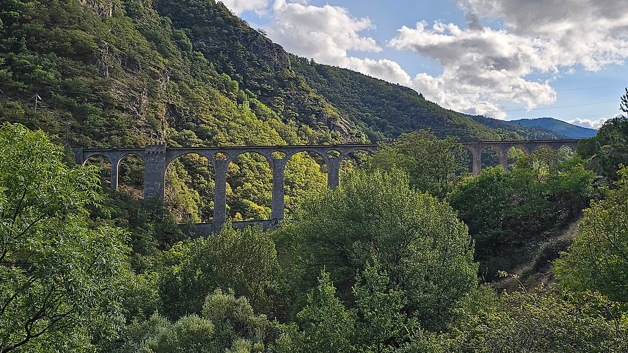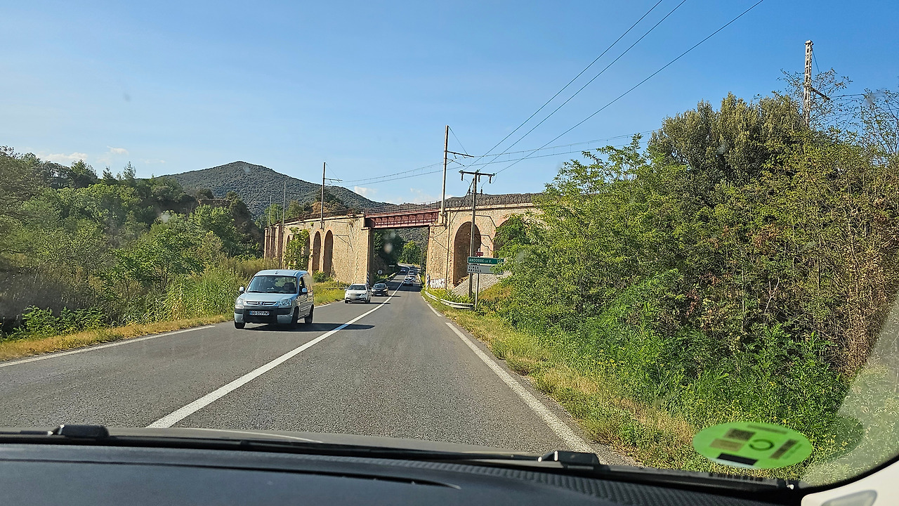 언덕은 어느 정도 올라가면 기스클라르 다리(Pont Gisclard)를 조망할 수 있는 전망 포인트가 있다. 이곳에 차를 세워두고 전망도 구경하고 사진도 찍곤 한다. 기스클라르 다리는 철도용 다리인데 현수교로 지어졌다. 철도는 세르다뉴(Cerdagne) 노선의 노란색 기차가 빌프랑슈 드 콩플랑에서 라투르 드 카롤까지 간헐적으로 지나간다. 푸른 하늘과 푸근 산속을 가로질러 가는 노란 기차의 모습이 이채롭다. 이 철로가 건설된 지가 120년이 넘었단다. 이 다리의 설계자가 기스클라르이고 전망지점에 그의 얼굴 형상의 동판을 만들어 우리의 비석처럼 조형물을 세워놓았다. 계곡 저 멀리로 꾸불꾸불한 도로가 마치 지렁이가 기어가듯이 보인다. 이곳의 해발 고도는 그리 높지는 않고 400m 정도이다.