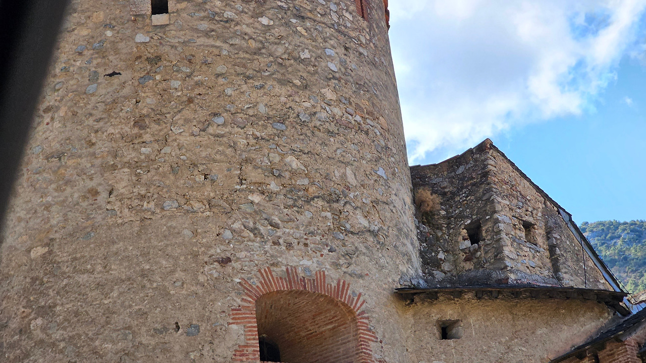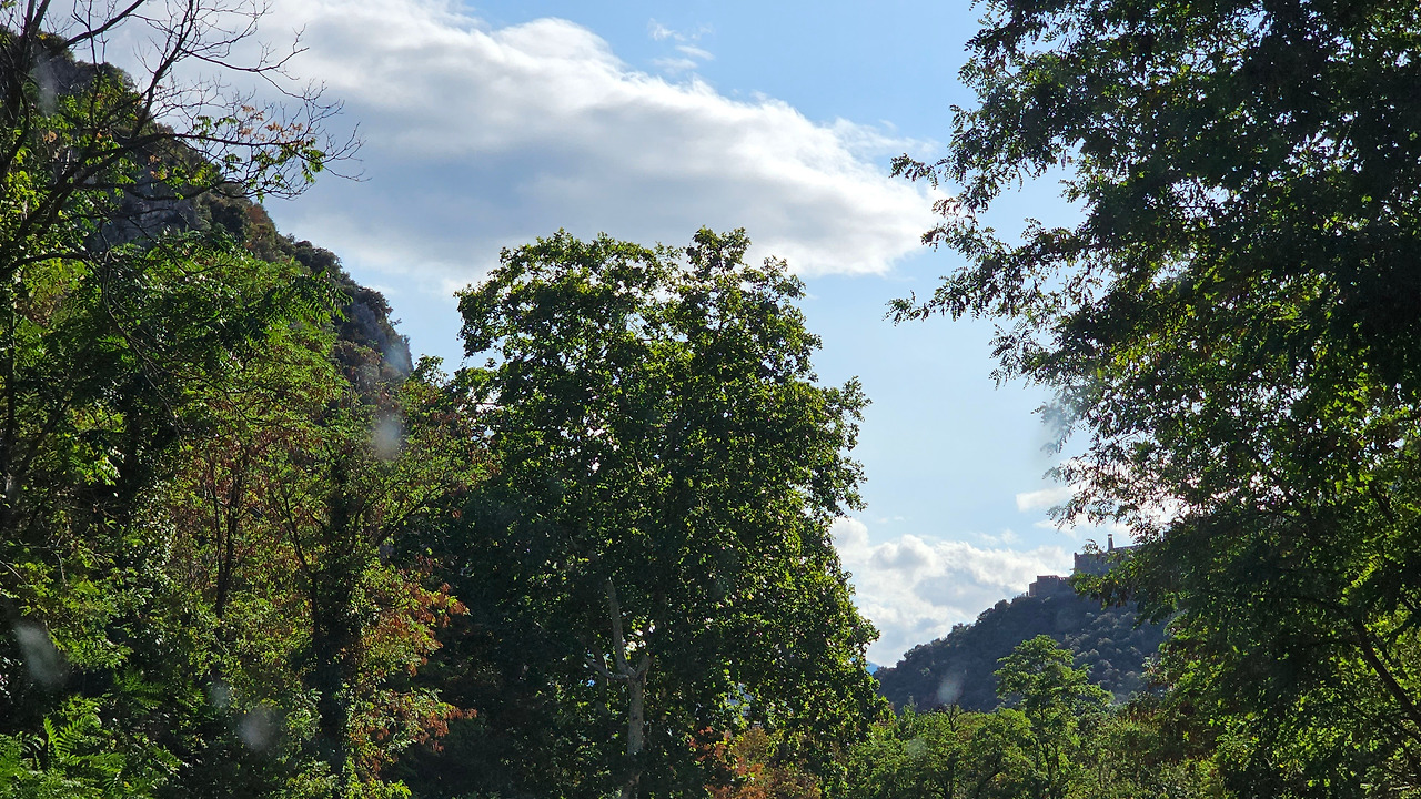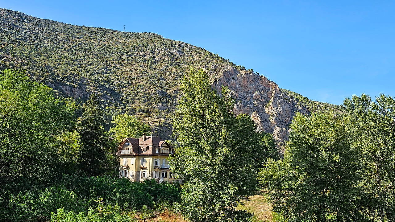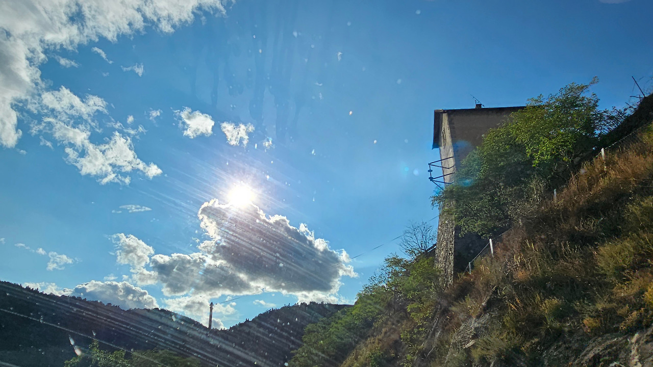 언덕은 어느 정도 올라가면 기스클라르 다리(Pont Gisclard)를 조망할 수 있는 전망 포인트가 있다. 이곳에 차를 세워두고 전망도 구경하고 사진도 찍곤 한다. 기스클라르 다리는 철도용 다리인데 현수교로 지어졌다. 철도는 세르다뉴(Cerdagne) 노선의 노란색 기차가 빌프랑슈 드 콩플랑에서 라투르 드 카롤까지 간헐적으로 지나간다. 푸른 하늘과 푸근 산속을 가로질러 가는 노란 기차의 모습이 이채롭다. 이 철로가 건설된 지가 120년이 넘었단다. 이 다리의 설계자가 기스클라르이고 전망지점에 그의 얼굴 형상의 동판을 만들어 우리의 비석처럼 조형물을 세워놓았다. 계곡 저 멀리로 꾸불꾸불한 도로가 마치 지렁이가 기어가듯이 보인다. 이곳의 해발 고도는 그리 높지는 않고 400m 정도이다.