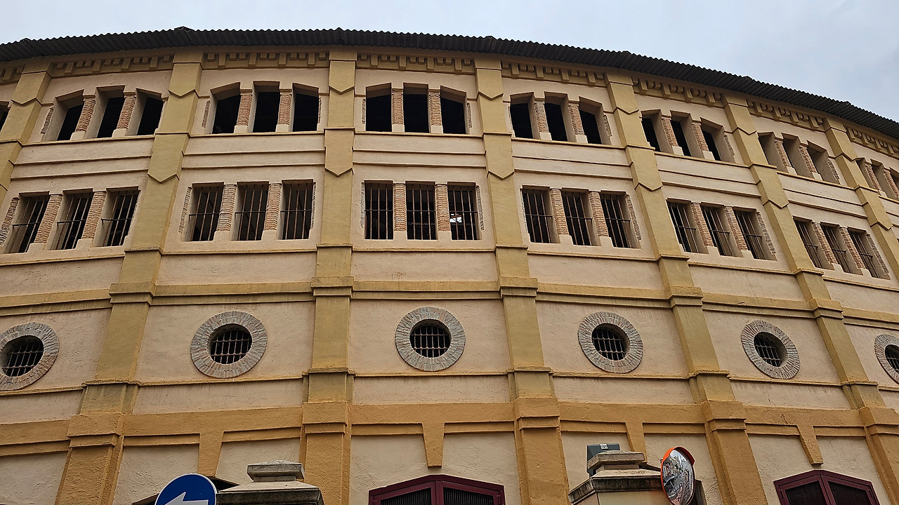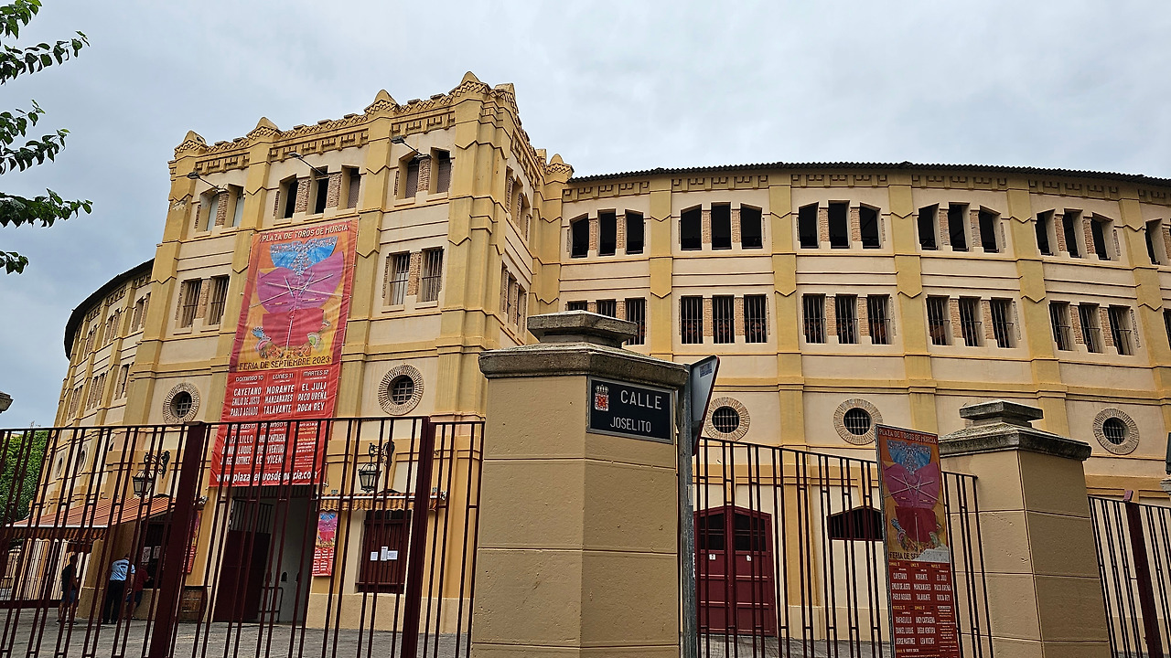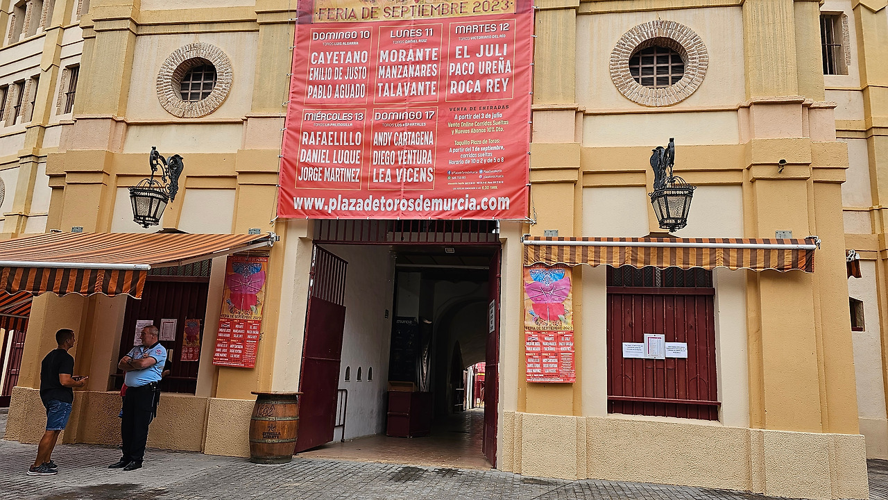 무르시아 투우장은 Plaza de Toros de Murcia로 석조 건물로 지어졌다. 1887년에 건축가 Justo Millan Espinosa가 디자인해서 지었다. 처음에는 18,000명을 수용하도록 했으나, 요즘은 15,000명을 수용한다. 스페인에서 한 때 투우가 엄청 유행했으나, 동물보호단체의 반대로 과거 공식적인 투우 경기는 대부분 사라지고 투우 경기의 흉내를 내는 정도의 밋밋한 투우 경기가 열리곤 한다. 금삿갓이 산티아고 순례길을 걸을 때 성 페르민 축제가 한창이던 7월의 팜플로나 지역도 투우 경기가 열리고 있었지만 그곳은 투우보다 골목의 소몰이 경기가 더 박진감 있고 인기가 높았다. 금삿갓이 무르시아의 투우 경기장을 방문했을 때는 경기 일정이 없어서 쉬는 날이었다. 이곳은 투우 보다 가수들의 공연장으로도 많이 이용되고 있다고 한다. 안내인이 경기가 없으니 투우가 열리는 운동장의 흙이라도 밟아보고 가라고 했서 운동장에 들어가서 둘러보았다.