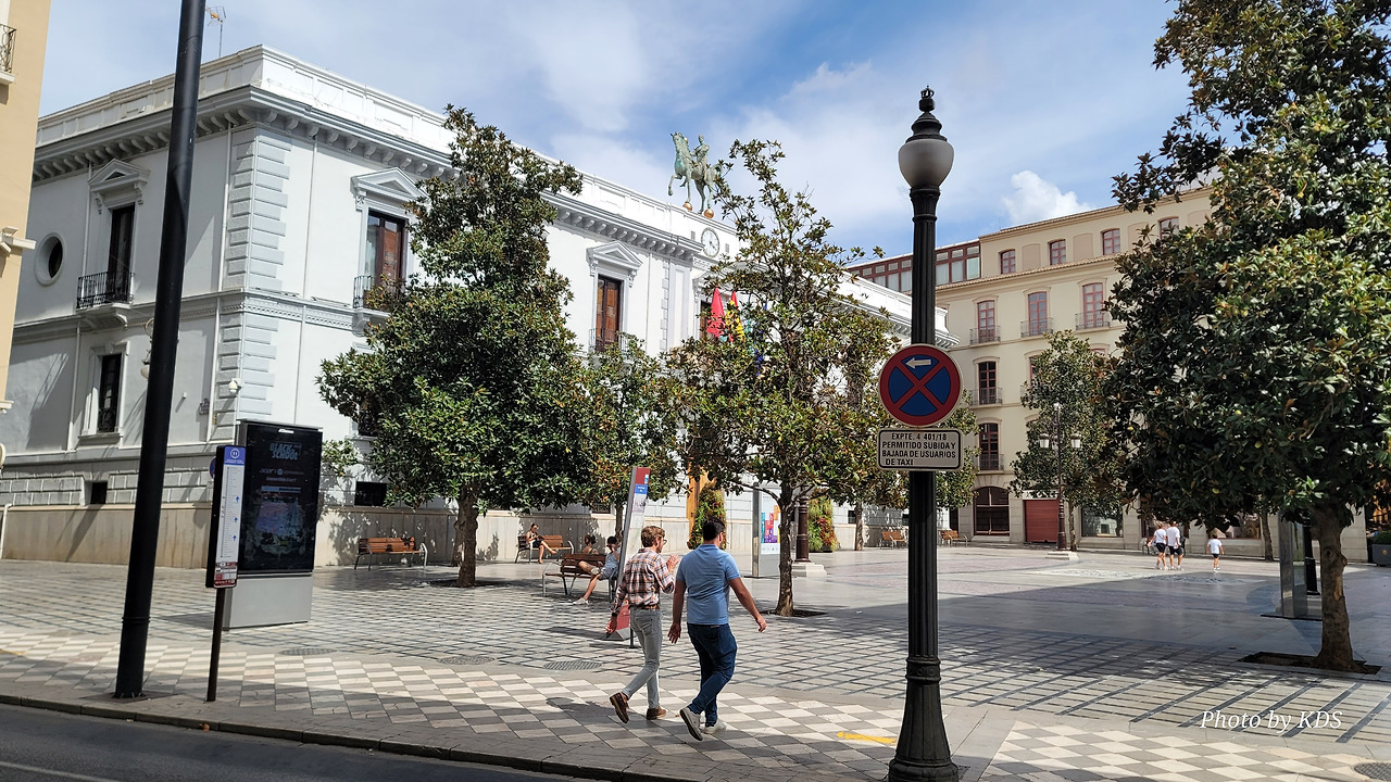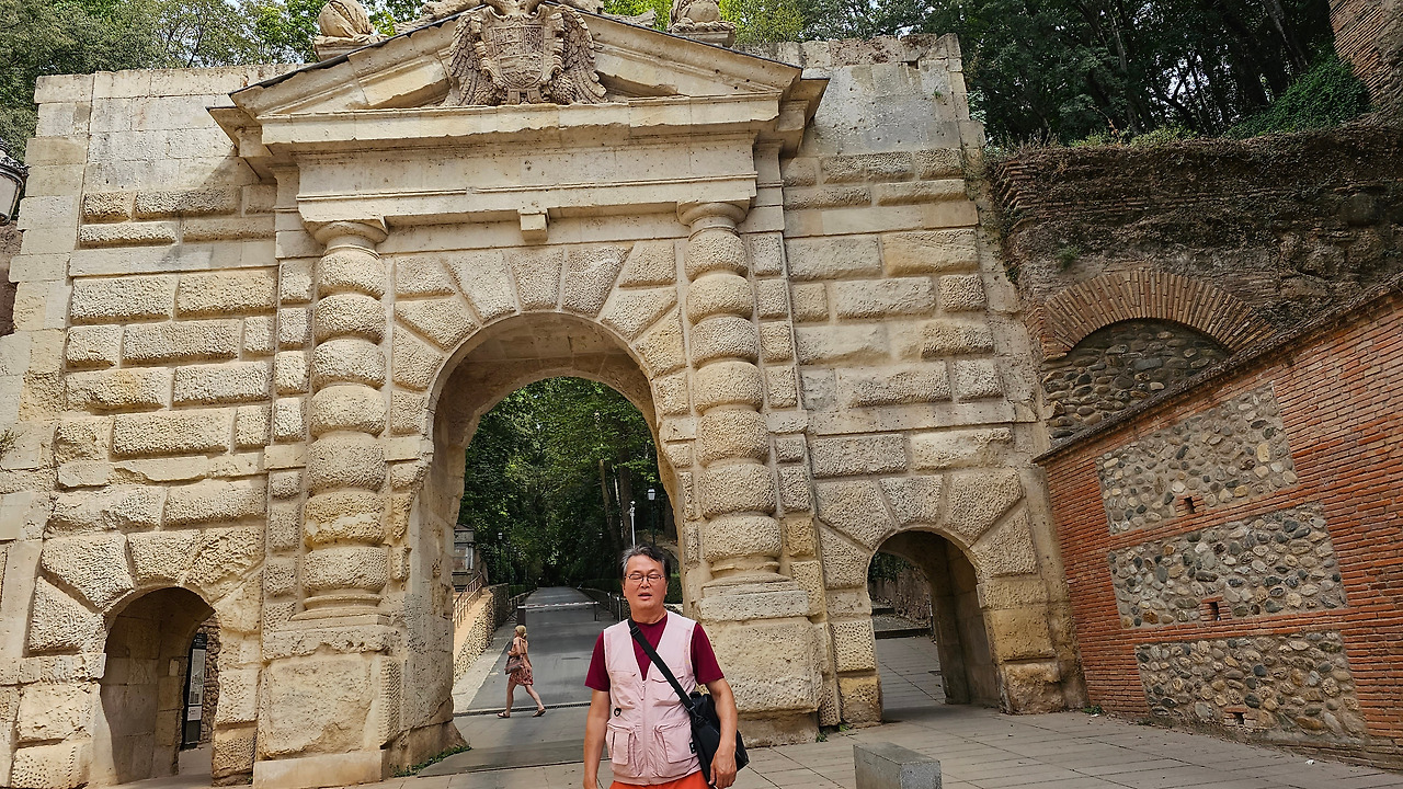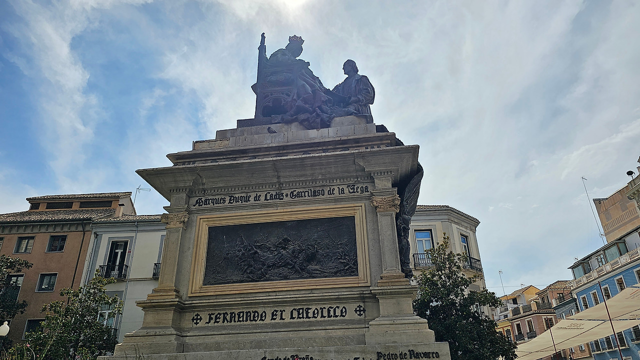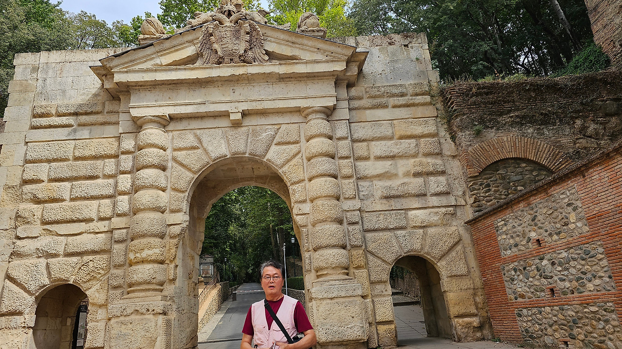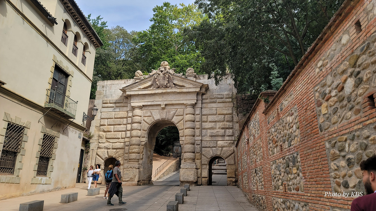 800여 년간의 이슬람 지배를 완전히 끊어낸 이사벨여왕이 이탈리아 제노바 출신의 선장 콜럼버스에게 신대륙을 탐험하도록 칙허장을 내린 곳이 바로 이 그라나다의 알람브라 궁전이고, 그 때가 바로 1492년 4월 17일이다. 이사벨여왕은 그곳에서 역사적으로 두가지의 중요한 결정을 한 것이다. 하나는 스페인에 거주하는 아랍인에게 기독교로 개종을 거부하는 사람은 추방하는 알람브라 칙령을 반포하고, 콜럼버스에게 신대륙 발견 탐험을 허가한 것이다. 그것이 오늘날 미국이 탄생하는 씨앗이 된 것이다. 그것을 기념하기 위해 그라나다에 이사벨 라 카톨리카 광장에 멋진 모양의 기념비가 세워져 있다. 이 기념비는 신대륙 발견 400주년을 기념하여 1892년에 조성된 것이다. 시내를 이리저리 돌아보고 가장 인기를 끌고 있는 궁전으로 가 봐야겠다. 궁전으로 가는 길에 숲길을 통해서 천천히 걸어가려면 웅장한 <석류의 문(Puerta de Granada)>를 통과해야 한다. 이 문은 로마의 개선문의 건축양식으로 1526년 카를로스 5세 때 건축되었다.
