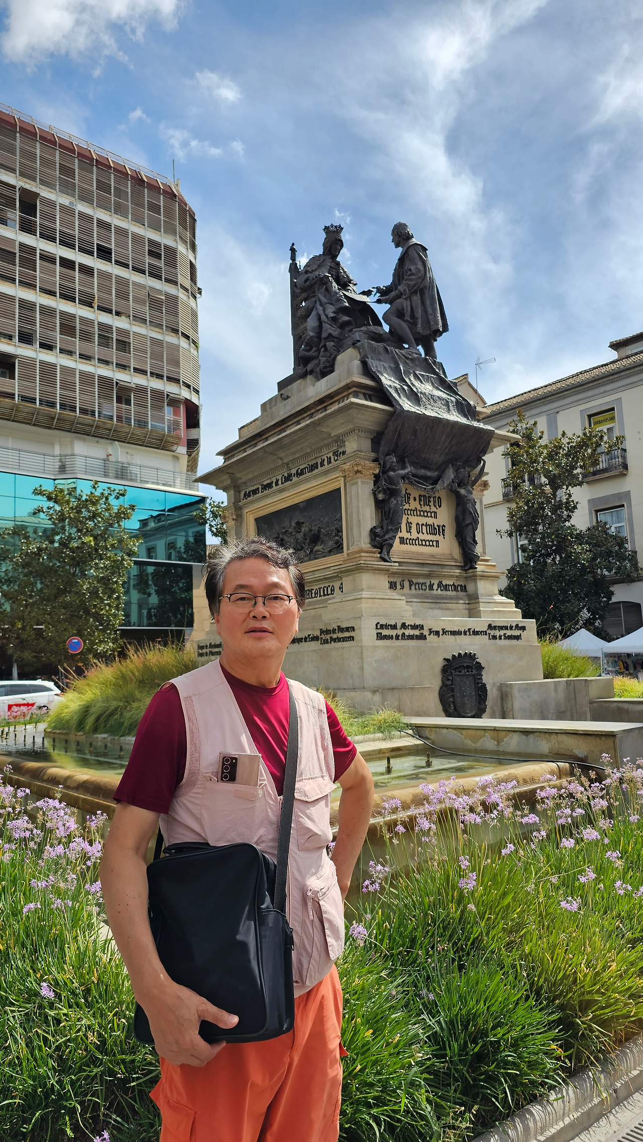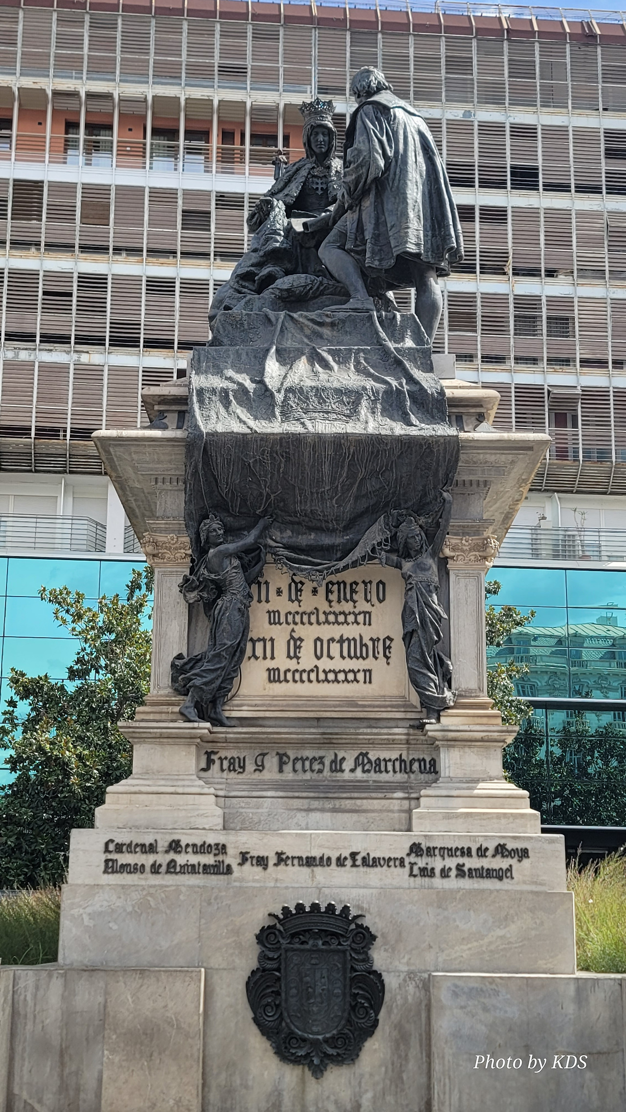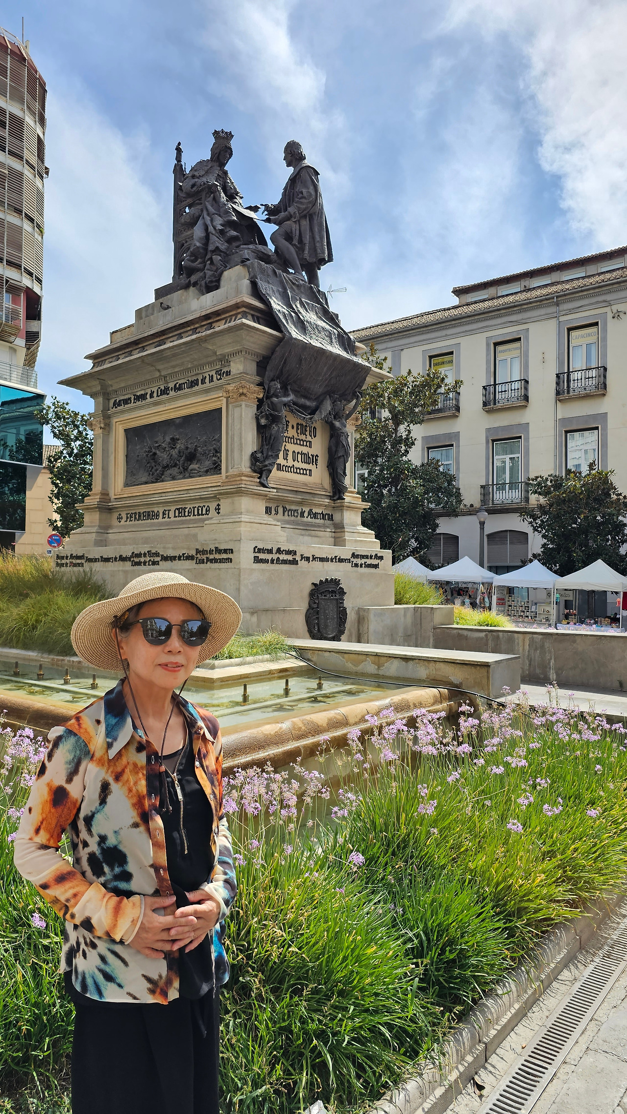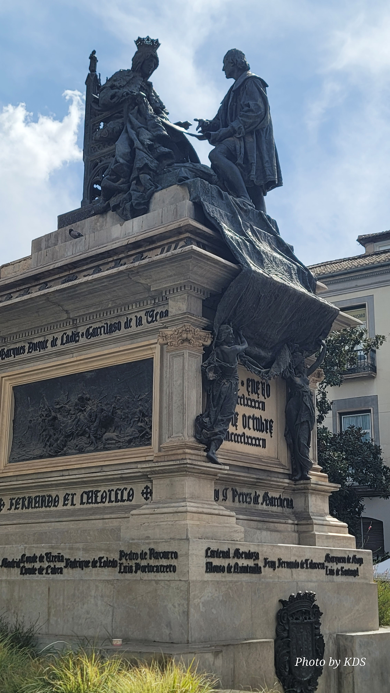 800여 년간의 이슬람 지배를 완전히 끊어낸 이사벨여왕이 이탈리아 제노바 출신의 선장 콜럼버스에게 신대륙을 탐험하도록 칙허장을 내린 곳이 바로 이 그라나다의 알람브라 궁전이고, 그 때가 바로 1492년 4월 17일이다. 이사벨여왕은 그곳에서 역사적으로 두가지의 중요한 결정을 한 것이다. 하나는 스페인에 거주하는 아랍인에게 기독교로 개종을 거부하는 사람은 추방하는 알람브라 칙령을 반포하고, 콜럼버스에게 신대륙 발견 탐험을 허가한 것이다. 그것이 오늘날 미국이 탄생하는 씨앗이 된 것이다. 그것을 기념하기 위해 그라나다에 이사벨 라 카톨리카 광장에 멋진 모양의 기념비가 세워져 있다. 이 기념비는 신대륙 발견 400주년을 기념하여 1892년에 조성된 것이다. 시내를 이리저리 돌아보고 가장 인기를 끌고 있는 궁전으로 가 봐야겠다. 궁전으로 가는 길에 숲길을 통해서 천천히 걸어가려면 웅장한 <석류의 문(Puerta de Granada)>를 통과해야 한다. 이 문은 로마의 개선문의 건축양식으로 1526년 카를로스 5세 때 건축되었다.