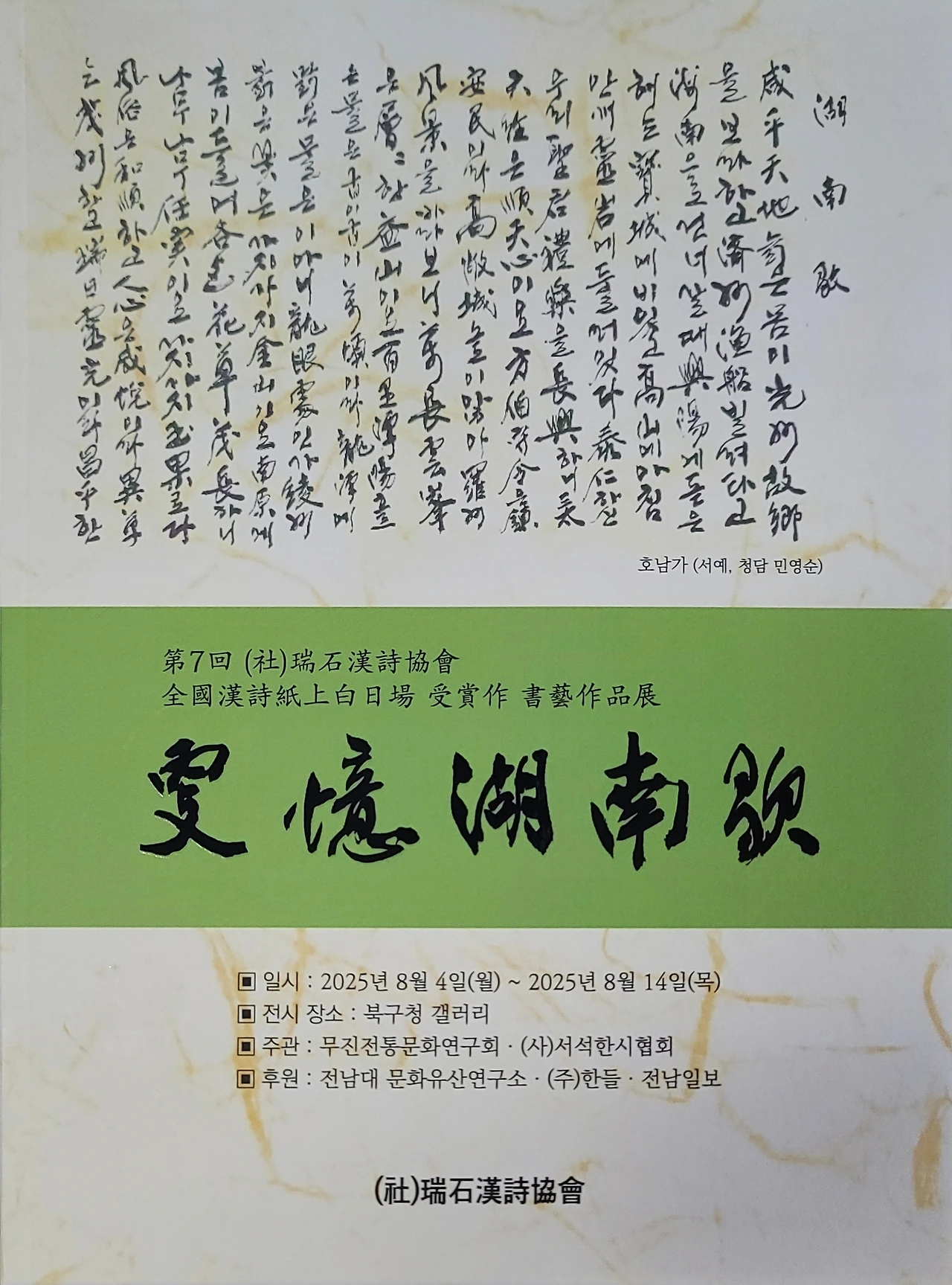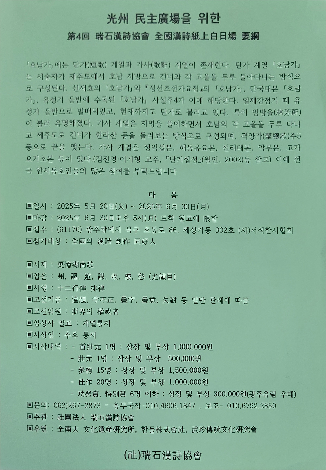 이 시(詩)는 광주 민주광장을 위한 제4회 서석한시협회 전국한시지상백일장에 출품하여 운 좋게 가작 20명 중의 하나로 입선된 작품이다. 시의 형식은 칠언배율(七言排律)로 총 12구절이며, 압운(押韻)은 ◎표시된 주(州), 구(謳), 유(遊), 모(謀), 수(收), 루(樓), 수(愁)이고 우운목(尤韻目)이다. 시제(詩題)가 <更憶湖南歌(갱억호남가) / 호남가를 다시 기억하다.>로 판소리 호남가에 대하여 작시하는 것이다. 호남가는 판소리 단가(短歌) 계열과 가사(歌辭) 계열이 있는데, 단가는 동리(桐里) 신재효(申在孝)의 사설집에 전하는 것을 명창 임방울(林芳蔚)이 불러서 유명해졌다. 노래의 내용은 호남 지방의 54개 고을을 두루 유람하는 내용으로 각 지방의 특색이나 풍경 등을 열거하여 애향심을 고취하고 지리의 학습에 도움이 된다.