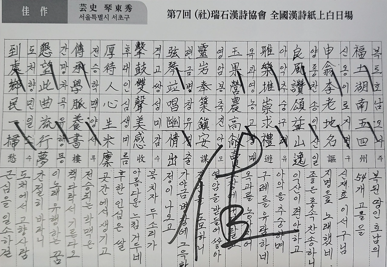 <금삿갓의 갱억호남가(更憶湖南歌) 응모 시제지(詩題紙)에 채점된 모습과 입선한 작품을 책으로 발간한 작품집 모습>>