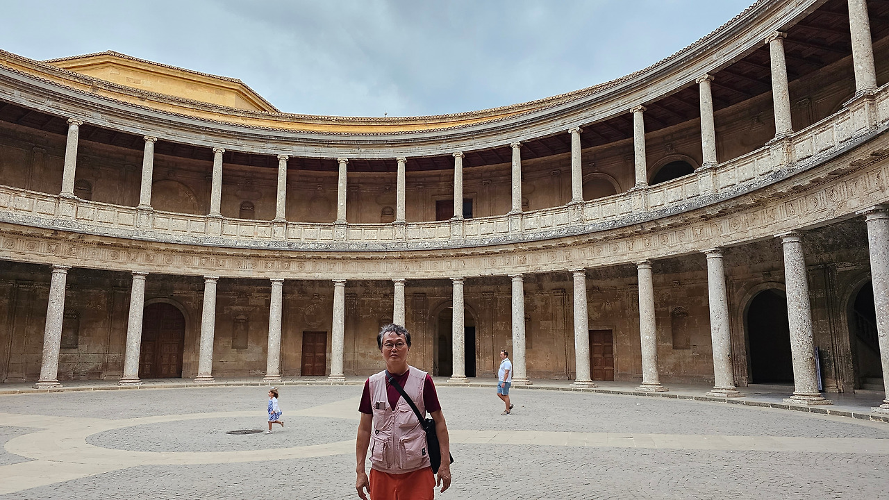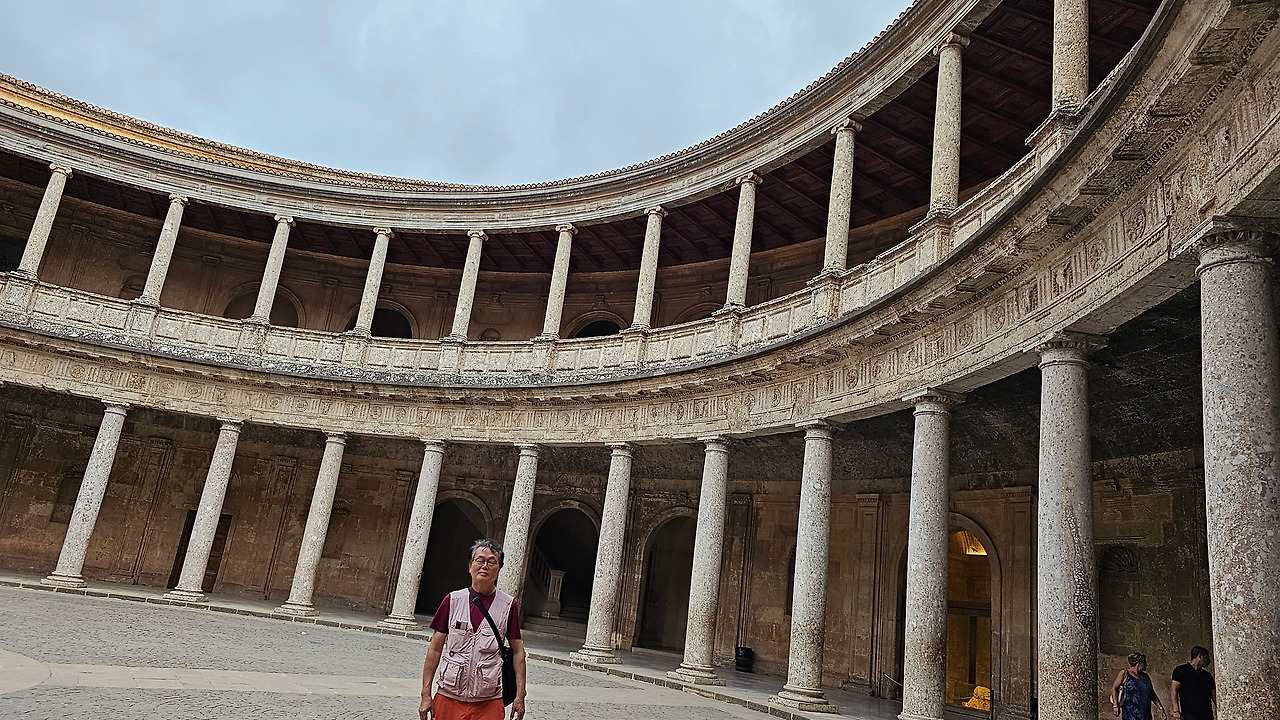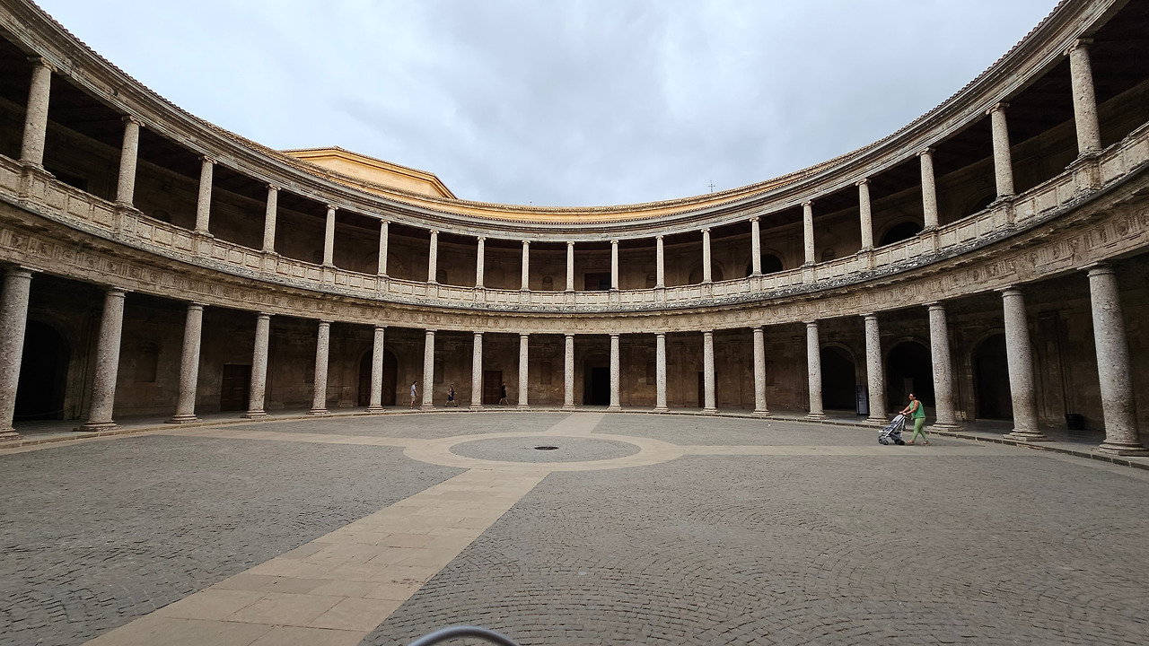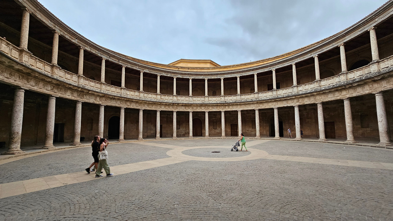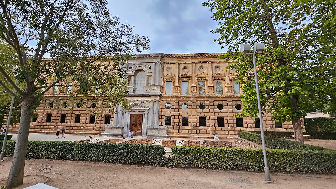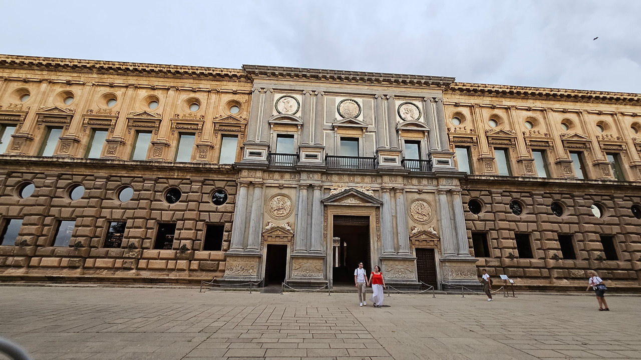 스페인 국왕이자 독일 황제 선출자인 카를로스(Carlos) 5세는 1526년 세비야에서 포르투갈의 이사벨(Isabel)과 결혼한 후 그라나다를 방문했다. 그때 그는 알람브라 궁전에 자신의 왕궁을 건설하기로 결정했다. 황제는 궁전을 로마 양식으로 건설하기로 결정했는데, 이는 아마도 알람브라 총독이자 카스티야에서 이탈리아 문화를 수용하는 데 중요한 역할을 했던 루이스 우르타도 데 멘도사(Luis Hurtado de Mendoza) 장군의 영향을 받았을 것으로 보인다. 하지만 이 궁전의 원형은 라파엘로와 줄리오 로마노의 친구였던 발다사레 카스틸리오네(Baldasare Castiglione)가 제안했을 가능성이 있다고 한다. 원래 프로젝트는 레오 10세의 로마 예술계에서 수학한 페드로 마추카(Pedro Machuca)가 설계했다. 그는 1533년부터 1550년(그가 사망한 해)까지 공사를 지휘했으며, 서쪽과 남쪽 문을 제외한 모든 외관은 완성되었다. 그의 뒤를 이어 아들 루이스가 원형 안뜰을 설계했지만, 1568년 그라나다에서 모리스코족의 반란으로 15년간 공사가 중단되었다. 1619년 안뜰의 상부 주랑이 완공되었고, 1637년까지 공사가 계속되었지만 예산상의 문제 등으로 이때부터 공사가 중단되었다. 궁전은 1923년까지 미완성 상태로 남아 있었는데, 레오폴도 토레스 발바스(Leopoldo Torres Balbás)가 박물관으로 사용하기 위한 복원 계획을 시작하면서 1958년 건축가 프란시스코 프리에토 모레노(Francisco Prieto Moreno)가 완공했다. 궁전의 양식적 선택은 평면도의 독창성, 정사각형 안에 내접하는 원, 그리고 르네상스 전성기 건축 양식의 사용을 통해 "로마 양식" 건축을 표현하고자 하는 확고한 열망에 기반했다. 필자 금삿갓의 눈에는 원형의 열주(列柱)가 정교하게 세워져 있는 파티오가 매우 인상적이었다.