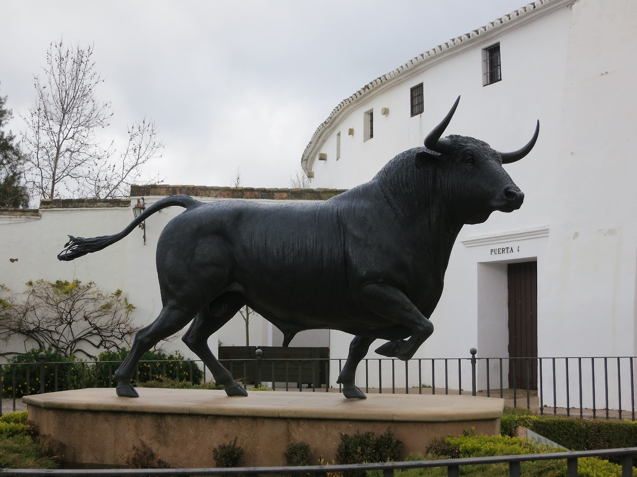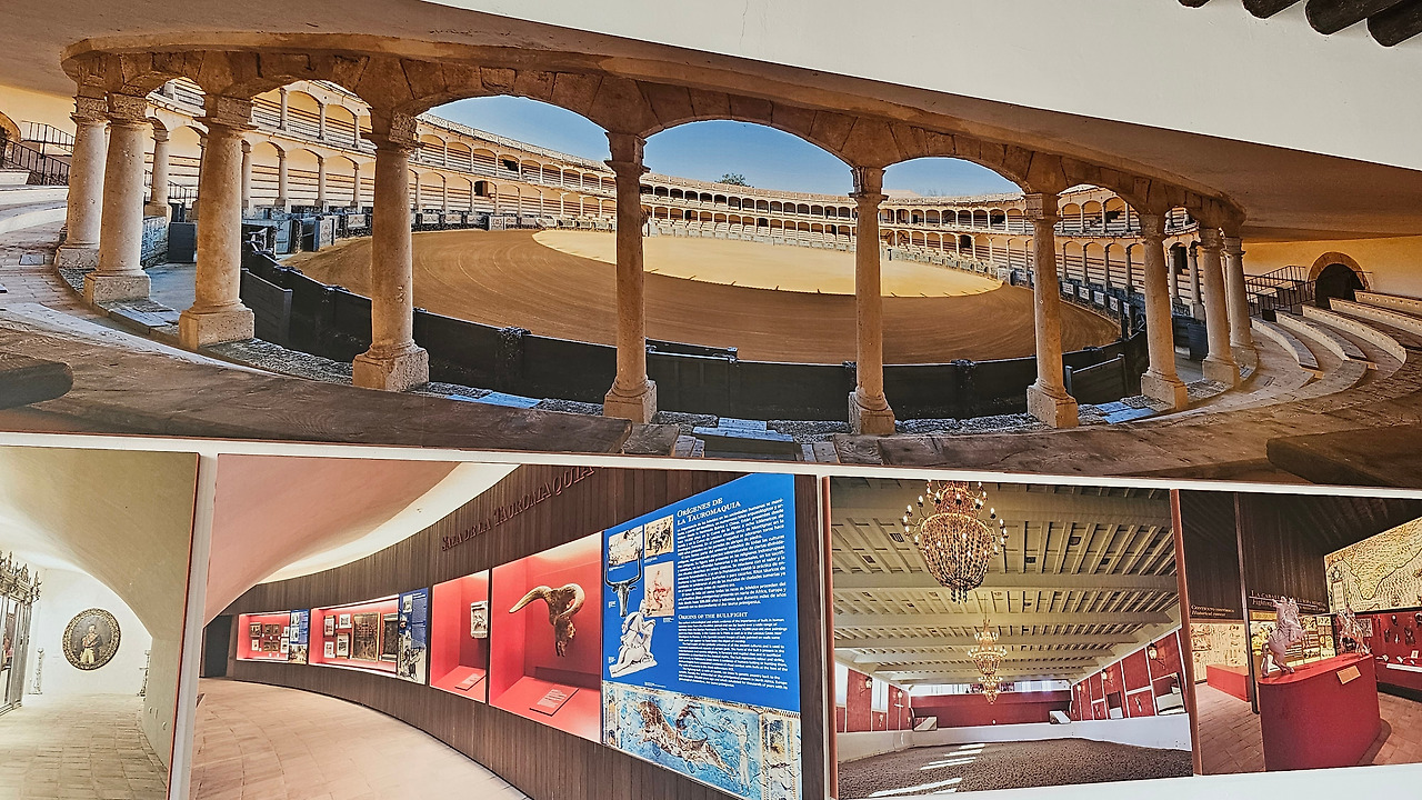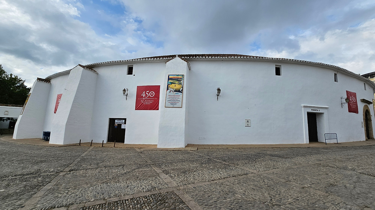 론다의 투우 경기장(Plaza de Toros de Ronda)은 지름이 66m(217피트)이고 두 개의 돌 고리로 형성된 통로로 둘러싸여 있다. 좌석은 두 겹으로 되어 있으며, 각각 5개의 높은 줄과 136개의 기둥으로 이루어져 총 68개의 아치를 이룬다. 투우장 정문의 디자인은 두 개의 토스카나 기둥과 바로크 양식의 테두리로 둘러싸인 스페인 왕실 방패가 특징이다. 정문은 말과 마차가 투우장에 들어갈 수 있을 만큼 크고, 문 위에는 투우 문화를 상징하는 철제 발코니가 있다. 대문에 황소 머리 모형의 대형 손잡이가 있다. 론다 시는 1485년 이래 스페인에서 가장 오래되고 고귀한 승마 기사단인 Real Maestranza de Caballería의 본거지이다. 투우장 건설은 1779년에 시작되어 1785년에 완료되었다. 협곡의 다리인 푸엔테 누에보와 엘 타호 협곡에서 약 2블록 떨어진 론다의 서쪽 가장자리에 있다. 투우장의 입구 주변은 정원으로 꾸며져 있다.