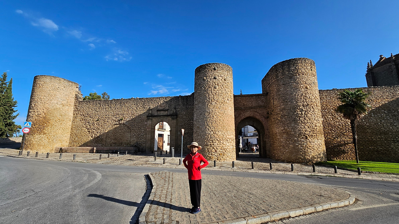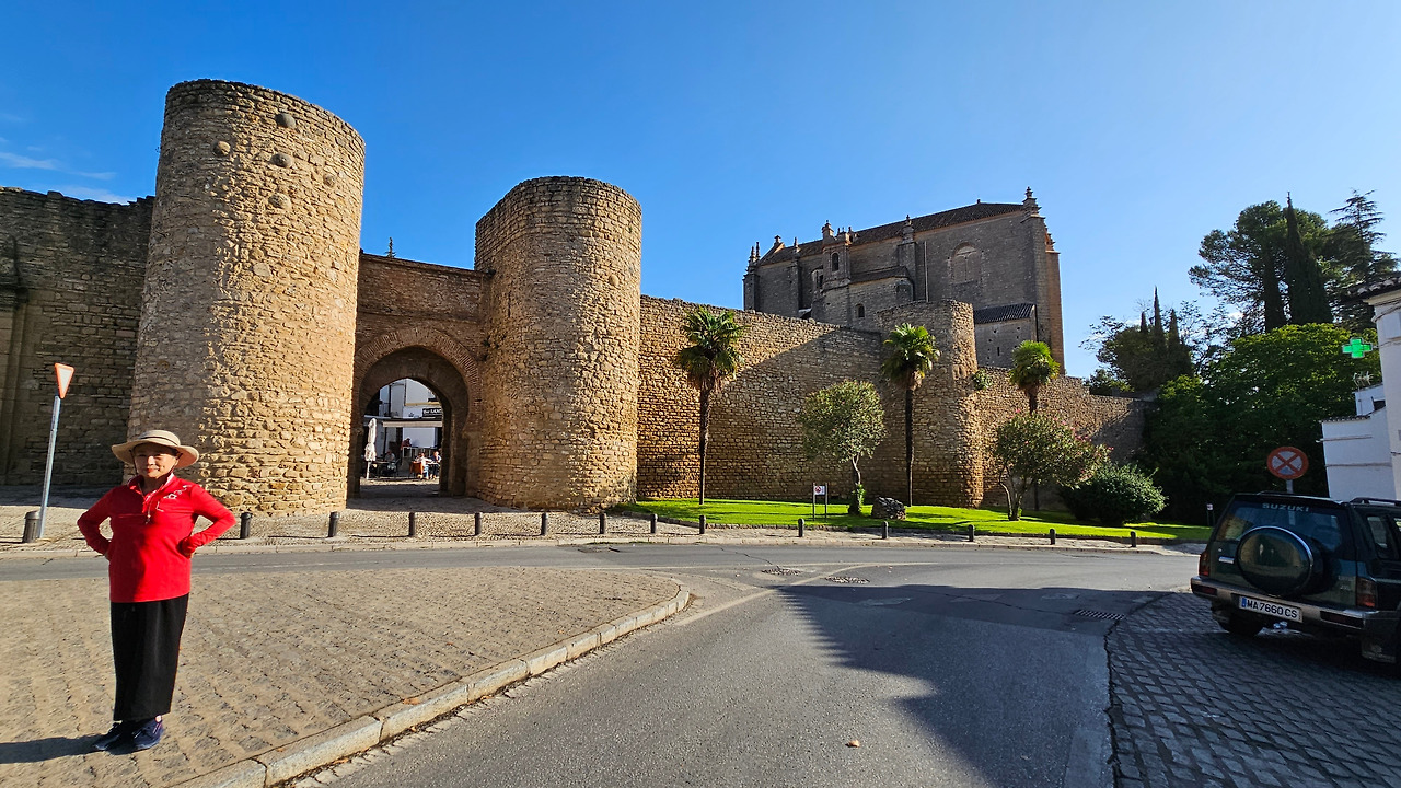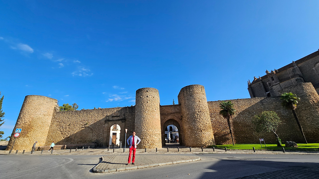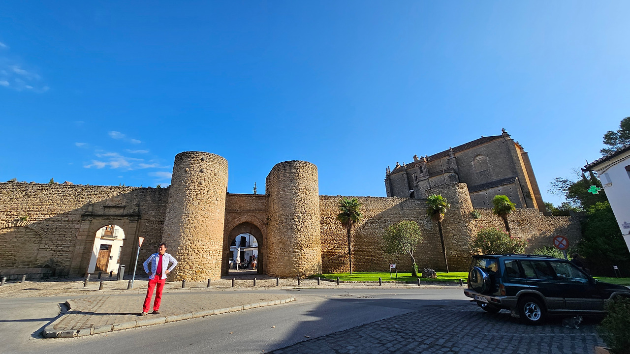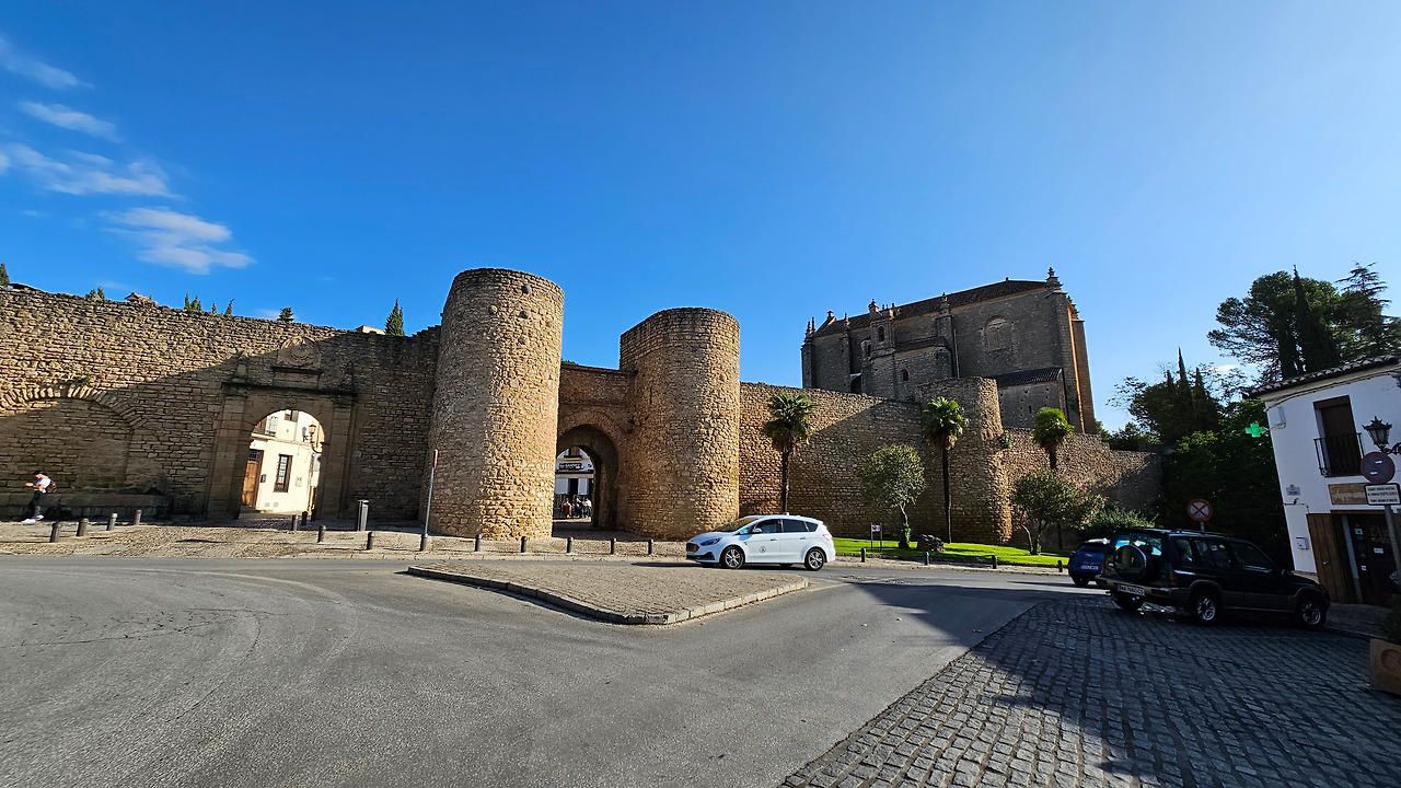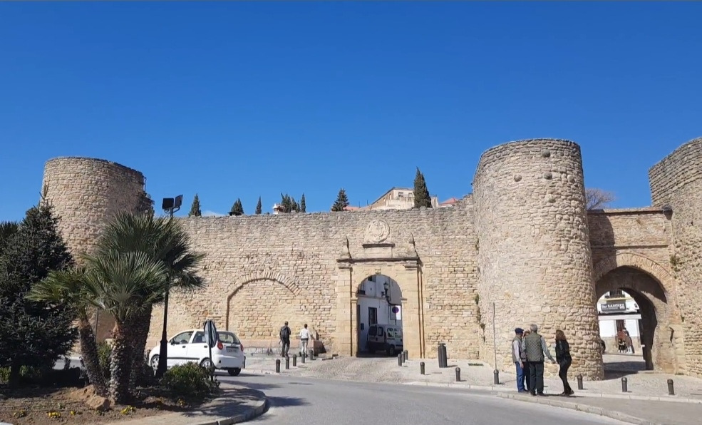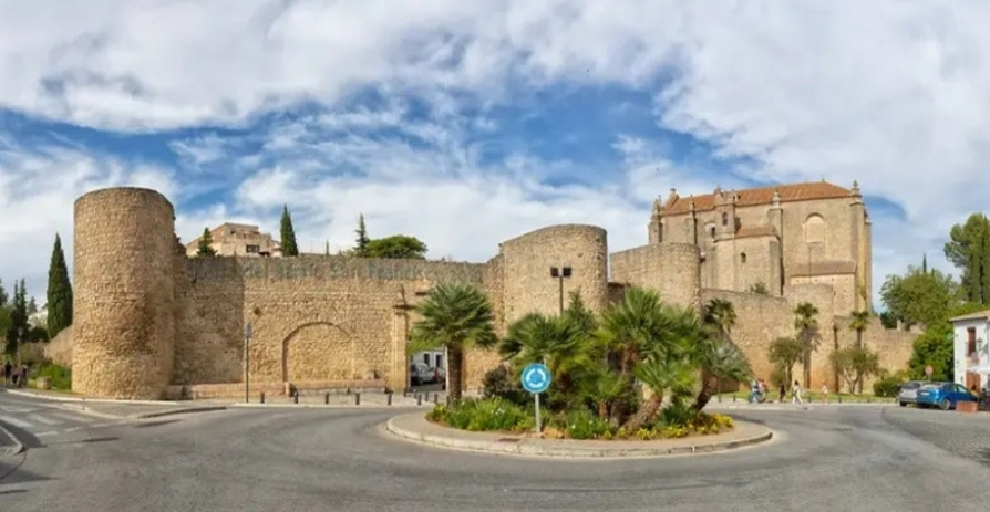 알모카바르 문(Puerta del Almocábar)은 론다 남부에 위치하며, 역사 지구와 연결되어 있다. 13 세기에 건설되어 카를로스 5세 시대에 개축되었단다. 세 개의 연속된 문과 두 개의 반원형 측면 탑으로 구성되어 있으며, 경비초소로 사용되었다. 이 도시의 이름은 옛 무슬림 묘지 근처에 위치해 있어 아랍어 "알마카비르(Al-maqabir)"에서 유래했다. 성문 맞은편, 도시 외곽에는 산프란시스코 광장이 있는데, 1485년 5월 20일 카디스 후작 휘하의 카스티야 군대가 이곳에 집결하여 이슬람 세력을 추방했다. 이로써 론다와 그 산맥에 대한 아랍의 지배는 사실상 종식되었다. 이 건축물은 르네상스 양식으로 지어졌고, 샤를 5세 황제 아퀼린 문장이 추가되었다. 1808년부터 1814년까지 이어진 반도 전쟁에서 나폴레옹이 스페인과 포르투갈을 침략하면서 론다의 요새 대부분이 파괴되었고, 알모카바르 성문 자체도 완전히 폐허로 남았다. 사실, 성문은 1960년대에 이르러서야 현재의 모습으로 복원되었다.