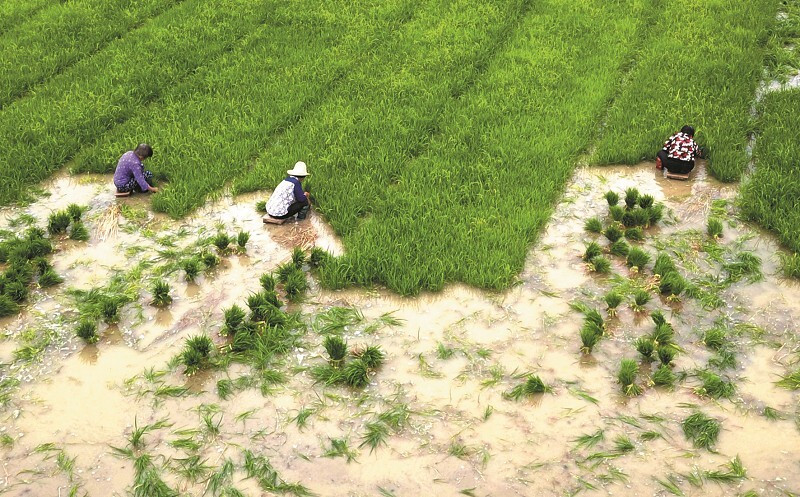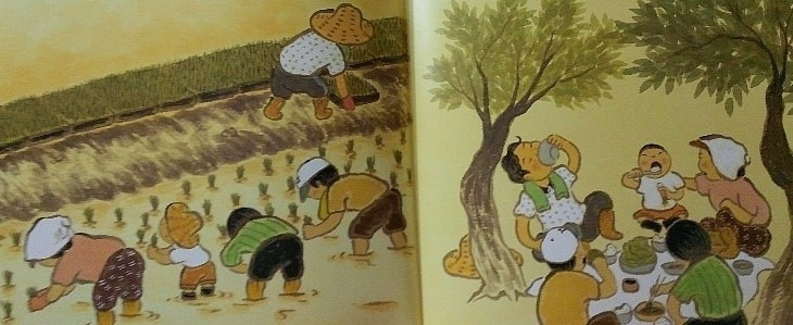 필자가 어릴 적에는 농경지가 반듯하게 정리가 되지도 않았고, 높낮이도 달랐으며, 더구나 농기구가 보급되지 않아서 농사는 모든 걸 농부의 손으로 할 수밖에 없었다. 논밭을 갈 때 소의 힘을 빌려서 쟁기로 갈고, 모를 심기 위해 논에 물을 대서 써레질을 할 때만 소의 힘을 빌리고 나머지는 그야말로 온몸으로 고생을 해야 쌀 한 톨을 수확할 수 있었다. 요즘이야 경지 정리가 되었고, 트랙터, 이앙기(移秧機), 콤바인 등 농기계를 활용하여 손쉽게 농사를 지을 수 있지만 그 시절의 힘든 모내기를 추억하며 이 시를 지었다. 모내기 날이면 동네 사람들을 불러 모아서 공동으로 작업을 했다. 모판에서 어린 모를 뽑아서 모내기할 논에 못줄을 튕겨 놓고 여럿이 일렬로 늘어서서 각자의 맡은 간격 사이를 좌우로 왔다 갔다 하면서 모를 심는다. 한 줄을 다 심으면 다시 못줄을 뒤쪽으로 일정한 간격으로 옮겨 다시 그런 작업을 하는 것이다. 이렇게 농부들이 좌우로 움직이는 모습이 마치 게걸음 치는 것 같다고 묘사한 것이다. 힘든 일을 할 때는 으레 농요(農謠)를 부르면서 힘든 과정을 견디었다. 힘든 일을 할 때는 배도 쉬 꺼지므로 새참을 자주 먹게 되는데, 이때 막걸 리가 농주(農酒)로서는 최고였다. 커다란 고무 다라이(일본말인데, 盥)에 음식과 반찬, 그릇, 수저들을 담아 보자기로 덮어서 여인들이 이고, 한 손에는 물주전자와 다른 손엔 술주전자를 들고 들녘에 가져와서 모두 둘러앉아 참을 먹는 것이다. 어릴 때 그 맛이 꿀맛 같았던 기억이 요즘 등산이나 야외에 나가서 싸 온 도시락을 먹는 기분과 비슷하리라. 모내기는 해가 저물 때까지 이어지고, 어두워지는 논들에서 손발에 묻은 진흙을 씻어내고 남은 막걸리로 목을 추이며 한해의 풍년을 기원하는 농부들의 간절한 소망이 느껴진다.