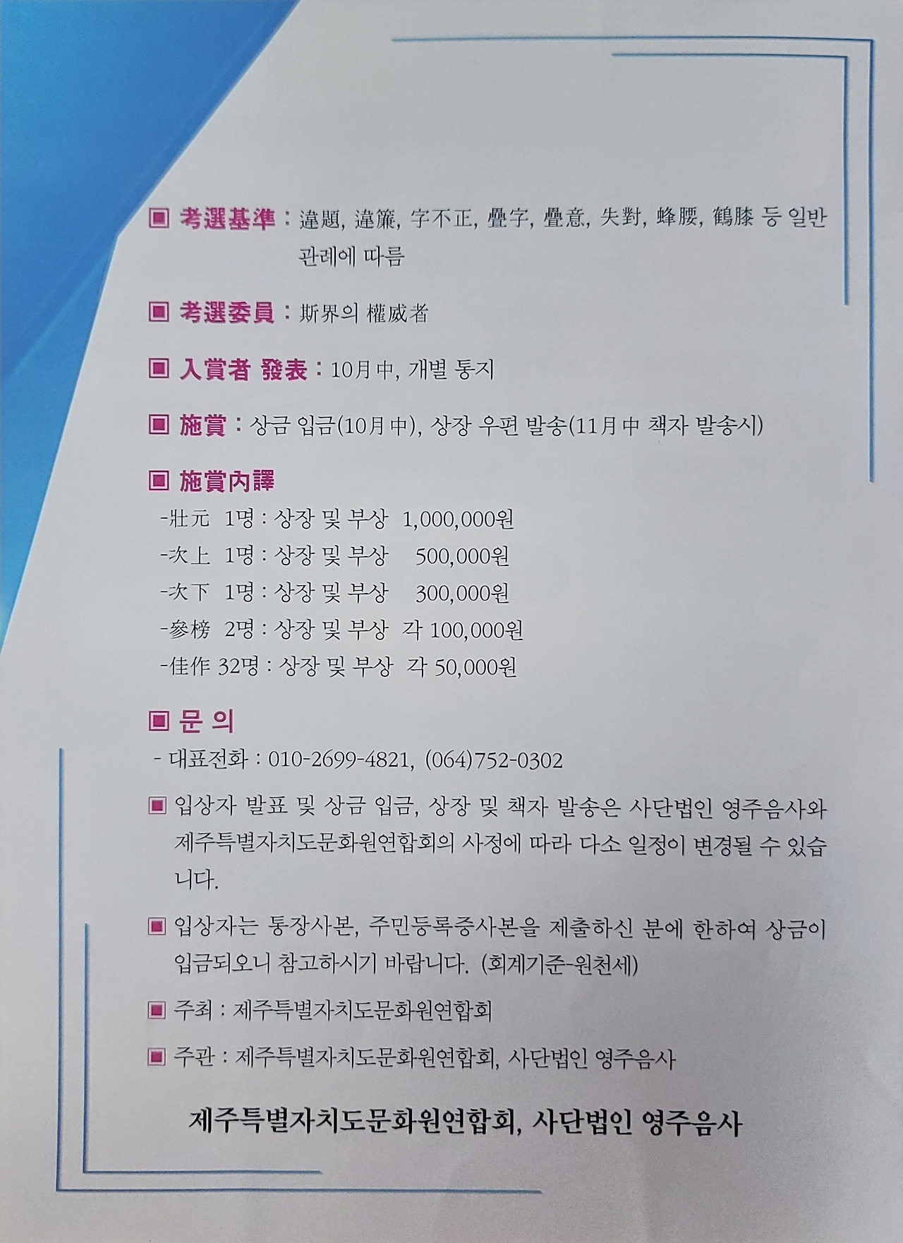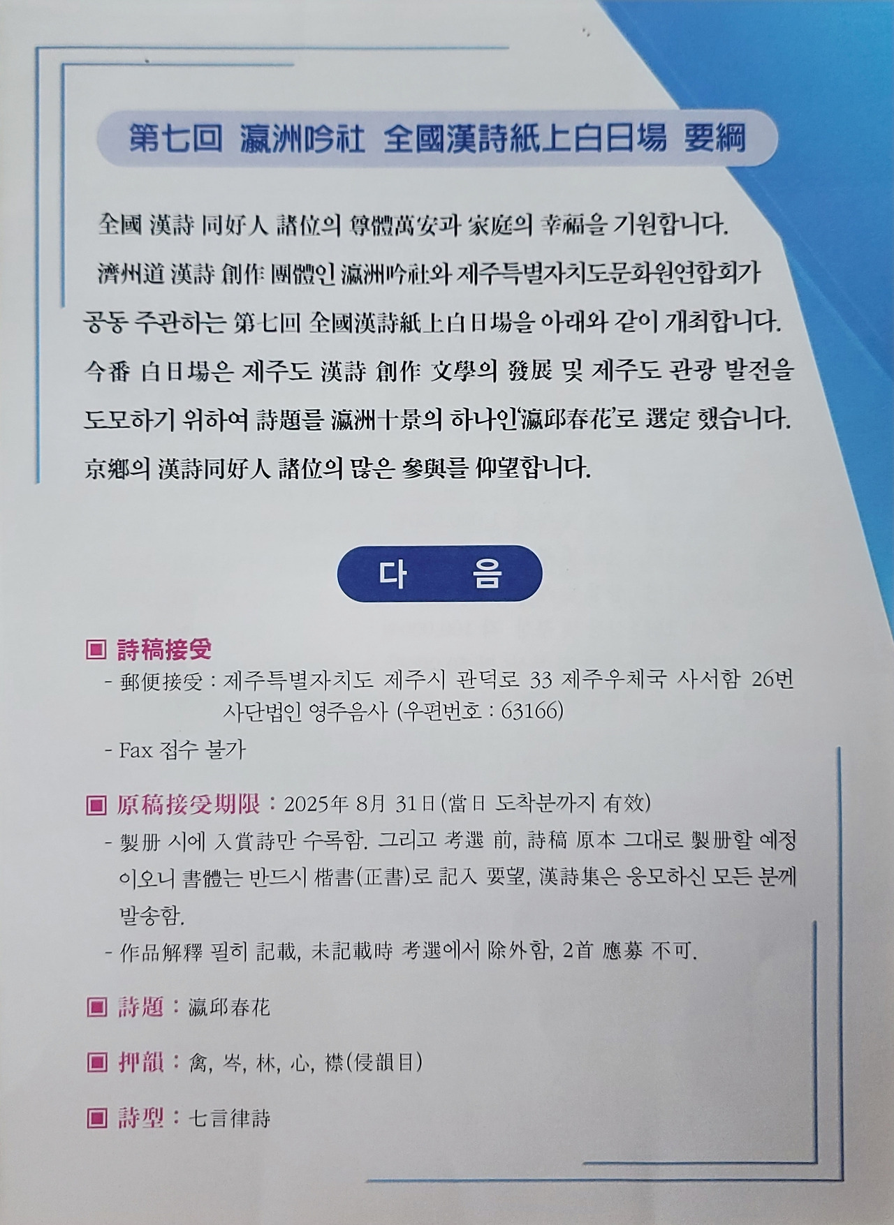 이 시는 제주의 영주음사(瀛洲吟社)에서 주최하는 제7회 전국 한시백일장에 출품하려고 작시한 것이다. 시제(詩題)는 瀛邱春花(영구춘화) 즉 제주시 영구의 봄꽃을 읊는 것이다. 영구(瀛邱)는 제주시 오라동 근처 한라산 기슭에 있는 방선문(訪仙門)이라는 곳의 별칭으로, 이곳에 봄꽃이 피면 제주 10경 중에서 제3경에 해당할 정도로 아름답다고 알려졌다. 옛날부터 시인묵객들이 즐겨 찾아서 시를 쓰고 시와 글을 바위에 새겨 놓은 유적이 많다고 한다. 압운(押韻)은 금(禽)·잠(岑)·림(林)·심(心)·금(襟)이다. 이번 백일장에는 전국에서 400여 명이 참가하였는데, 필자 금삿갓은 4위인 참방(參榜)에 입선을 했다. 올해 들어서 4번째의 수상이라서 기쁘다. 다만 실력이 아직 미흡하여 장원을 노려볼 수 없는 것이 안타깝다. 이번에는 장원 1, 차상 1, 차하 1, 참방 2, 가작 32명을 선정했다고 한다.