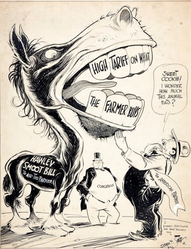 1920년대 미국 산업은 기술혁신과 보호관세의 시너지로 승승장구했다. 자본이익률(ROE)은 43% 상승했고, 실업률은 4% 이하로 떨어졌다. ‘포효하는 1920년대’로 불린 이 시기, 미국 경제는 전례 없는 호황을 구가했다. 이재명 정부 집권 후 경제가 침체인데도 코스피 지수가 급격 상승하듯이 다우존스 지수가 1928년 이후 16개월간 90% 폭등하며 주가도 고공비행을 이어갔다. 하지만 관세의 부과와 성장의 과실은 산업 자본가와 도시에 집중되었고, 소외된 농업 경제는 추락을 거듭했다. 1928년 대선에서 승리한 허버트 후버(Herbert Hoover) 대통령은 지지층인 농민을 위한 대책 마련이 시급했다. 그는 1930년 스무트-홀리(Smoot-Hawley) 관세법에 서명하여 세율은 59%로 치솟았다. 이미 미국의 고율 관세에 불만을 품고 있던 유럽과 캐나다는 즉각 반발해 보복 조치에 나섰다. 프랑스는 자동차에 100%, 스페인은 수입품에 모두 40%, 독일과 이탈리아는 밀에 관세를 부고하고 또한 수입 쿼터로 맞섰다. 그러자 미국의 수출은 30% 급감했고, 세계 교역량은 관세 인상 후 3년 동안 75%나 줄었다. 전 세계를 대공황으로 몰아넣은 교역 붕괴는 관세 인상 그 자체보다, 각국의 보복에서 비롯된 결과였다. 하딩 시절의 관세 인상에는 참고 넘겼던 유럽 각국이, 자존심이 상하자 전면적인 보복으로 응수했고, 그 파장은 세계 경제 전체를 뒤흔들었다. 세계 무역이 약 3분의 2 감소하자 이는 수출에 의존하는 산업의 침체와 실업률의 악화로 대공황의 여파를 더욱 심화시켰다.