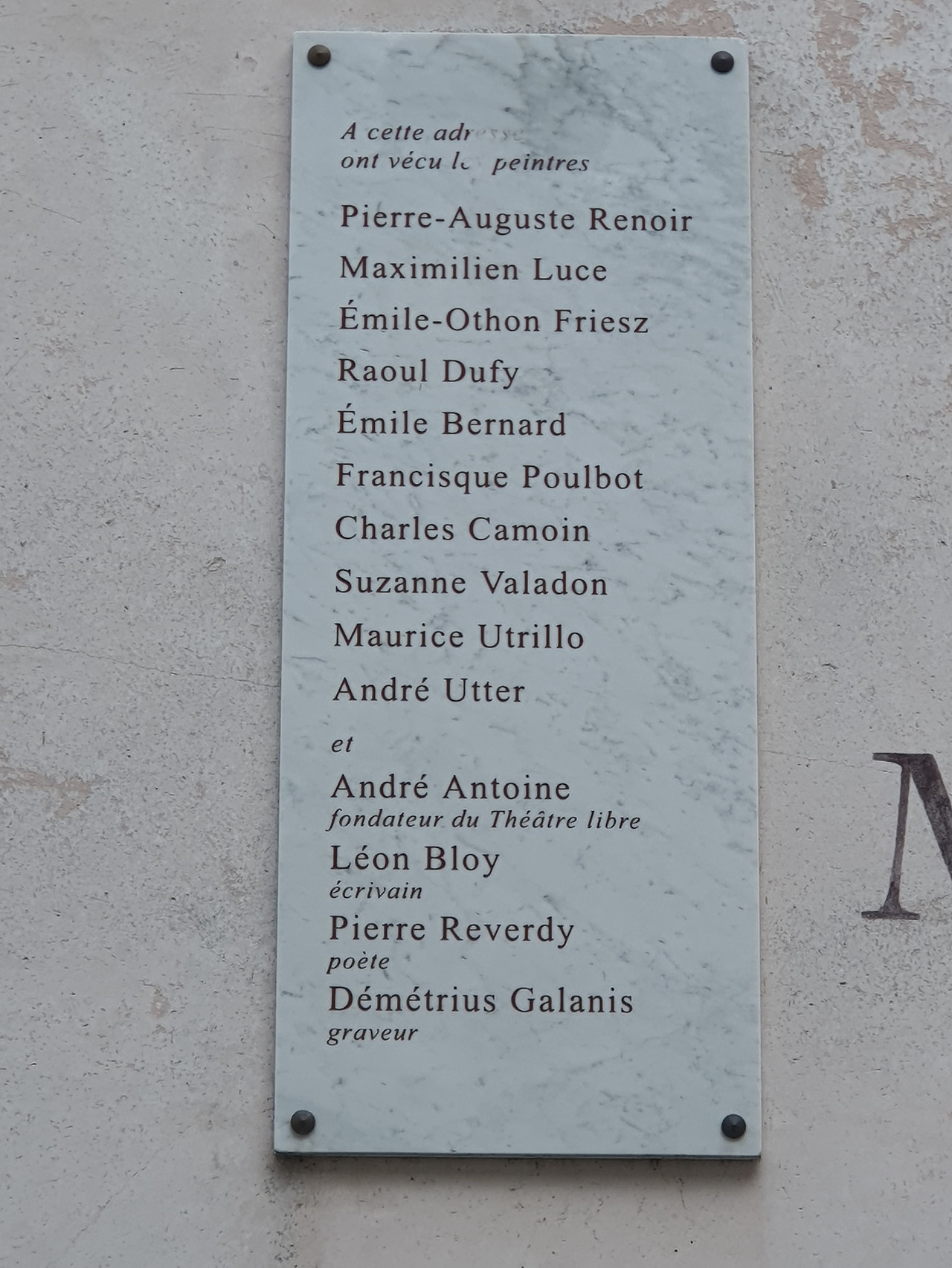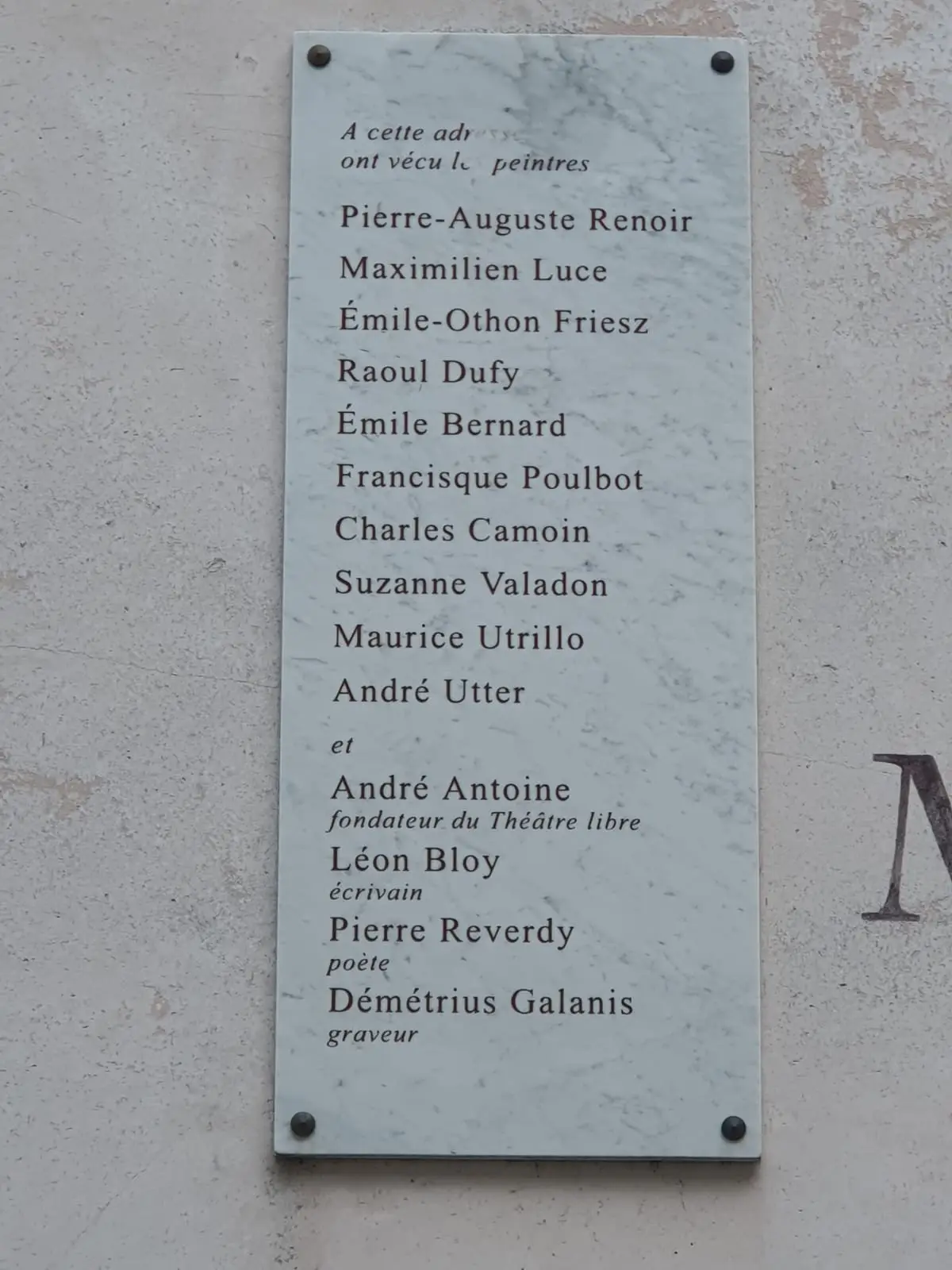 몽마르트르 언덕에 아직 포도원이 있는데, 그 옆쪽 골목으로 내리막길에 이곳 분위기와 아주 잘 어울리는 연한 핑크색인지 주황색인지 잘 구분이 안 가는 모서리 삼각형 모퉁이 집이다. 이 집에는 그 시절 어려운 시기를 보내던 화가 르누아르, 툴르즈 로트렉, 드가 등 수많은 예술가들의 모델이자 정부(情婦)였던 쉬잔 발라동(Suzanne Valadon)이 같이 살았다. 내부에 들어가면 쉬잔 발라동의 사진이 곳곳에 걸려 있다.