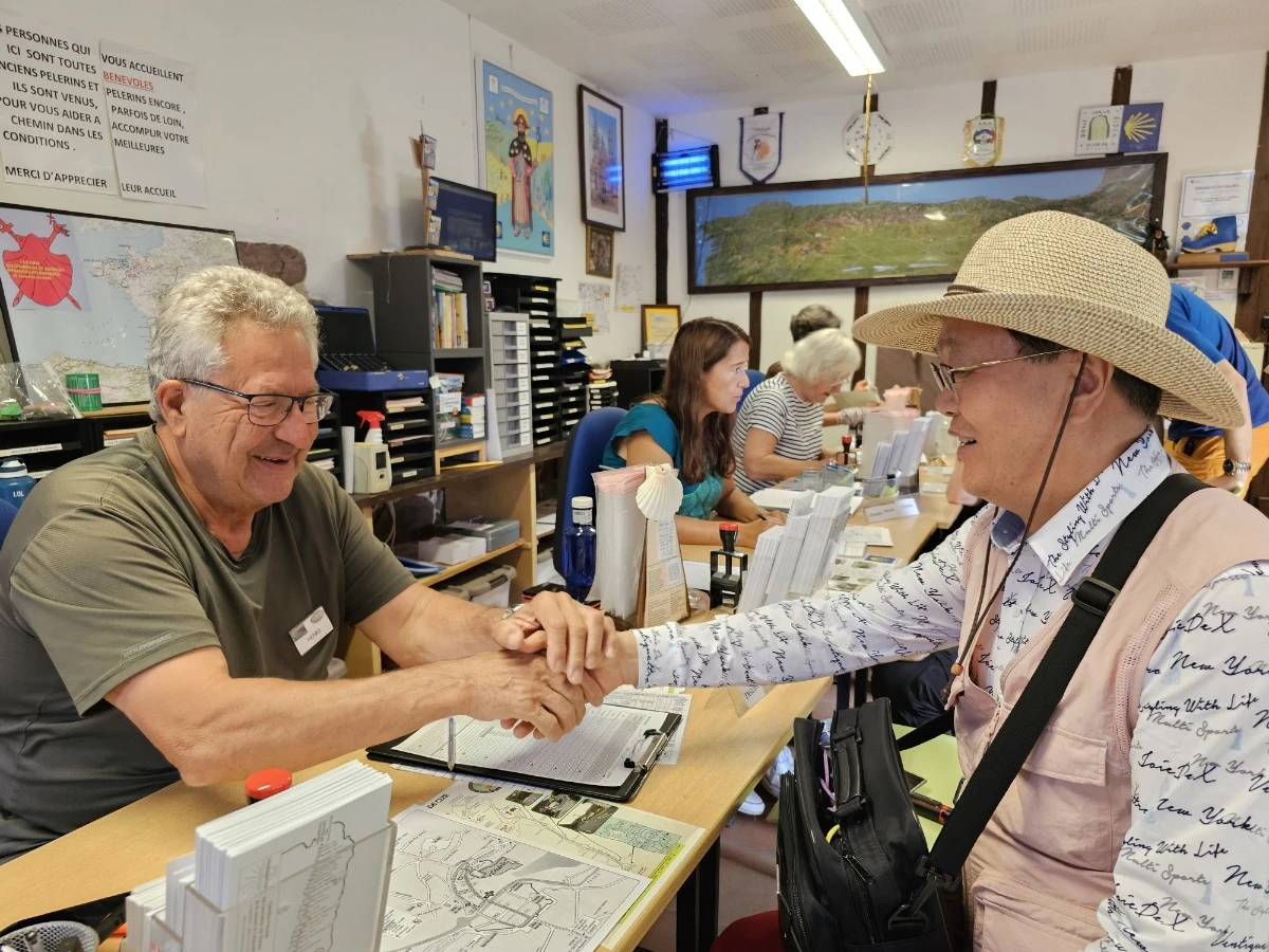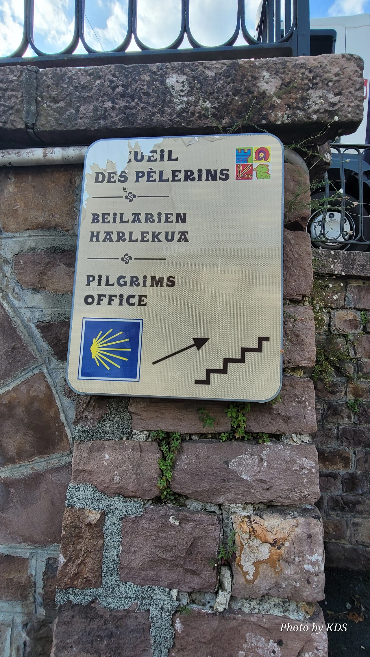 순례길을 걷자면 순례객안내소에서 등록을 하고, 크레덴셜(Credential)이라는 순례자용 여권 같은 것을 발급받아야 한다. 이 여권에 순례자가 들리는 곳마다 입국 스탬프 즉 세요(Sello)를 받게 된다. 이것이 최종 목적지에서 순례객이 빠짐없이 완주를 했다는 증거서류이다. 그리고 순례자 표식인 조개껍데기도 하나 사서 매달아야 한다. 모든 수속을 마치고 내 배낭의 무게를 천정에 걸린 저울에 달아보니 11kg으로 나온다. 자원봉사자인 프랑스인 할아버지가 너무 무거울 거라 충고한다. 내 인생의 무게라고 웃으며 대꾸했다. 그는 지도를 펼쳐 보이면서 지금 부터 오늘의 종착지인 론세스바예스까지 가는 길을 열심히 설명해 주었다. 프랑스 순례길의 시작점인 이곳에서 피레네 산을 넘어가는 길이 크게 두갈래란다. 하나는 시세(Cize) 언덕길 또는 나폴레옹길이고, 생장 마을의 스페인 문에서 150m 정도에 갈림길이 나오면 좌측으로 올라가는 코스이다. 이 길은 총 길이는 25Km로 짧지만 최고 고도가 1,410m인 뢰페데르 언덕을 넘어야 하는데 걸으면서 주변의 풍광을 즐기는 재미가 더 좋다고 한다. 특히 이 코스는 중간에 알베르게와 쉼터인 푸드 트럭 등이 있단다. 1809년에 스페인을 침략한 나폴레옹의 군대도 이 길을 넘었다. 다른 하나는 발카를로스(Valcarlos) 길이다. 총 길이는 27km로 더 길지만 최고고지가 1,040m로 약간 낮다. 주로 계곡을 많이 이용하기에 전망이 별로이고 주로 자전거 순례객들이 이용한단다. 피레네의 기상은 피레네 여신 밖에 다른 사람은 예측 불가능이란다. 멀쩡한 날씨라서 별로 주의 를 기우려 듣지 않았다. 그랬더니 나중에 물에 빠진 생쥐 꼴이 되었다.