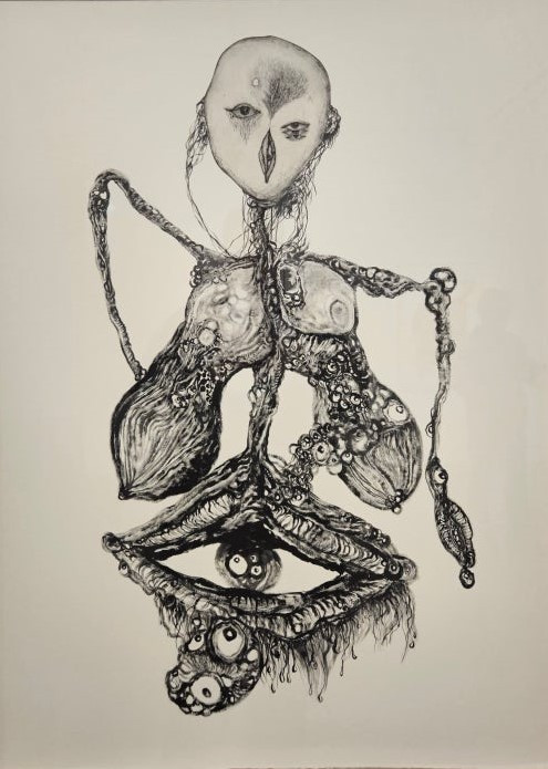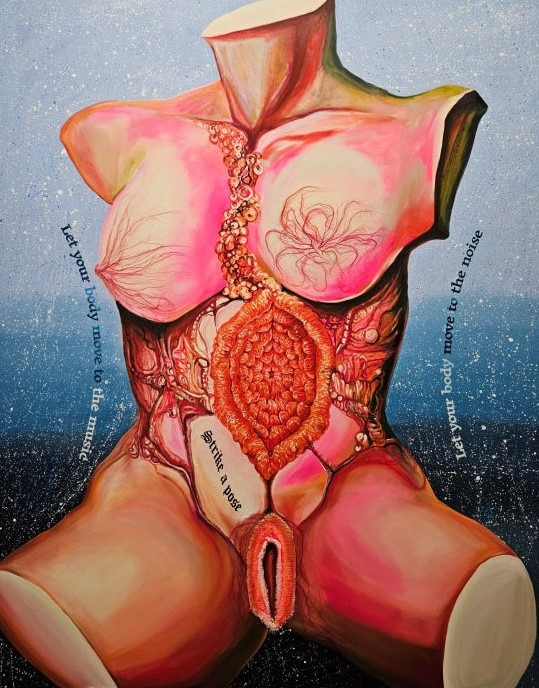 다음은 <Torso - The Holy Portal>이다. 토르소는 그리스 로마 시대의 조각품 중 머리와 팔다리가 잘려나간 몸통만의 아름다움을 강조한 조각품들이다. 그러다 보니 소수의 여성 토르소도 있지만 대부분 남성상의 토르소가 주류를 이룬다. 울룩불룩한 식스팩의 근육을 자랑하는데 비해 조금은 형편없이 축소된 남성 성기을 달고 있는 조각말이다. 이 여성 몸통 그림은 괴물적 여성, 절단·변형된 ‘그로테스크’ 한 여성 나신을 해체적으로 보여준다. 하지만 여성의 신체는 외부의 환경에 미세하게 반응한다. ‘음악’에 노출된 반쪽은 젖가슴이 흥분으로 팽창되고, 모든 신경세포의 연결조직과 유선(乳腺)들이 하나의 꼭지점인 젖꼭지로 집중되어 오뚝하게 발기되는 것이다. 그러나 ‘잡음’에 노출된 다른 한쪽은 전혀 즐겁지도 흥분되지도 않는다. 유방의 신경조직과 유선들은 제멋대로 흩어지고 산발적으로 움직인다. 프랑스 철학자 줄리아 크레스테바(Julia Kristeva)가 더럽거나 불결한 오브젝트(Abject)가 혐오감을 유발하지만 오히려 인간에게 호기심을 불러일으킨다고 했던가? 은밀히 포장되어 있어야 할 여성 성기는 마치 무한한 유혹과 비밀을 감춘 채 커다란 입을 벌리고 있는 동굴 같다. 이 정도면 문정희 시인의 <치마> 정도로는 감춰질 수 없는 심연의 본능에 가깝다.